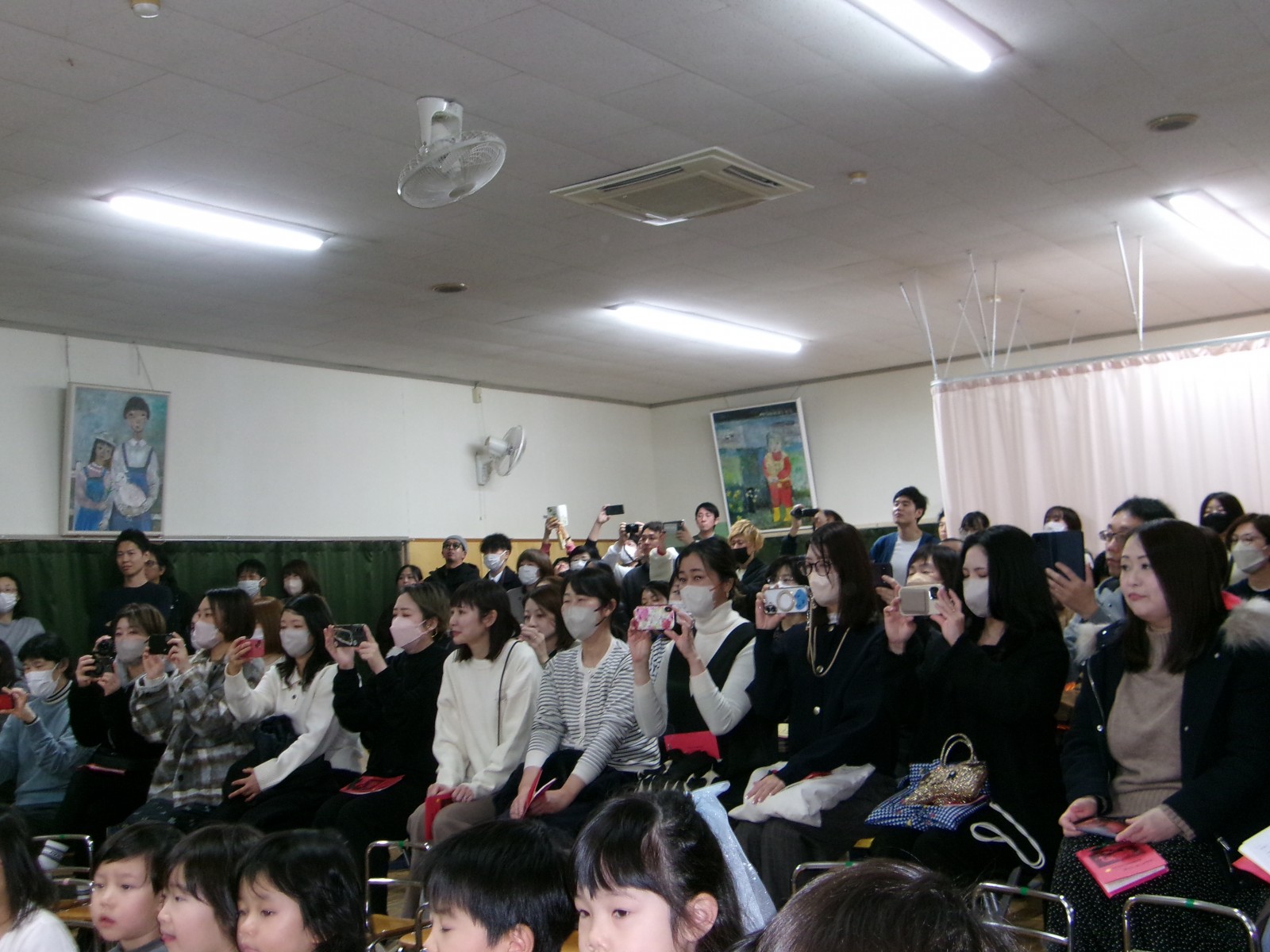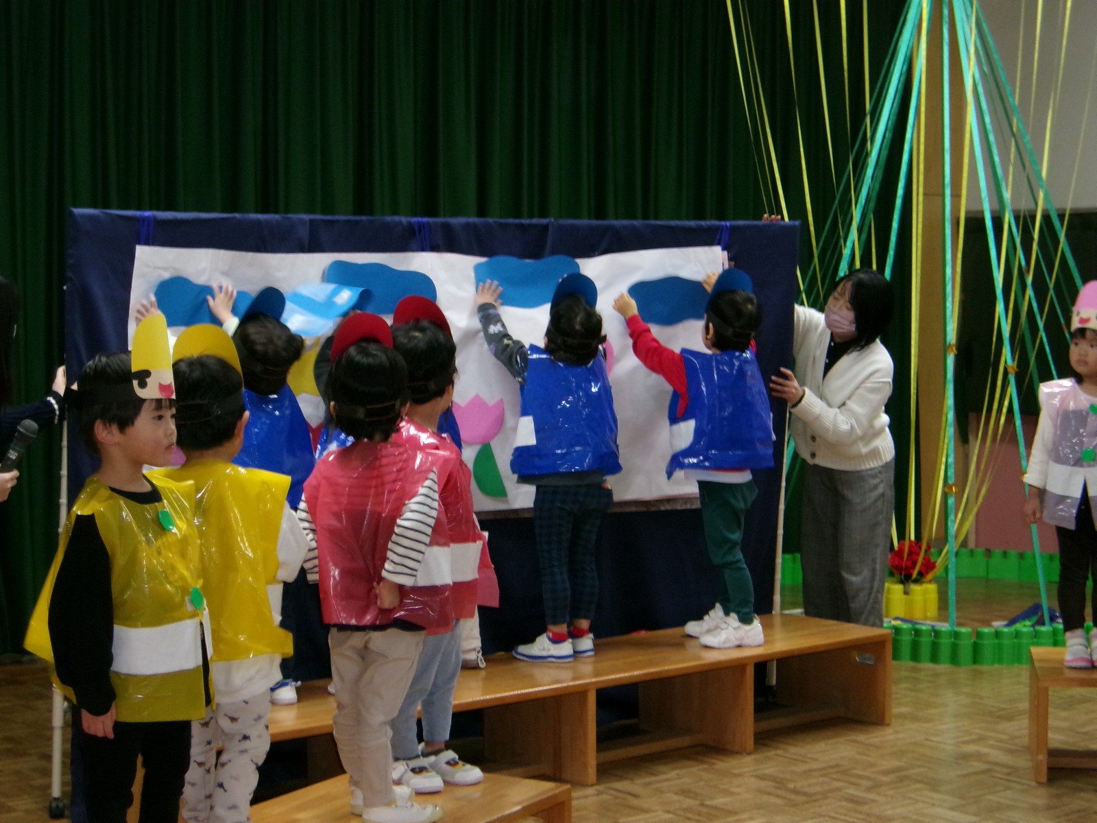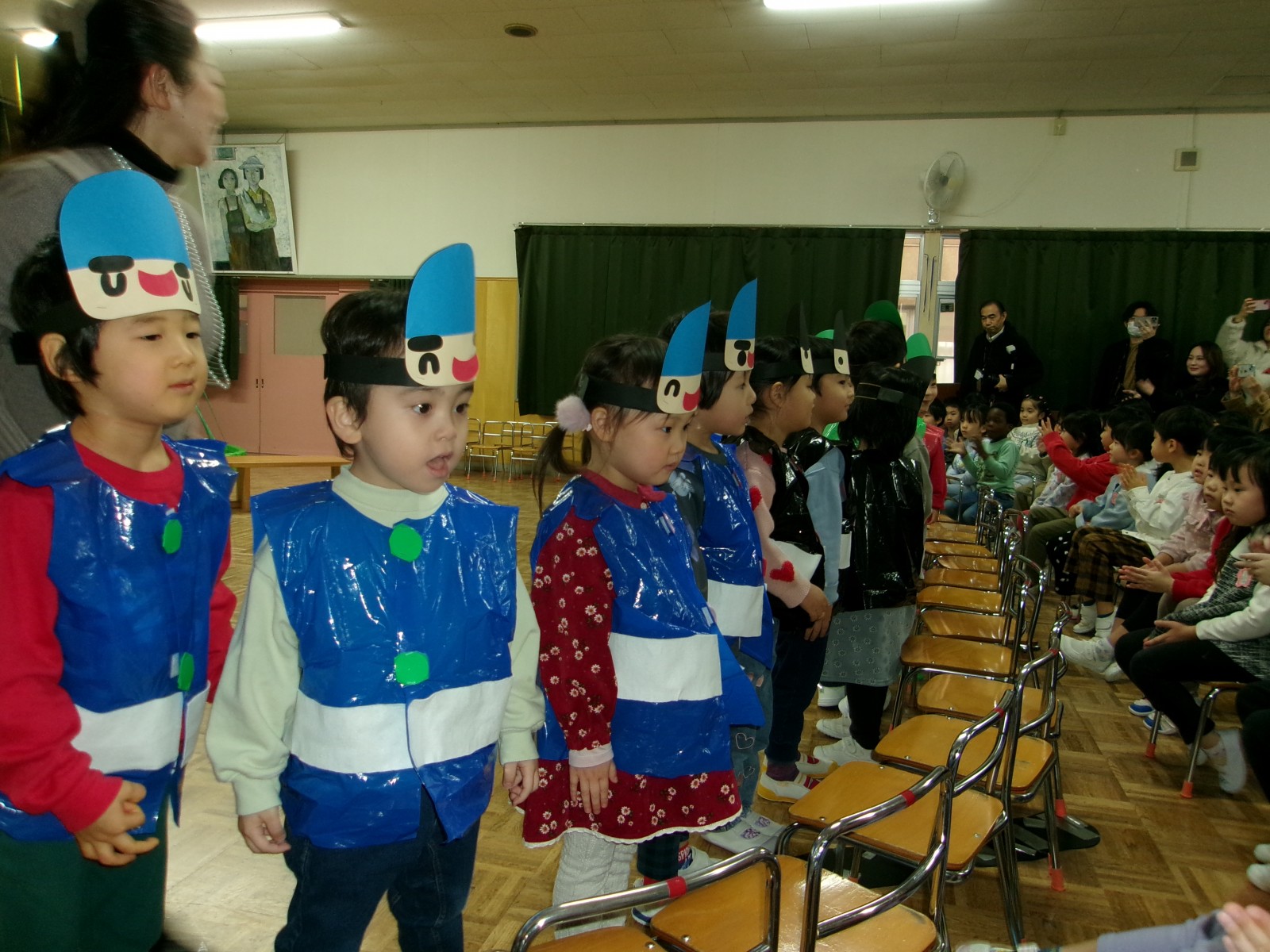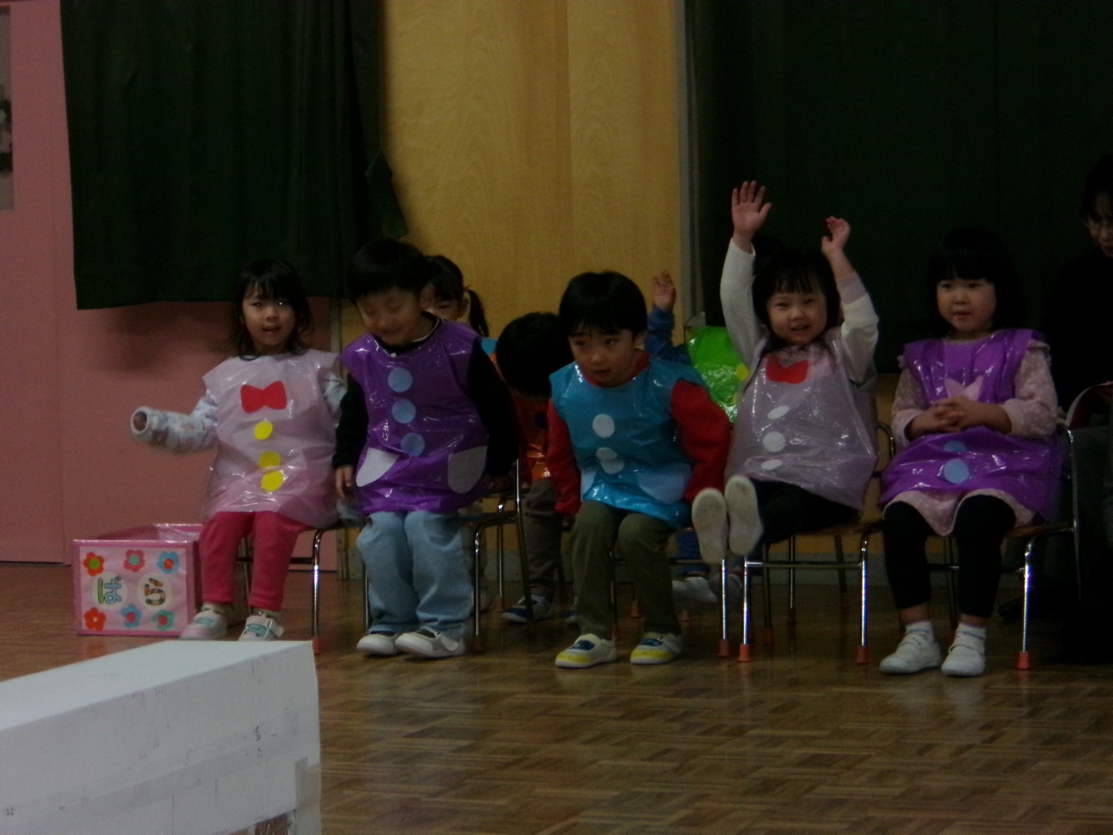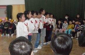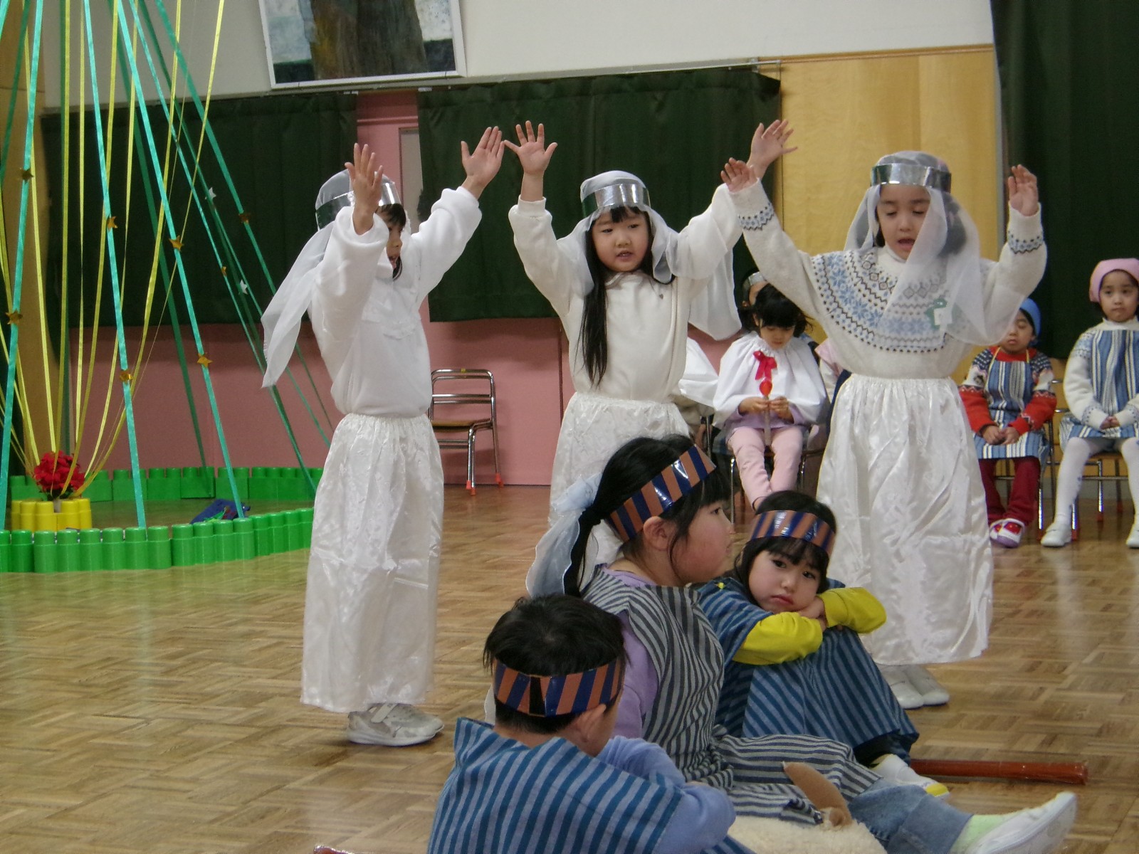 祝会第一部は、すみれ組さんの劇「くれよんのくろくん」、ダンス「サンタが町にやってくる」、ばら組さんの劇ごっこ「いただきまーす!ごはんのマーチ」、合奏「♪メリークリスマス」はどれもすべて元気いっぱい上手に発表できました。みんなが劇も歌も大好きで仲良く楽しんでいることが伝わってきました。