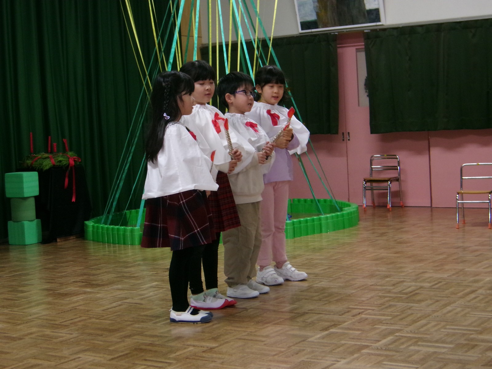 礼拝は、園長先生の司会で、アドベントクランツに4本目のろうそくが灯り、黙祷、讃美歌「うるわしき朝も」、お祈り、聖書、讃美歌「空にひびく鐘が」、お話、献金、讃美歌「もろびとこぞりて」をみんなで守りお捧げしました。