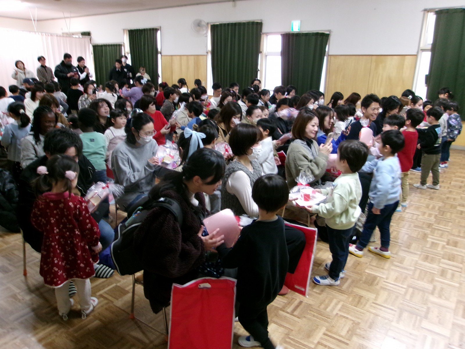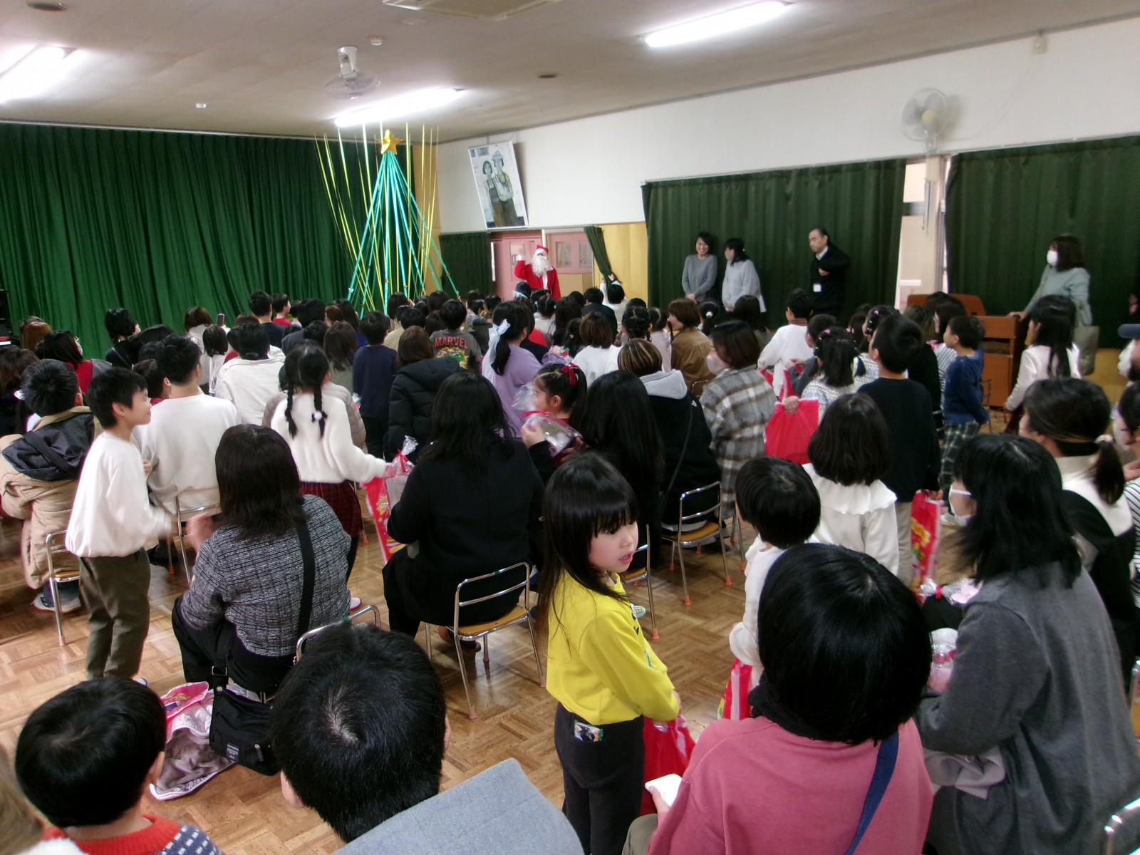 祝会第二部は、贈り物の交換をしました。子ども達から手作りの作品をお家の方へ、お家の方から子ども達へのプレゼント、幼稚園から子ども達へのプレゼントはサンタクロースが届けてくれました。お家の方から先生方へのプレゼントもありました。