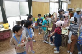 組ごとに用意した、子ども達と先生の手作りの作品のプレゼントの紹介がありました。そのプレゼントとお家の方からの贈り物として用意したプレゼントを親子でおめでとうと言って交換しました。