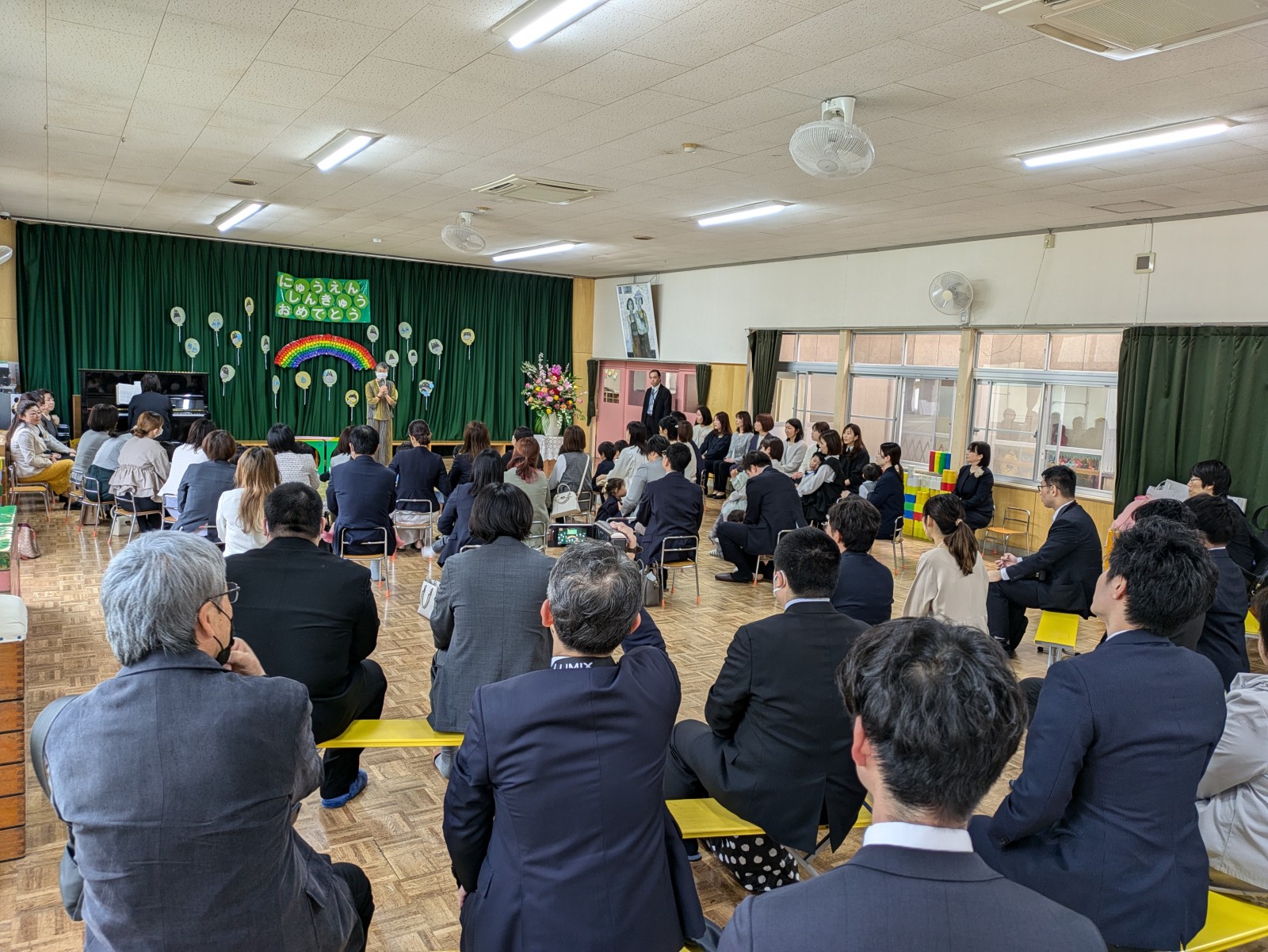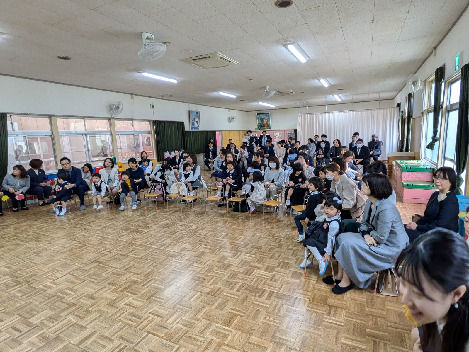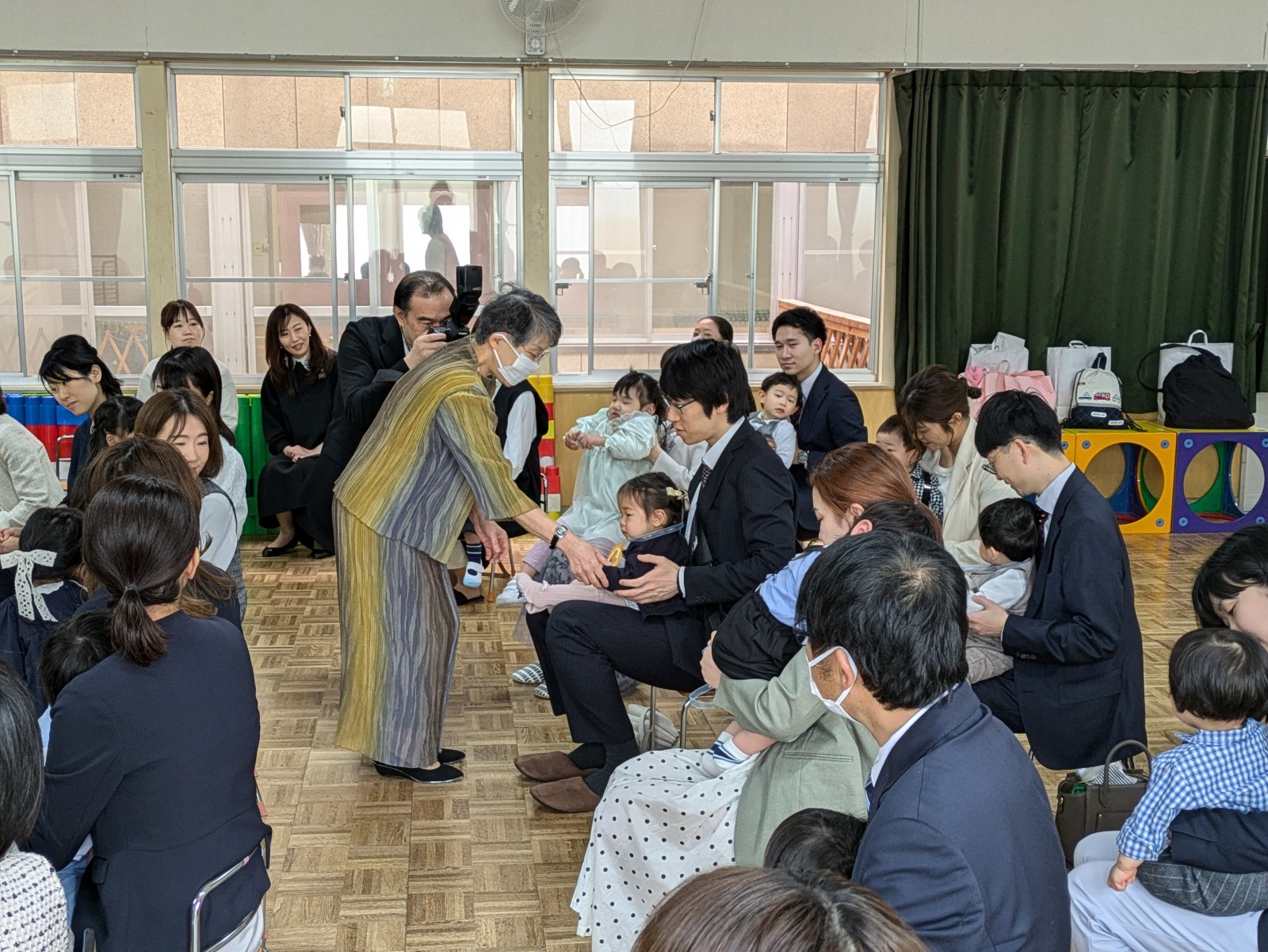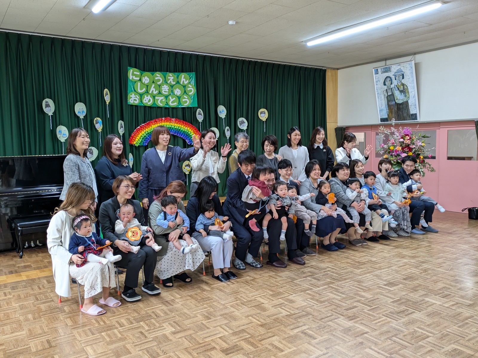 保育園の0歳(つぼみ組)1歳(さくらんぼ組)2歳(いちご組)と幼稚園の3歳(すみれ組)に新しく入るお友達と、保育園からすみれ組に進級するお友達もみんな一緒に大勢で賑やかながらも和やかなひと時でした。