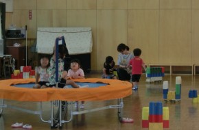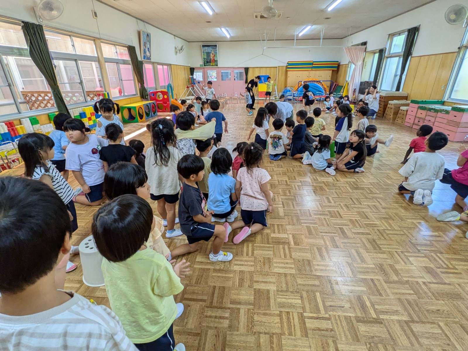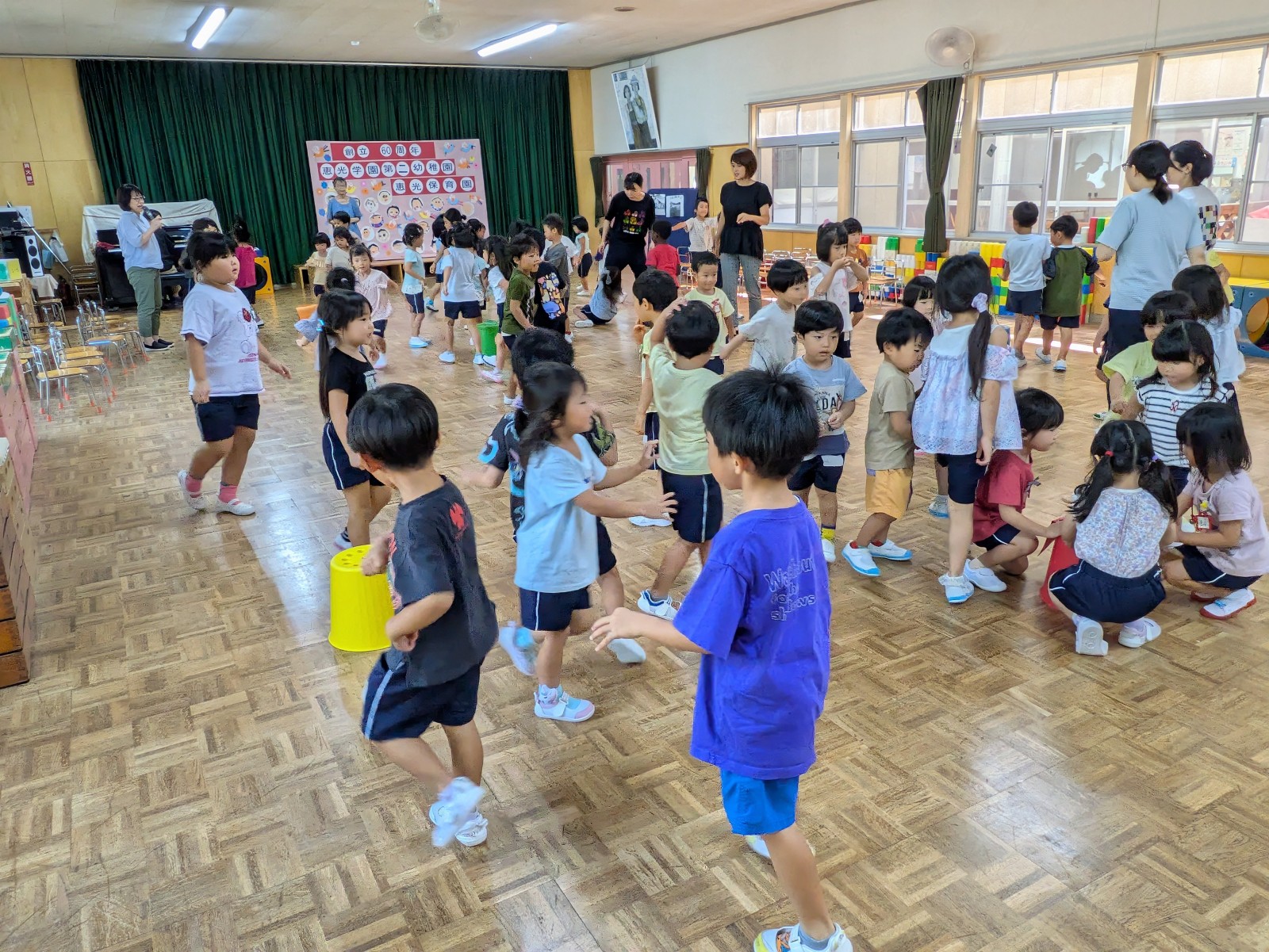 それからみんなで「幼稚園ゲーム」を楽しみました。ホールに各色のコーンを立てて幼稚園の各部屋に見立てました。みんな自由にお散歩をして、ピアノが鳴り終わったら近くの部屋(コーン)に集まります。 先生が各色のさいころをふって出た色にいた人たちが勝ちになるゲームです。どこの色に集まるか、何色のサイコロが出るかみんな大盛り上がりで楽しみました。