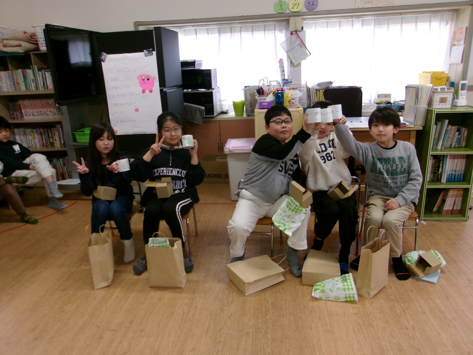 ·3年生へのプレゼント(本人手描きのマグカップと1. 2年生と支援員からのメッセージカードのアルバム)