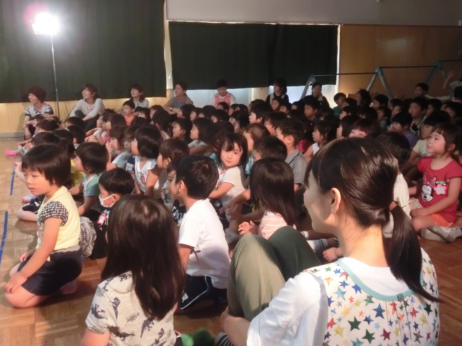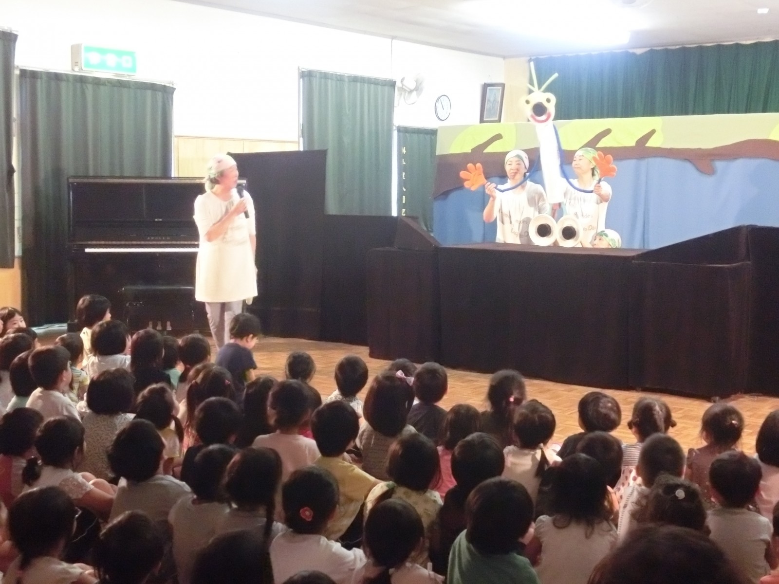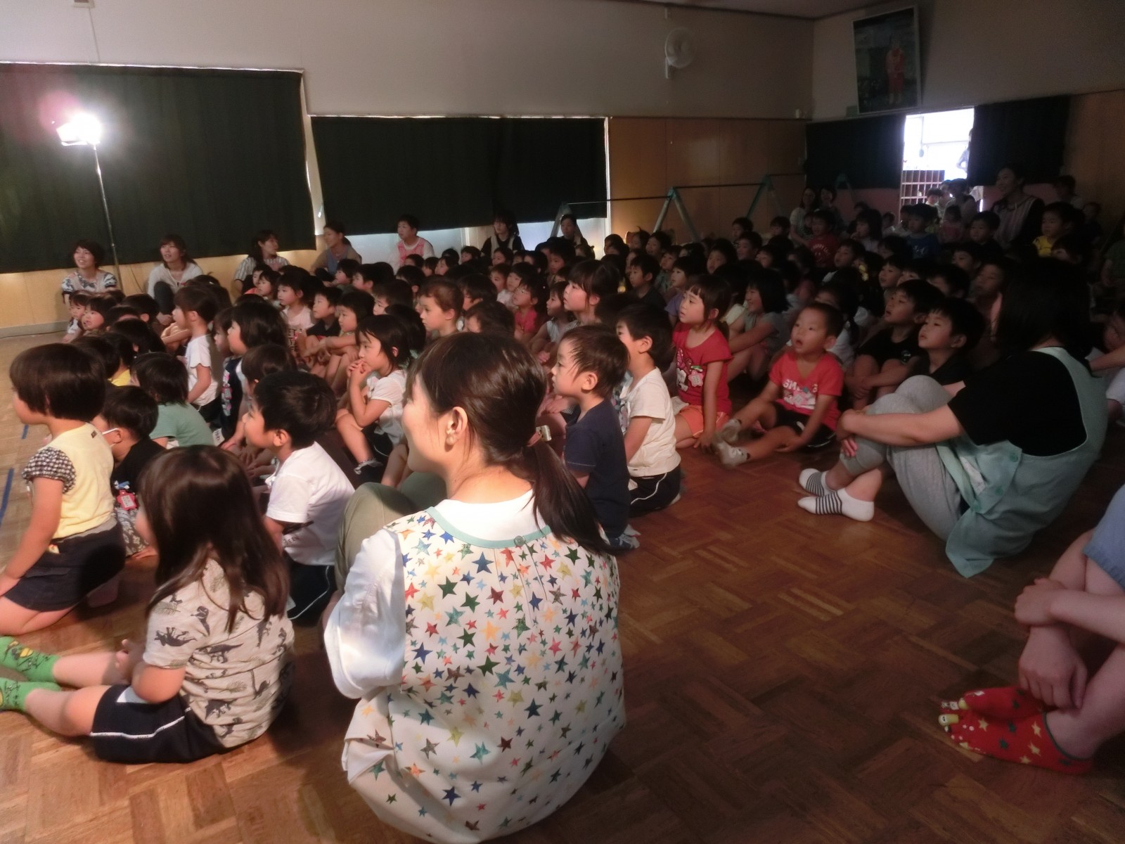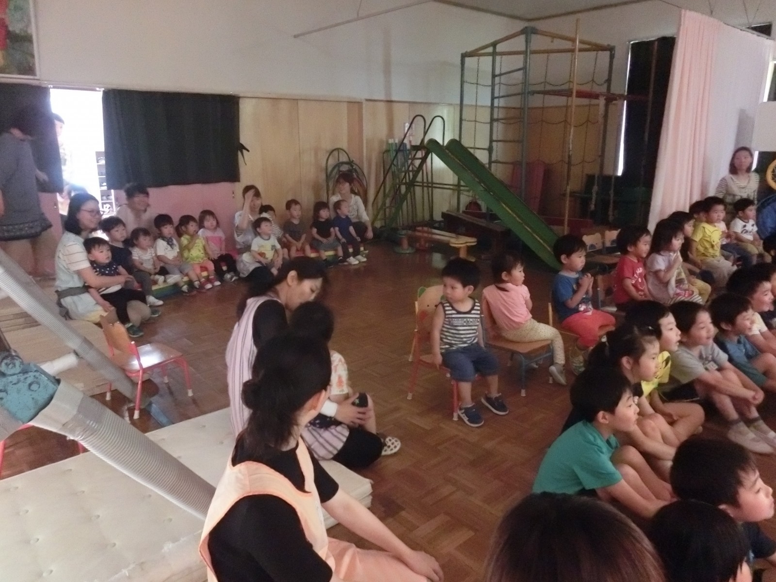 6月19日に第1園のお友達が第2園に集まって、みんなでそして乳児部のいちごさん、さくらんぼさんでちょうちん座の人形劇をみました。