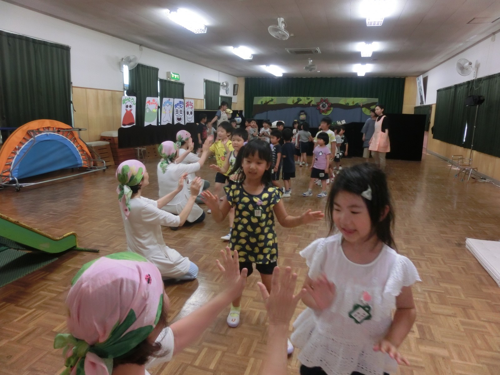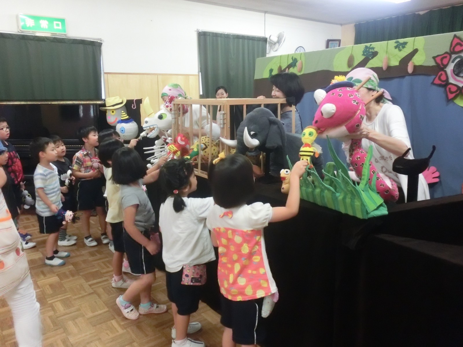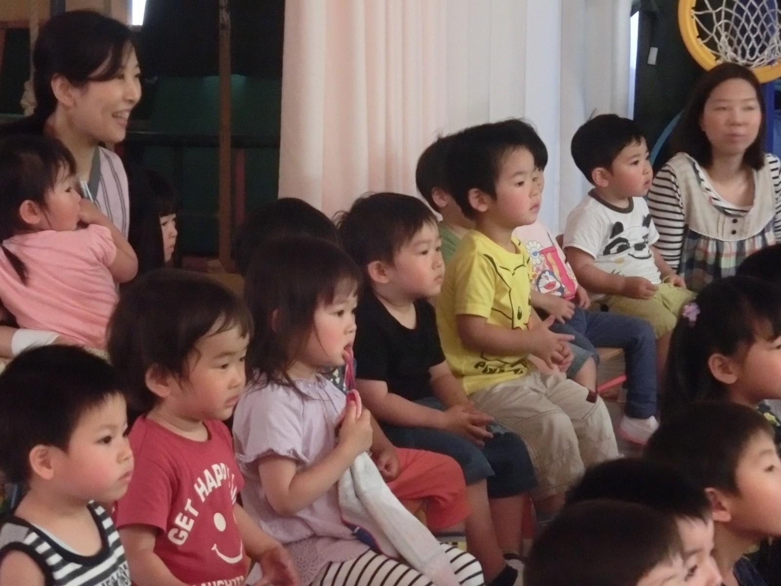 6月19日に第1園のお友達が第2園に集まって、みんなでそして乳児部のいちごさん、さくらんぼさんでちょうちん座の人形劇をみました。