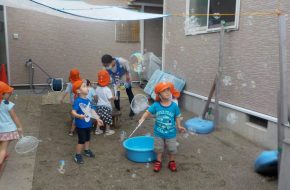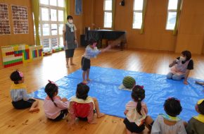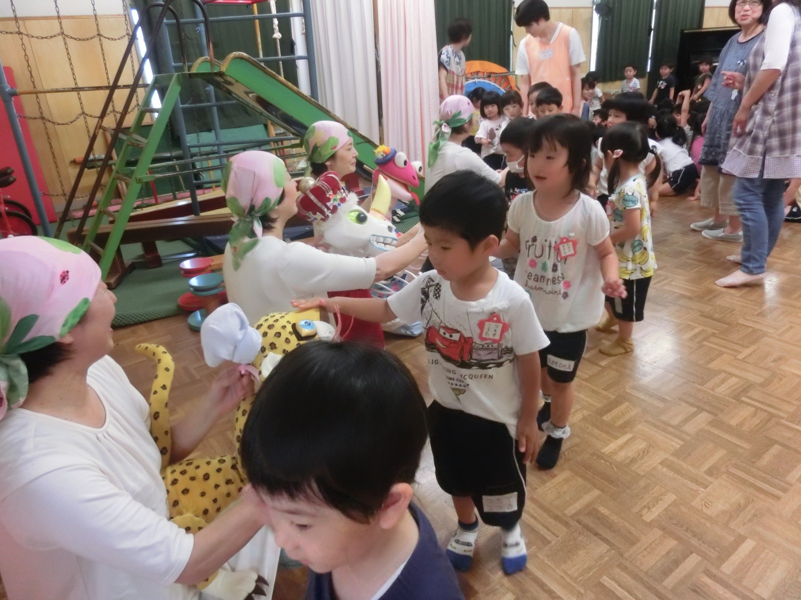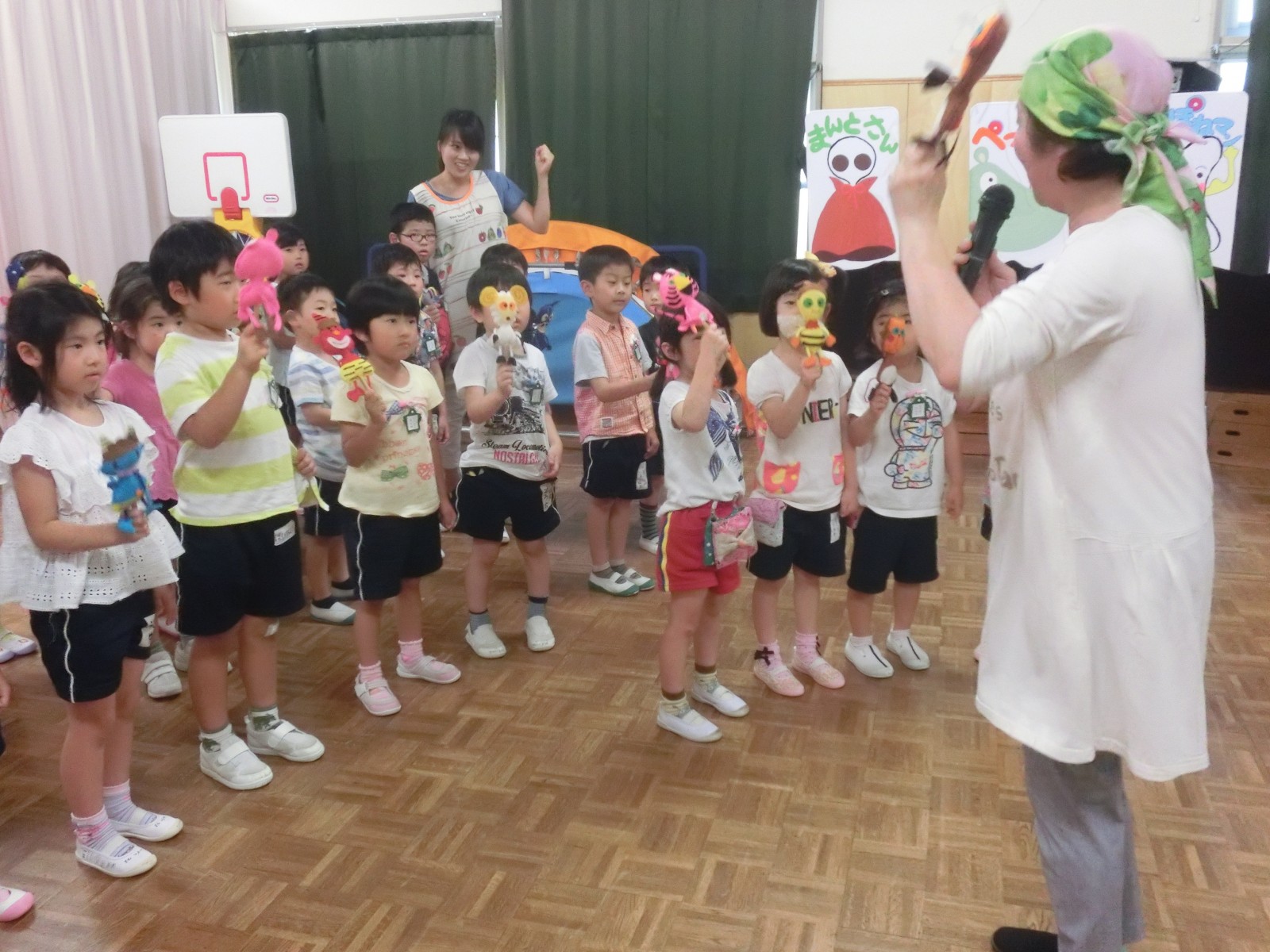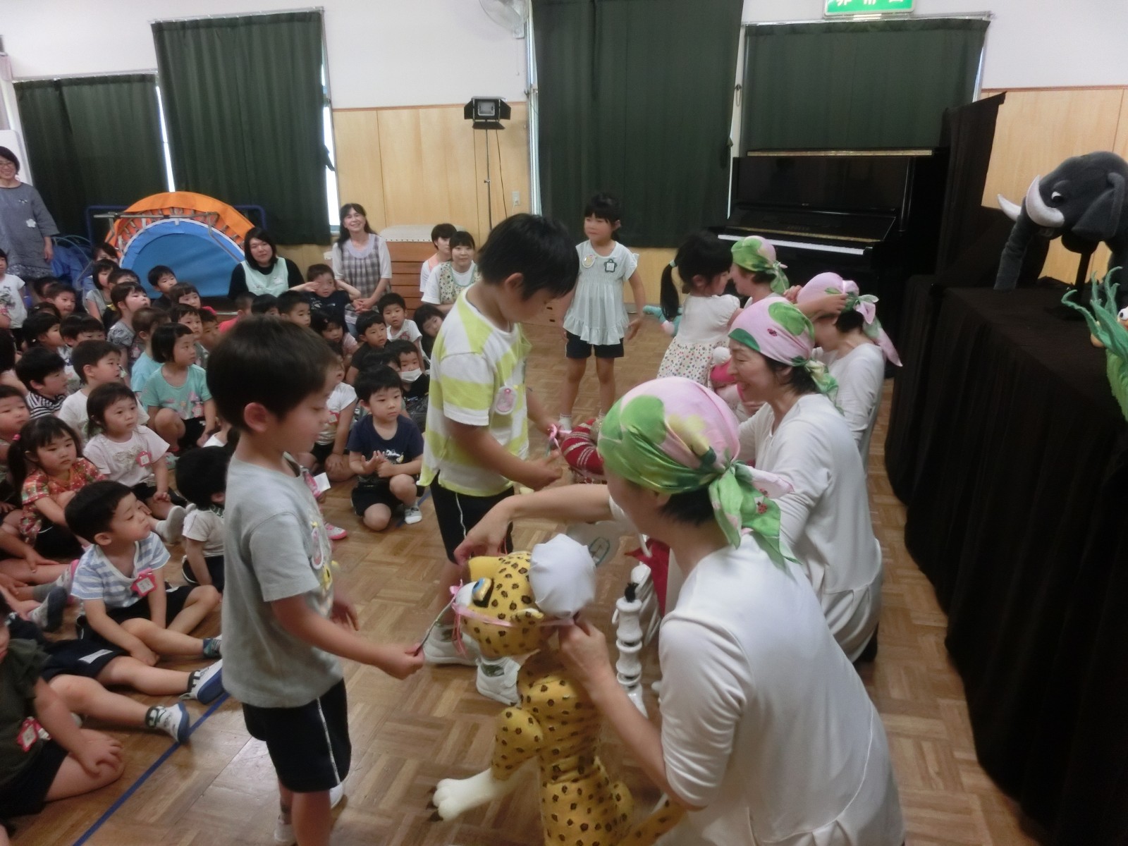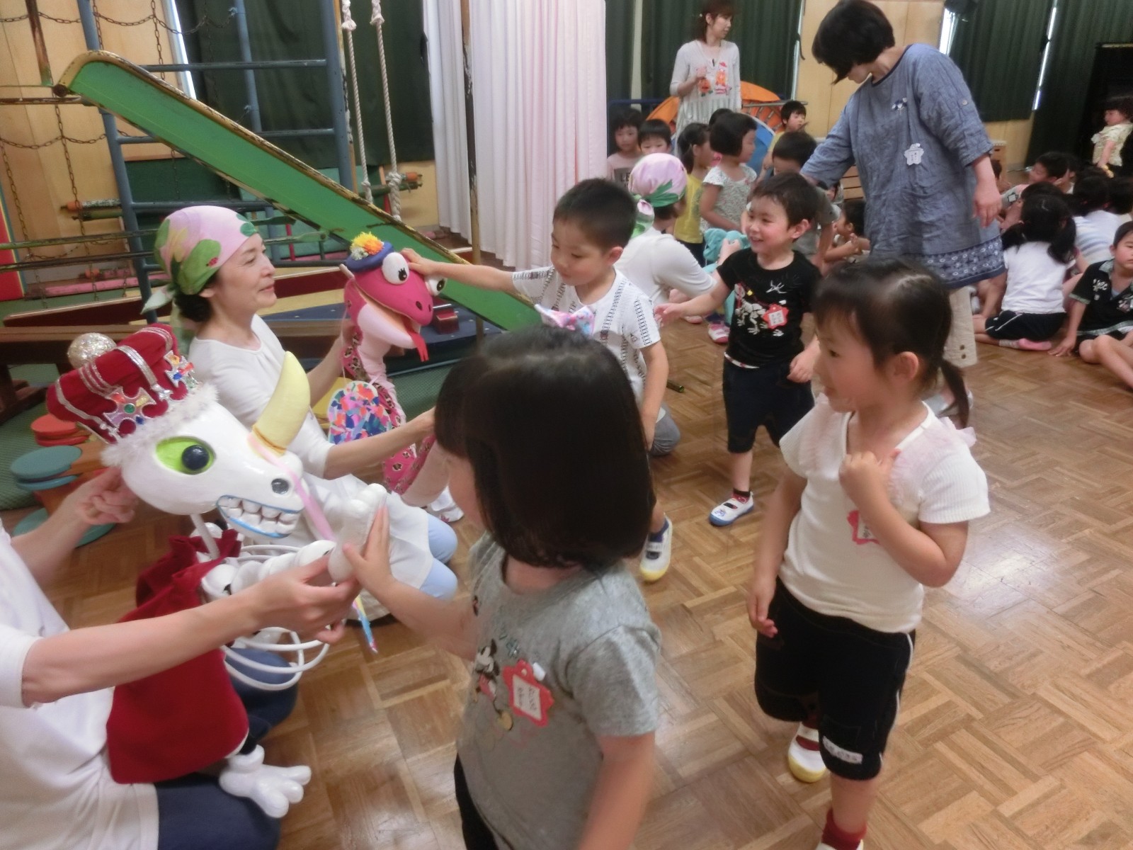6月19日に第1園のお友達が第2園に集まって、みんなでそして乳児部のいちごさん、さくらんぼさんでちょうちん座の人形劇をみました。
