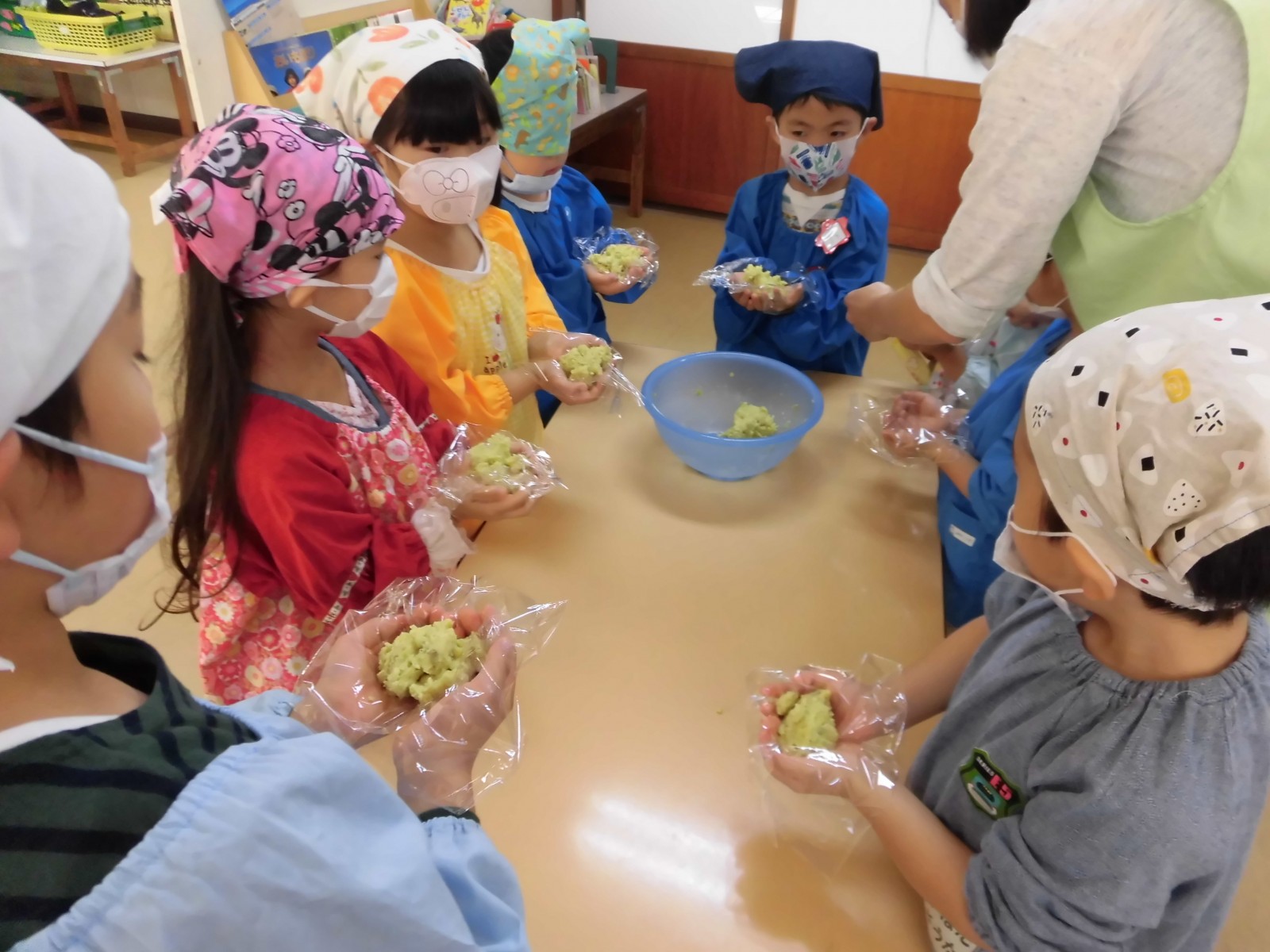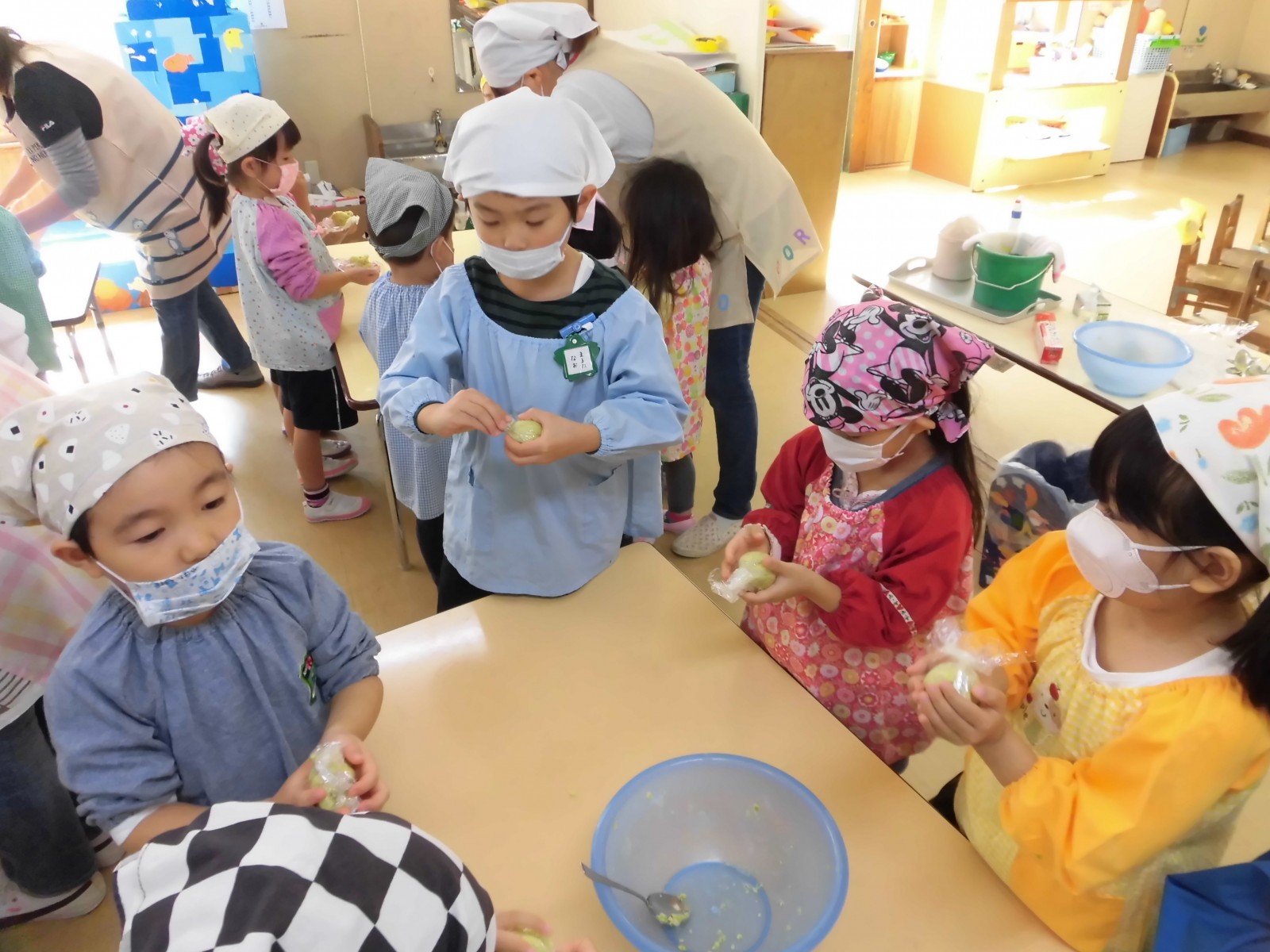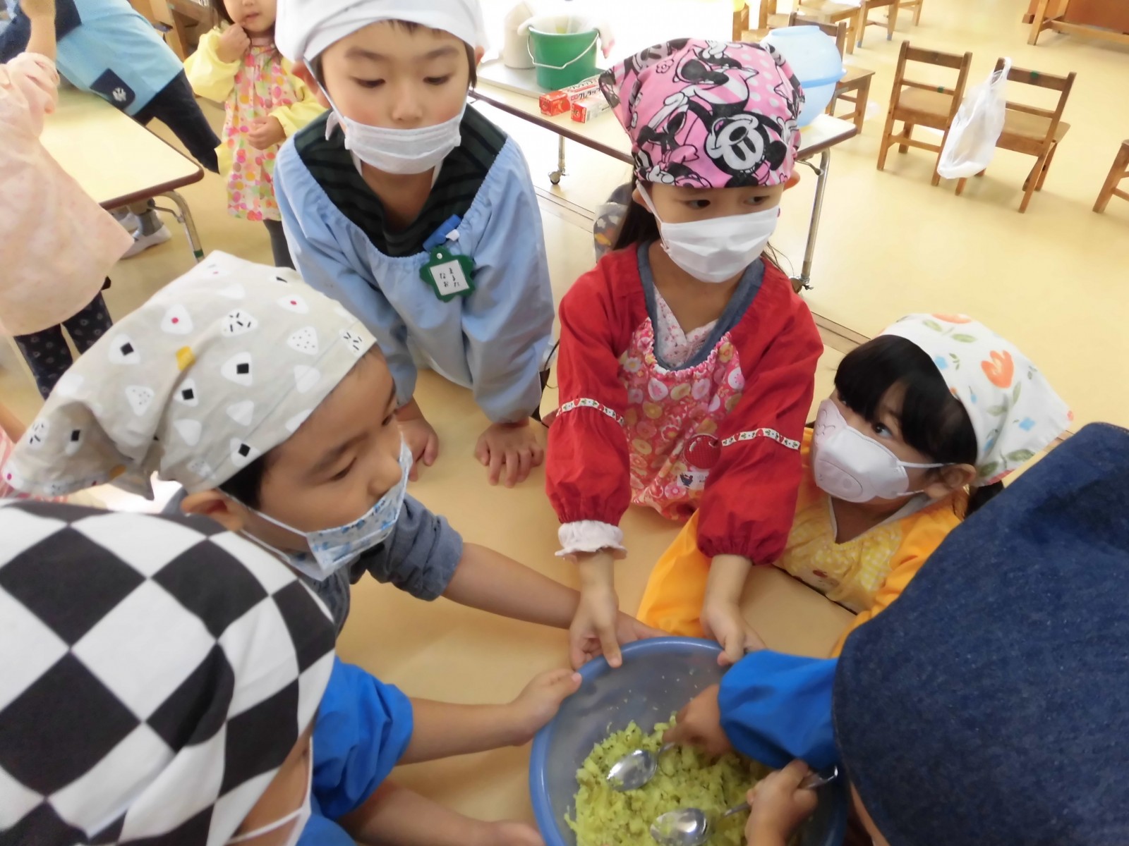 おいもほりで掘ってきたおいもを使ってみんなで「スイートポテト」を作りました。アレルギーの子のために