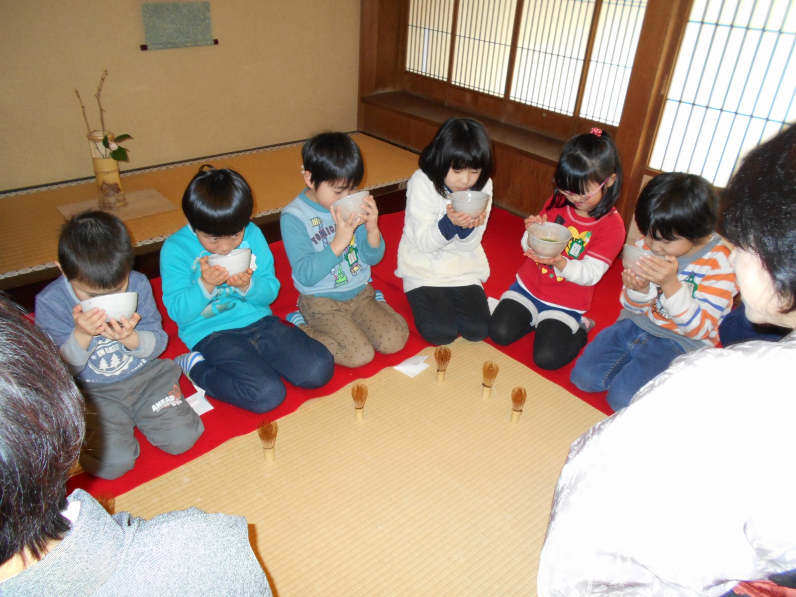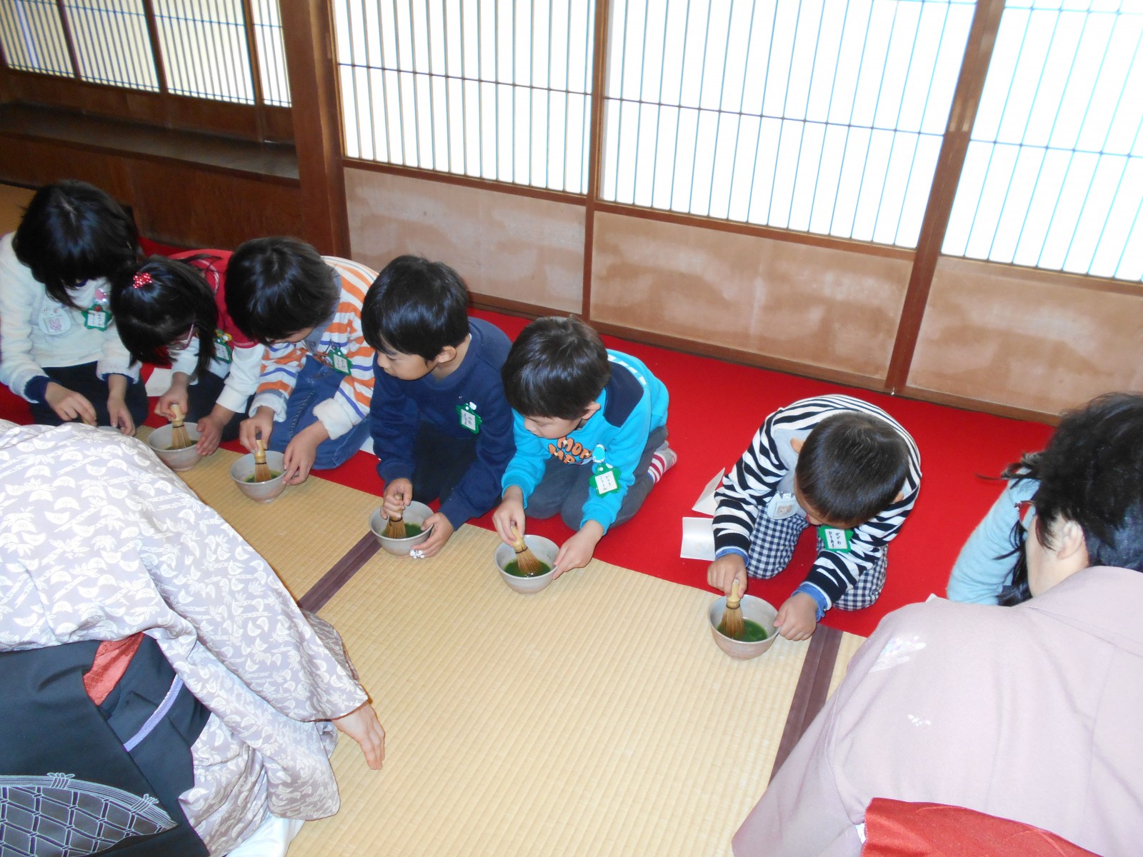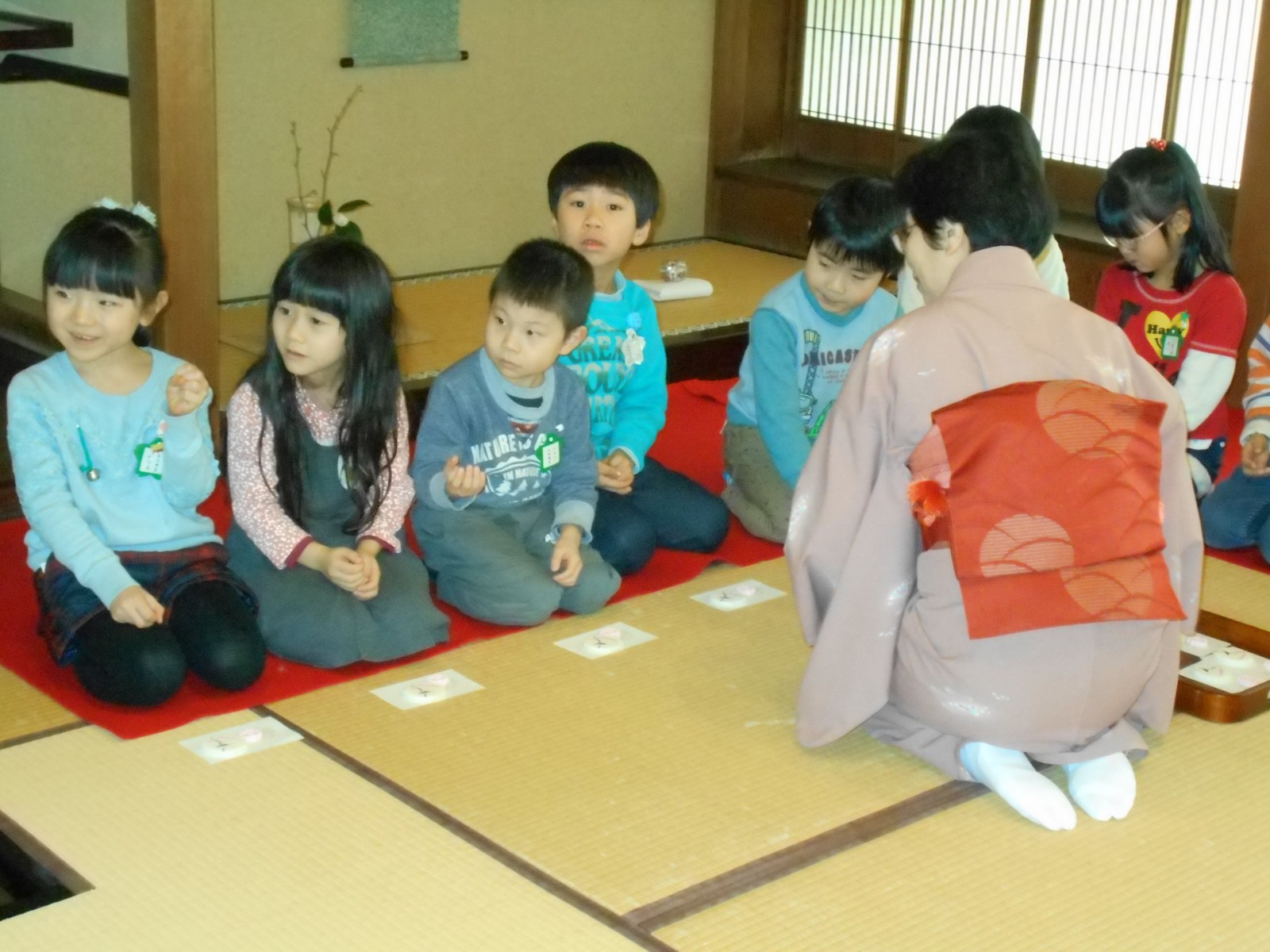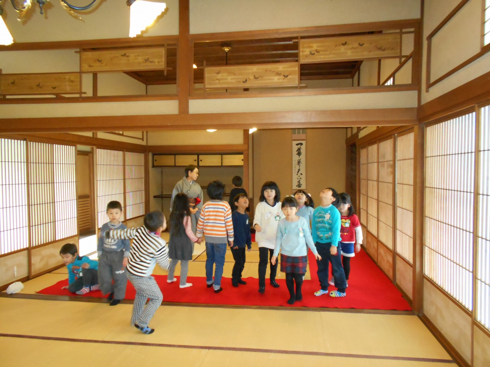 2月の27日に白山神社の奥にある「燕喜館」というところに行ってお茶を作法に乗っていただいてきました。本当は第2園のお友達と行く予定でしたが、第2園がインフルエンザに罹ったお友達が多くなってしまい、残念ながら第1園の年長さんのみで味わってきました。急遽人数が少なくなったとのことで、会館の方のご厚意でお抹茶を自分で茶筅でたてて、いただきました。なかなか味わえない日本の文化を経験出来、みんな大喜びでした。その後、ちょうど時期的にタイミングよく、8段飾りのお雛様、2組を鑑賞させていただき、五人囃子や三人官女やお嫁入り道具も見られ、みんな目を輝かせながら見入っていました。その後、みごとな欄間の飾りなどもあれこれみさせていただき、日本の伝統にひたってきました。