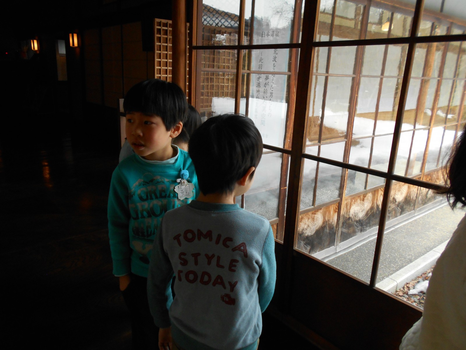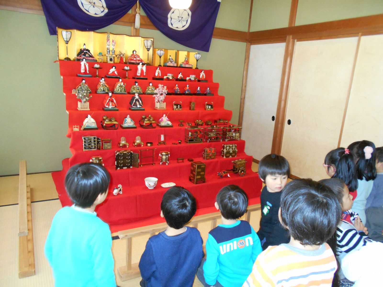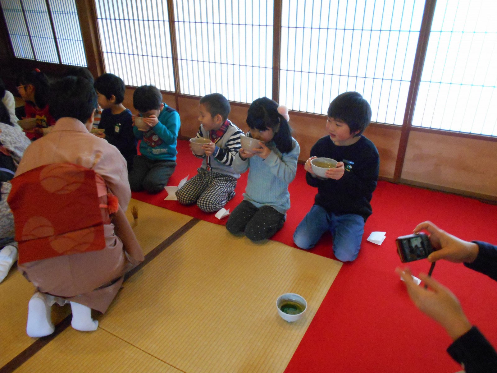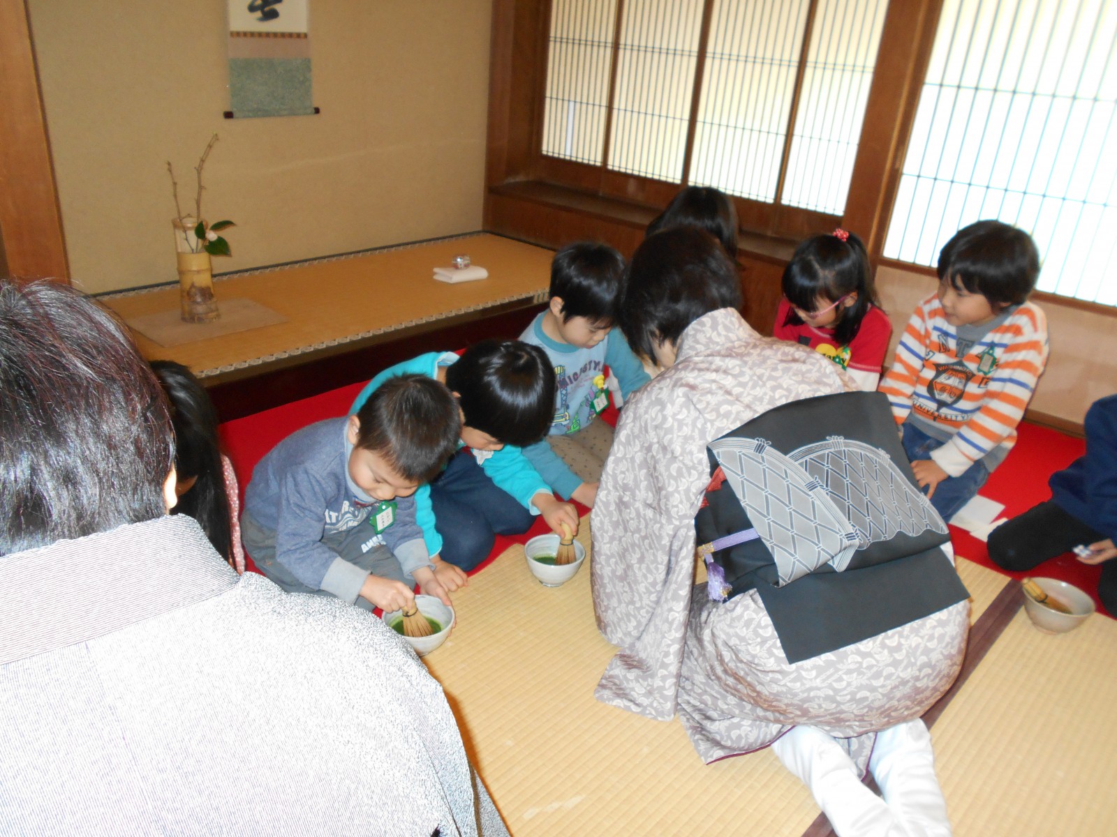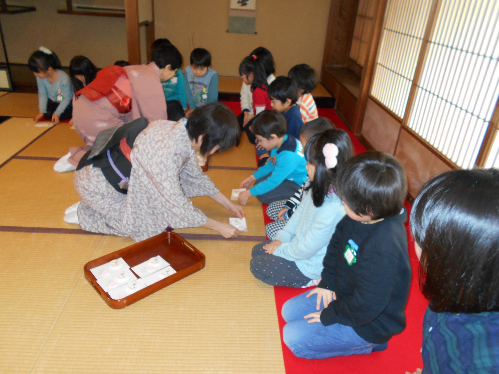 2月の27日に白山神社の奥にある「燕喜館」というところに行ってお茶を作法に乗っていただいてきました。本当は第2園のお友達と行く予定でしたが、第2園がインフルエンザに罹ったお友達が多くなってしまい、残念ながら第1園の年長さんのみで味わってきました。急遽人数が少なくなったとのことで、会館の方のご厚意でお抹茶を自分で茶筅でたてて、いただきました。なかなか味わえない日本の文化を経験出来、みんな大喜びでした。その後、ちょうど時期的にタイミングよく、8段飾りのお雛様、2組を鑑賞させていただき、五人囃子や三人官女やお嫁入り道具も見られ、みんな目を輝かせながら見入っていました。その後、みごとな欄間の飾りなどもあれこれみさせていただき、日本の伝統にひたってきました。