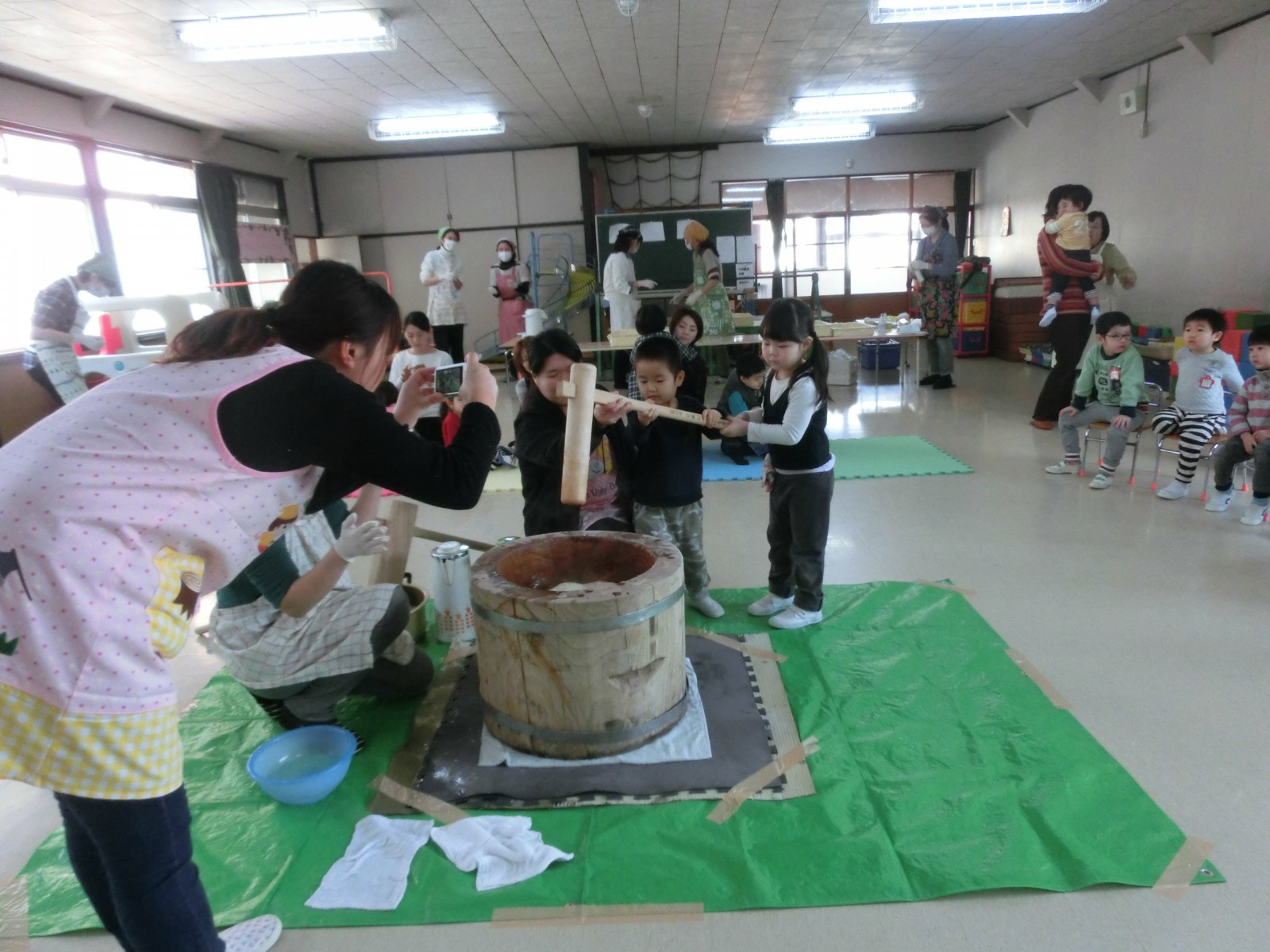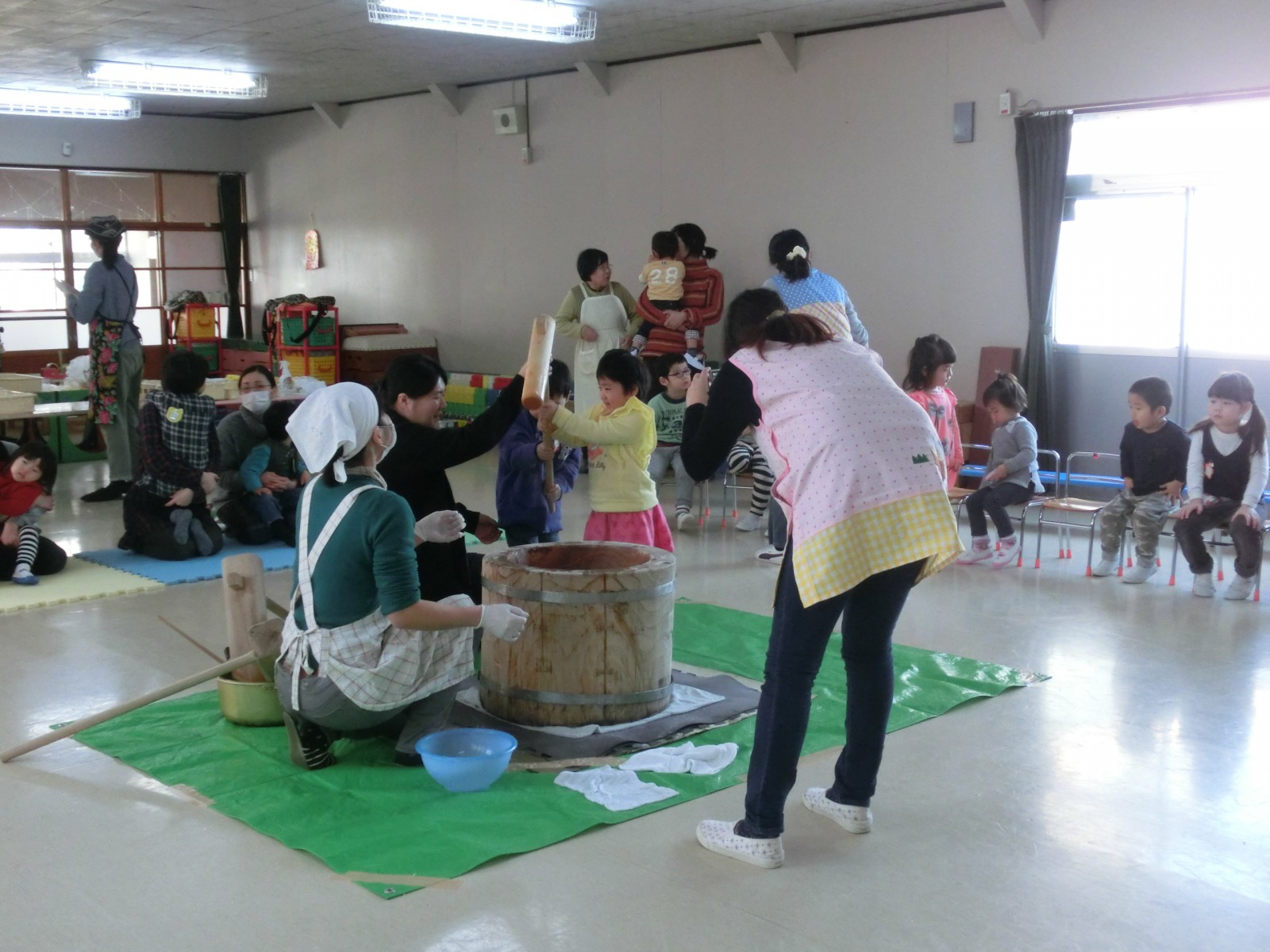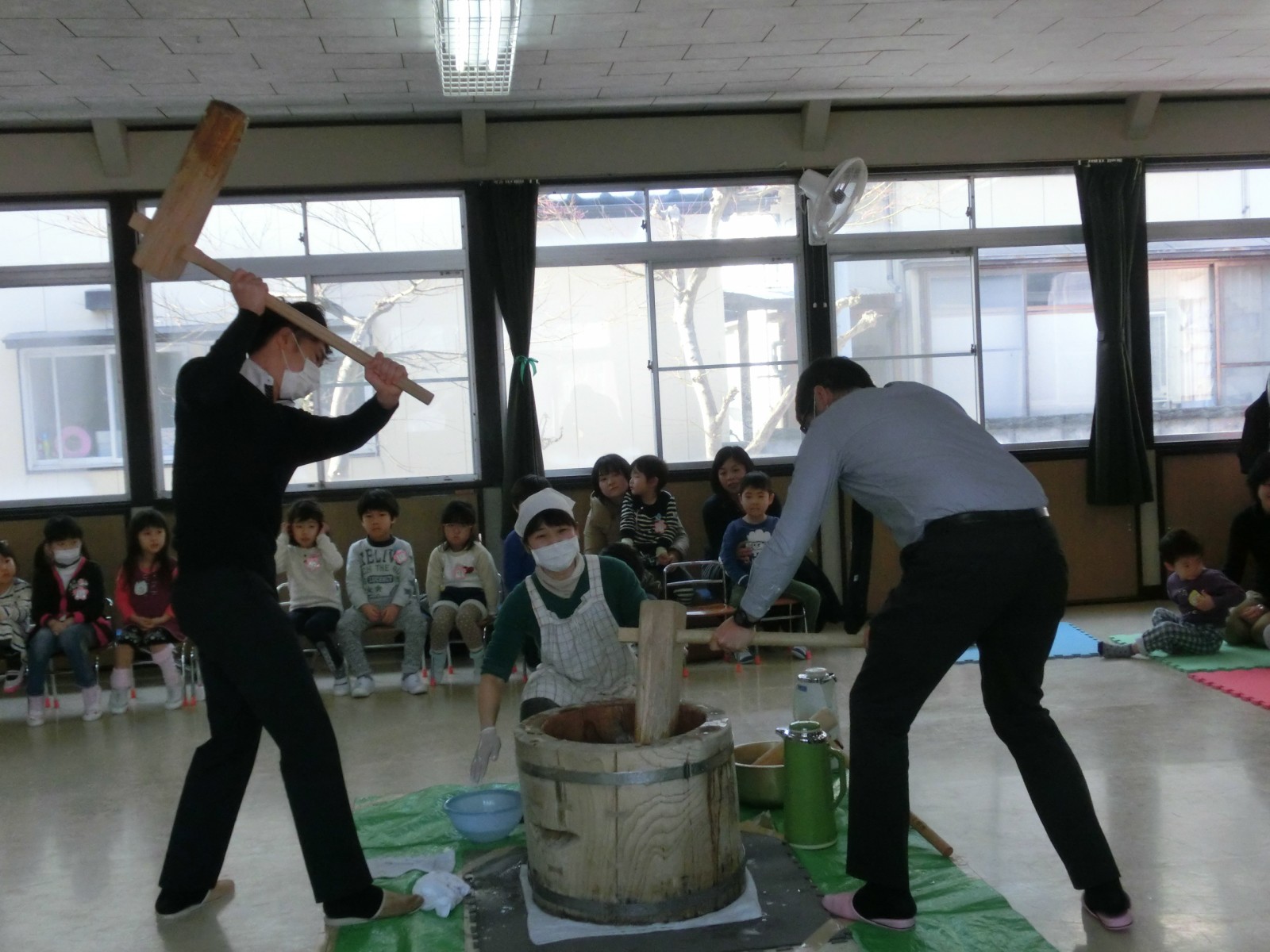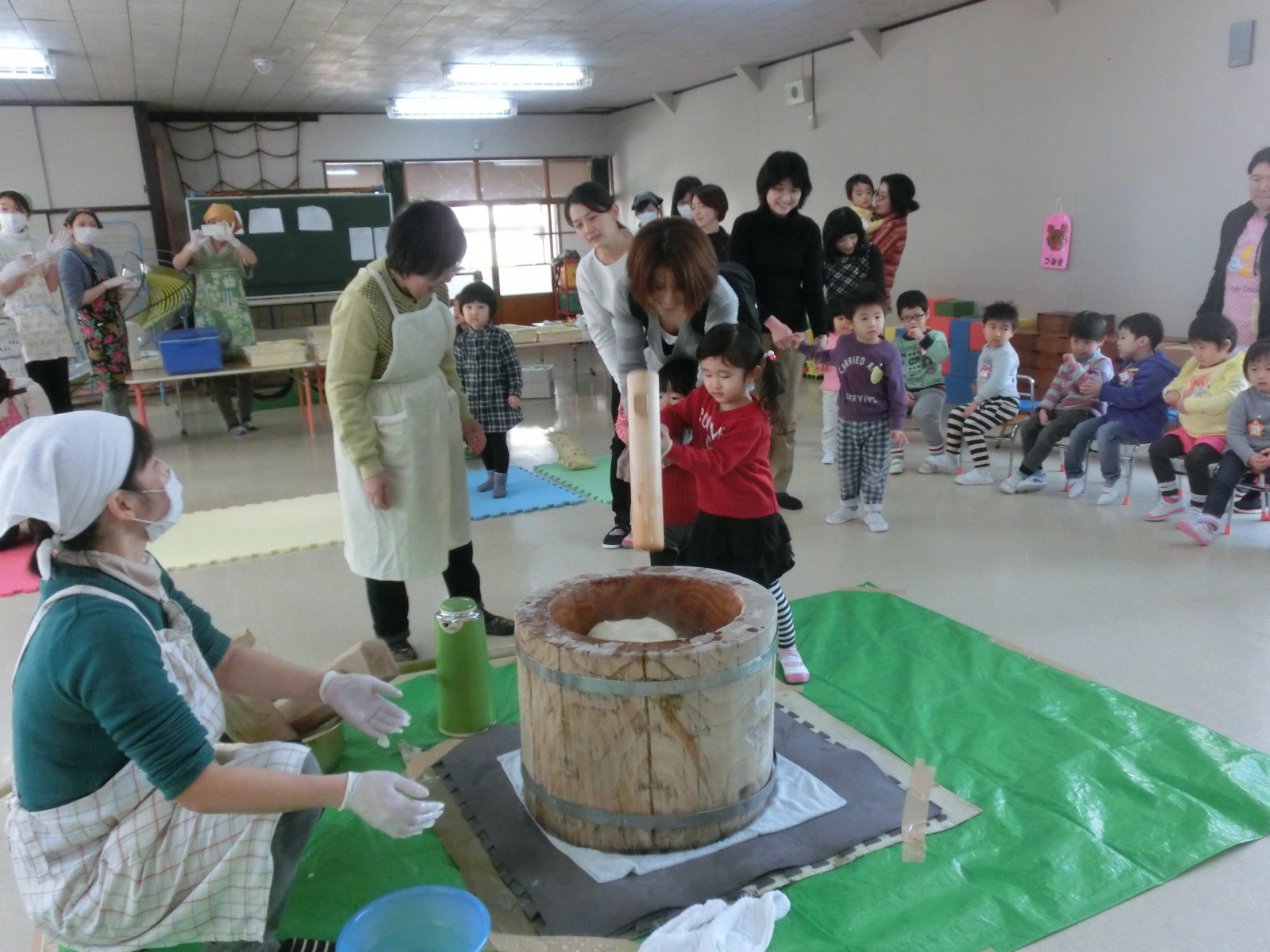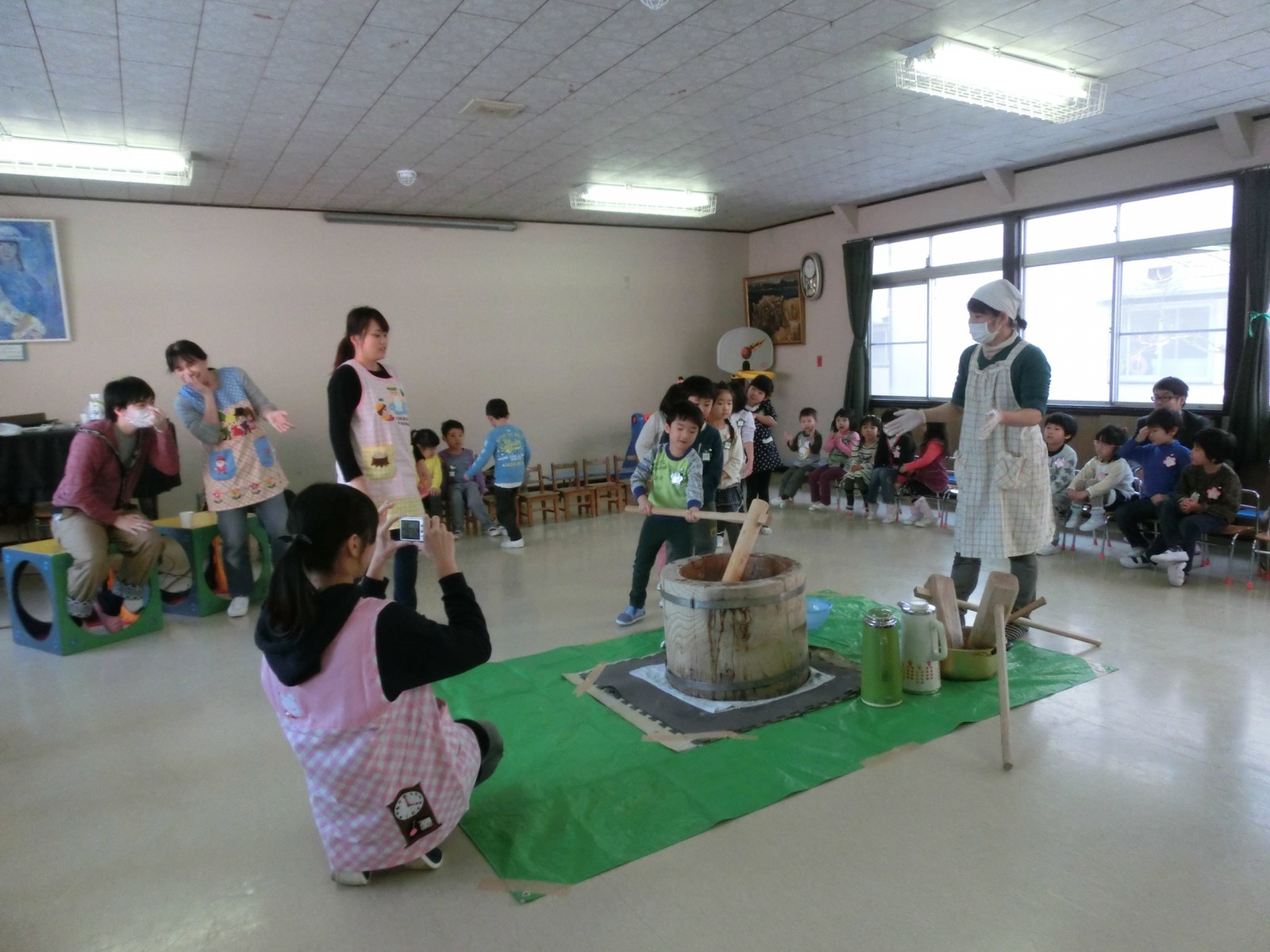 1月20日におもちつきをしました。インフルエンザが流行り始め、お休みがぽつぽつとでだした中でのお餅つきでした。でもみんないっぱいお餅を搗き、第2幼稚園のお兄さんたちと飛び入りのお父さんが手伝ってくださいました。ありがとう!
