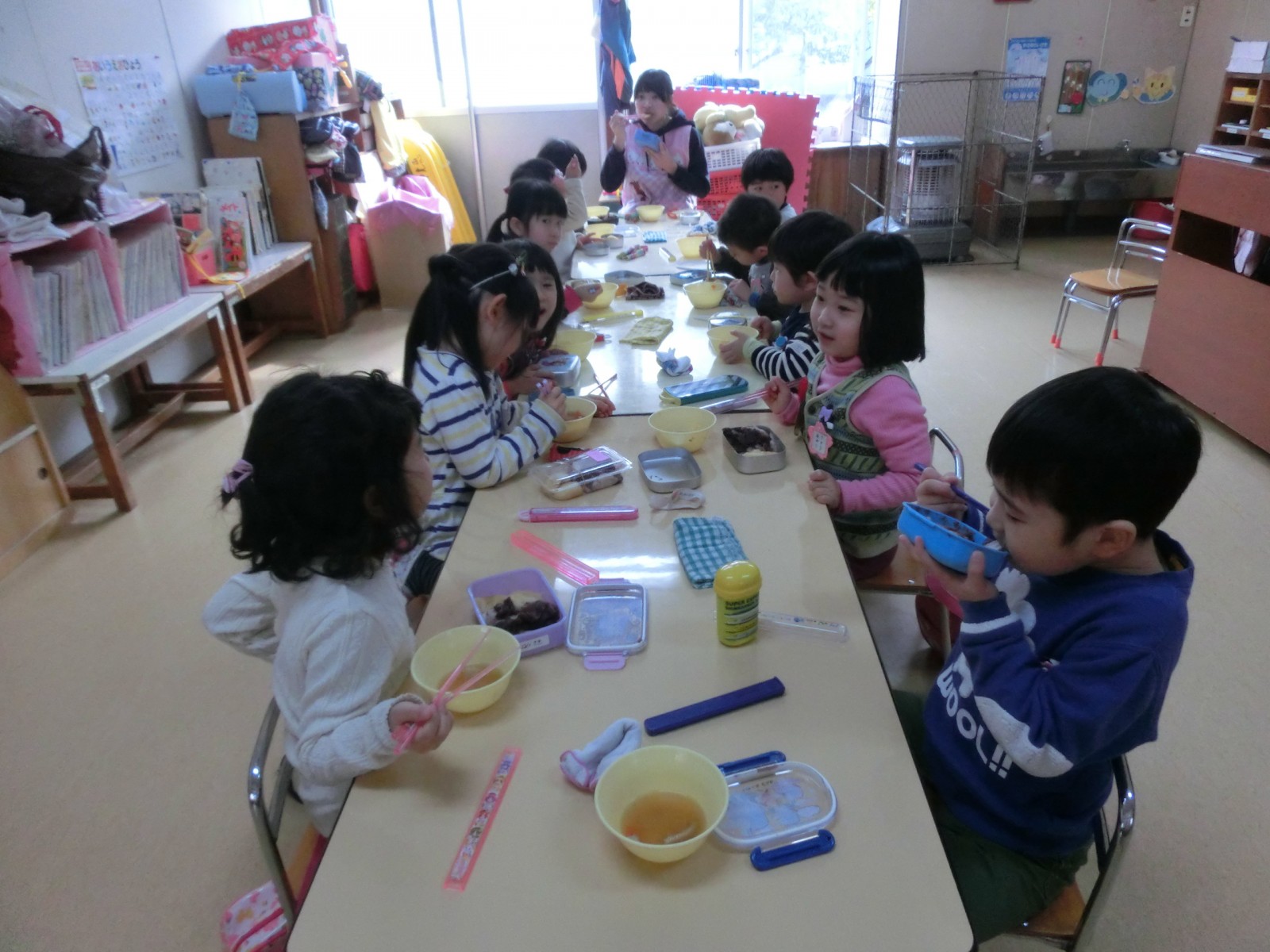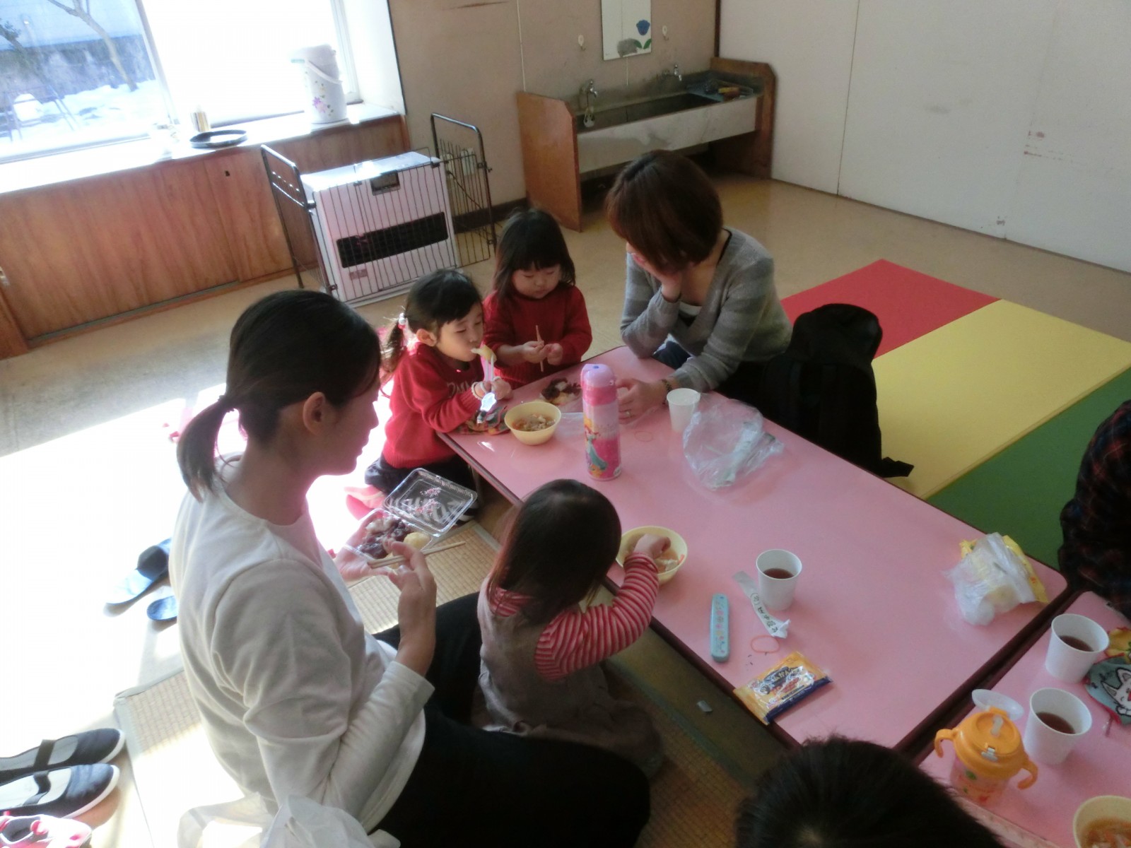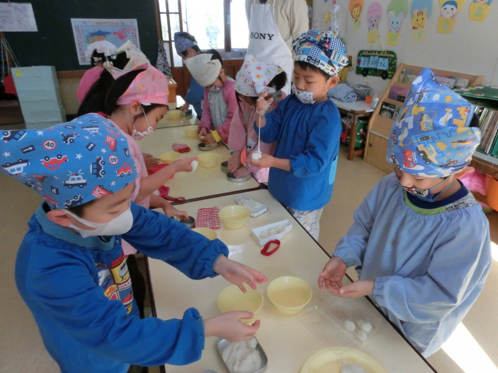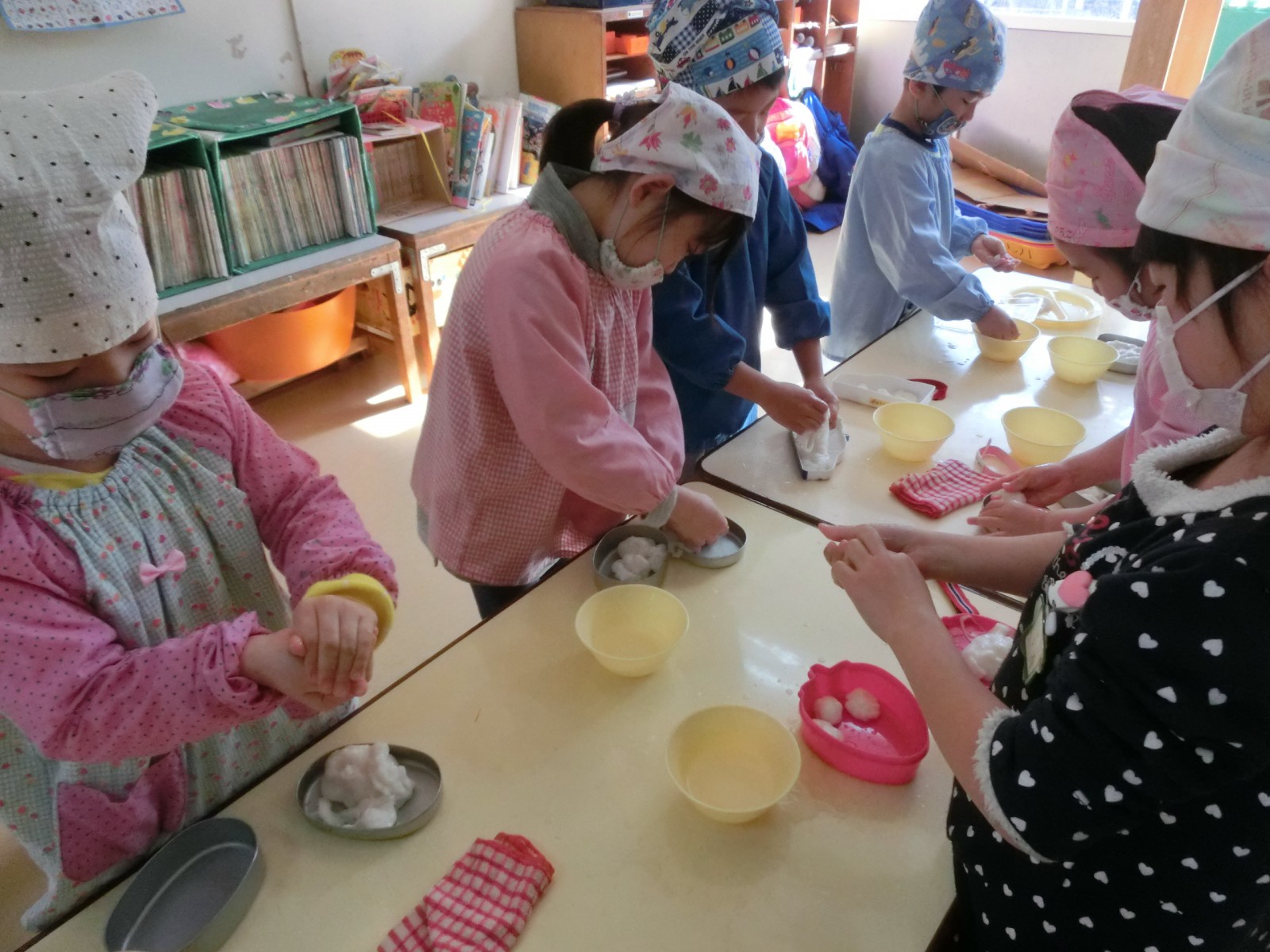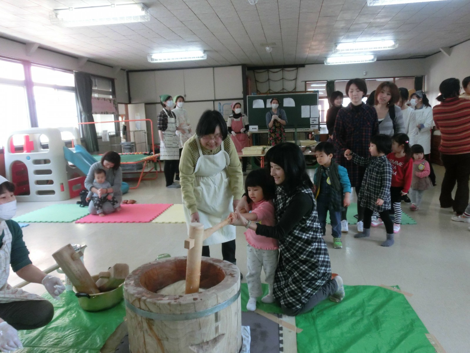 1月20日におもちつきをしました。インフルエンザが流行り始め、お休みがぽつぽつとでだした中でのお餅つきでした。でもみんないっぱいお餅を搗き、第2幼稚園のお兄さんたちと飛び入りのお父さんが手伝ってくださいました。ありがとう!