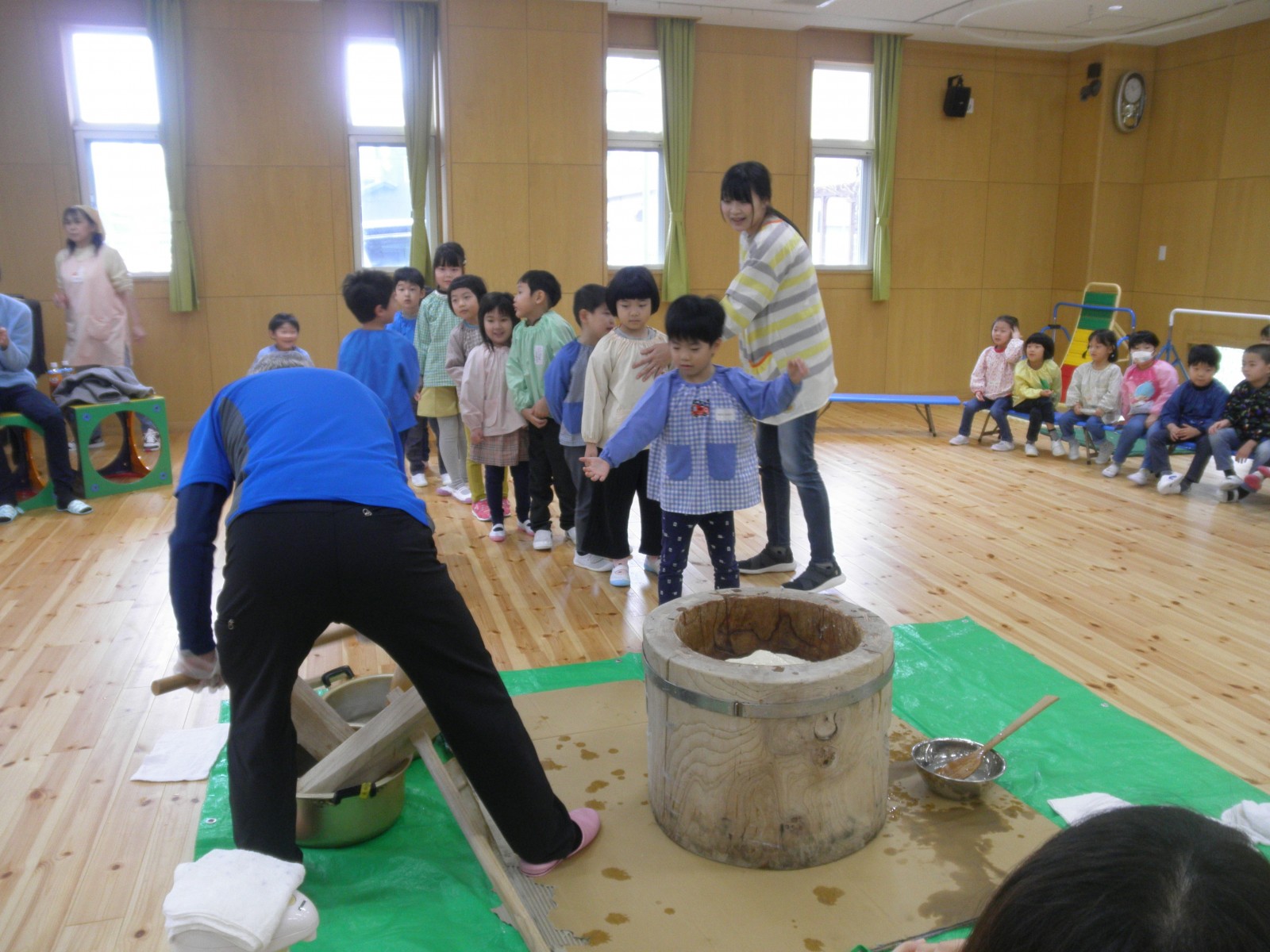 お手伝いのお父さんが少なくめつぶしや子ども達の前に準備搗きの段階がとても大変だったようで、お手伝いのお父さんたち、本当にありがとうございました。ピンチヒッターでバスの運転手さんも手伝ってくださいました。感謝です。