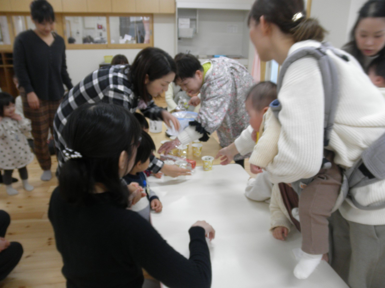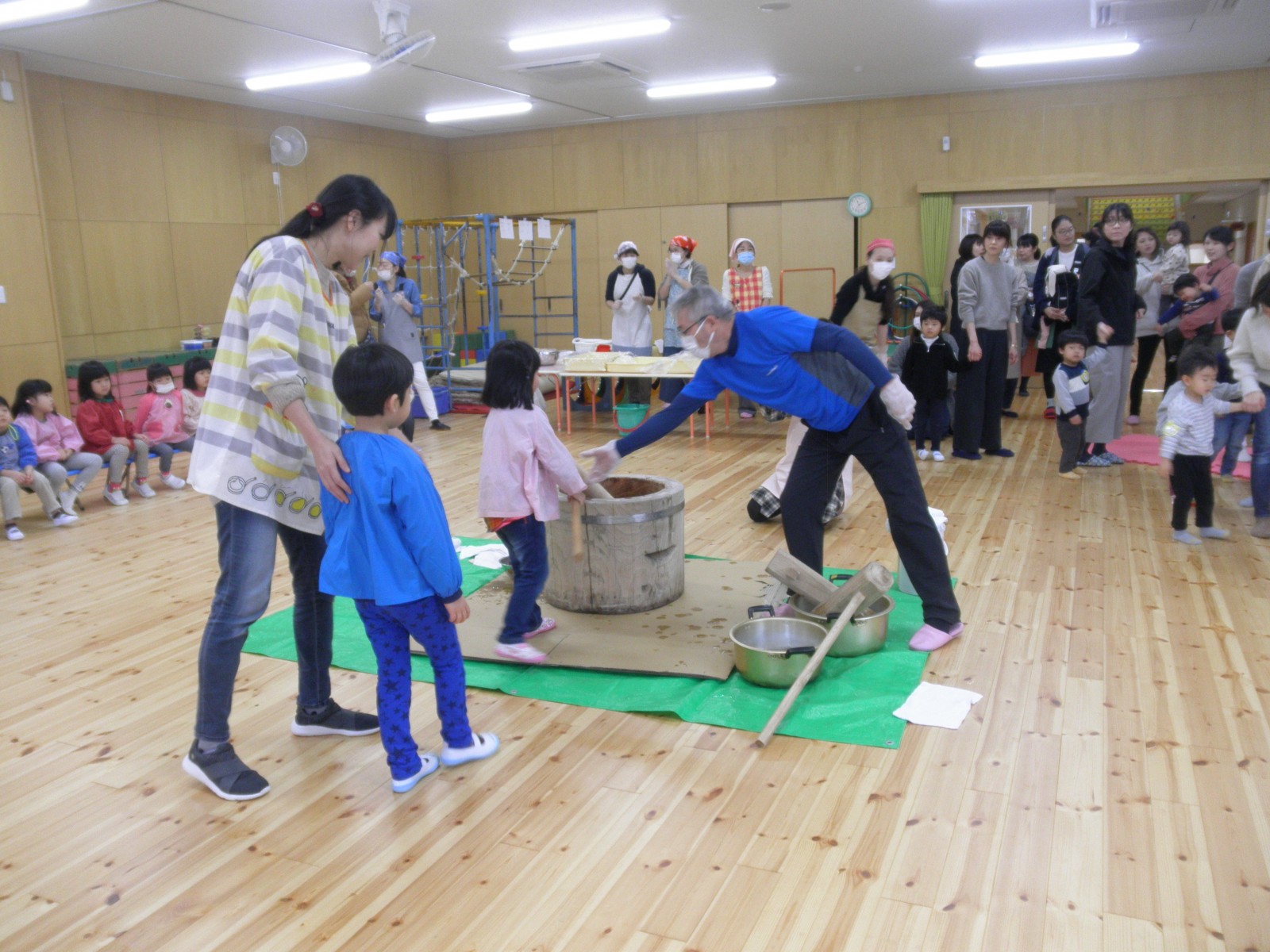 子ども達が一通りぺったんことお餅つきが終わり、チューリップ教室のお友達もお母さんと一緒に搗きました。