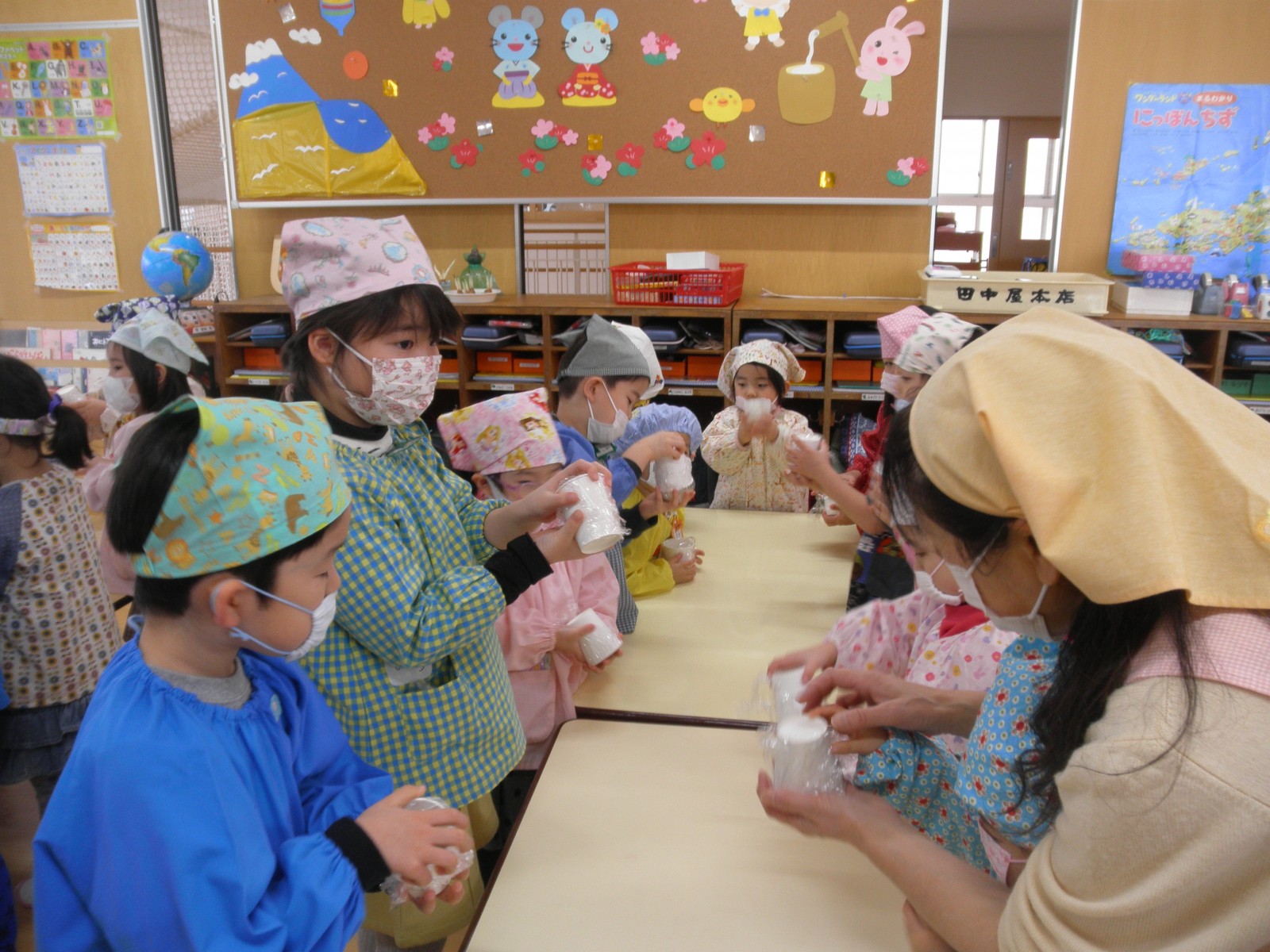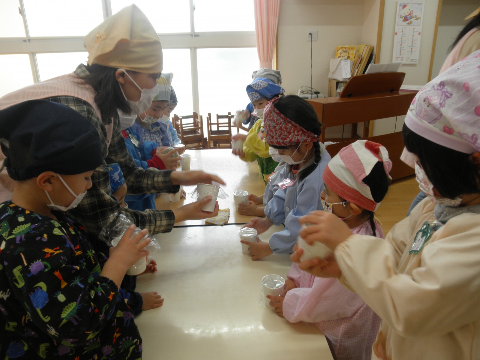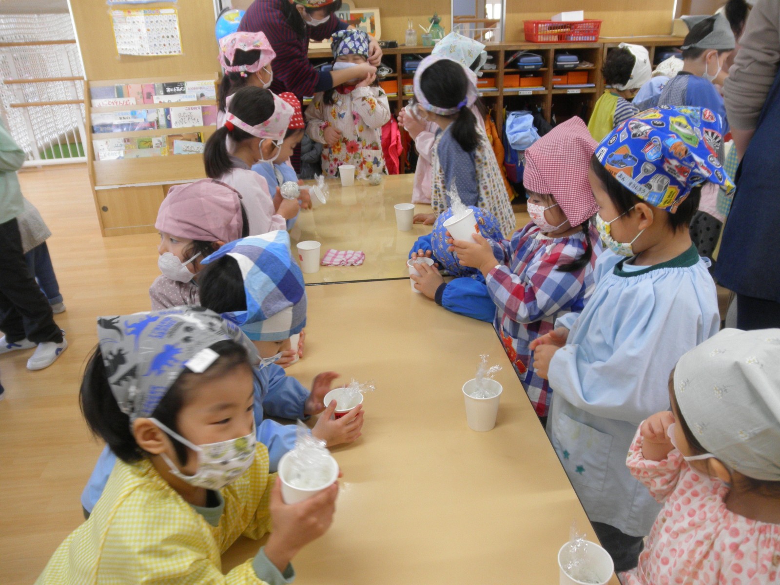 そして、その後紙コップに入れて作る「シャカシャカおにぎりを今年もみんなで作り、お餅と一緒にいただきました。お米は農協さんからいただいて2回目の挑戦です。みんな上手になりました。