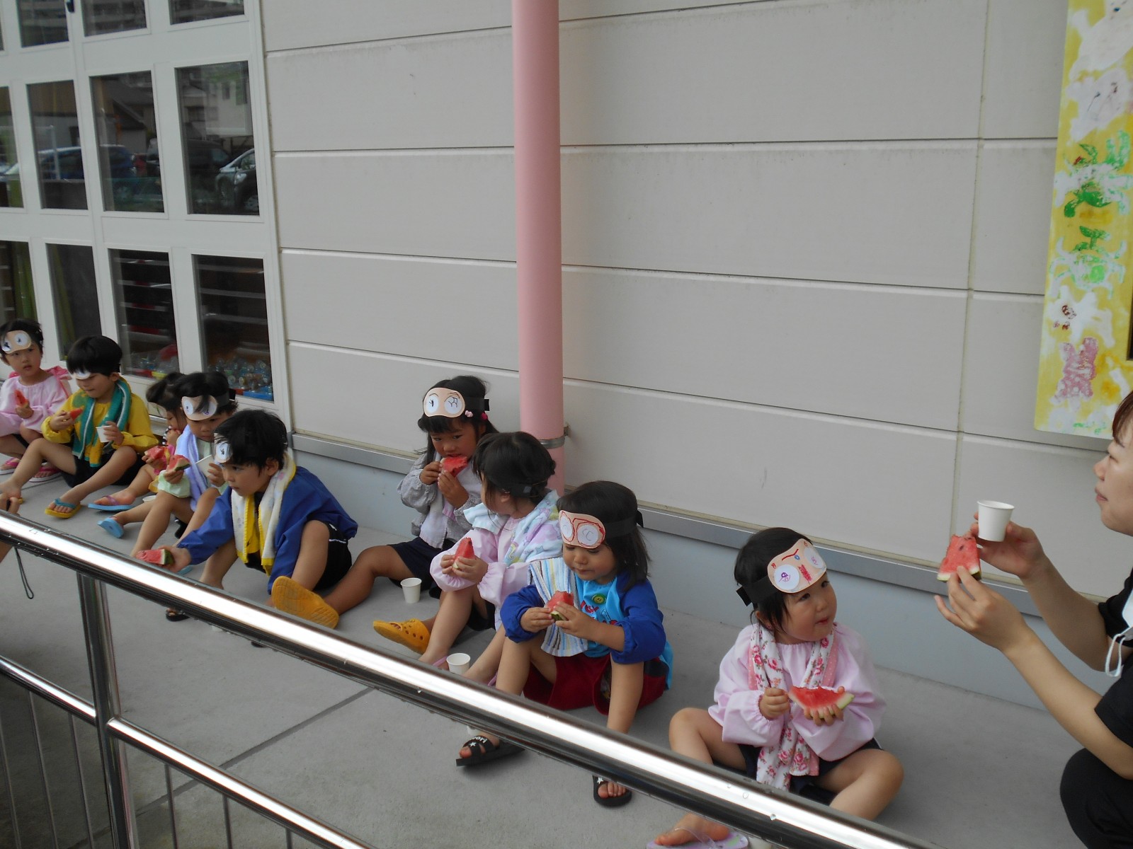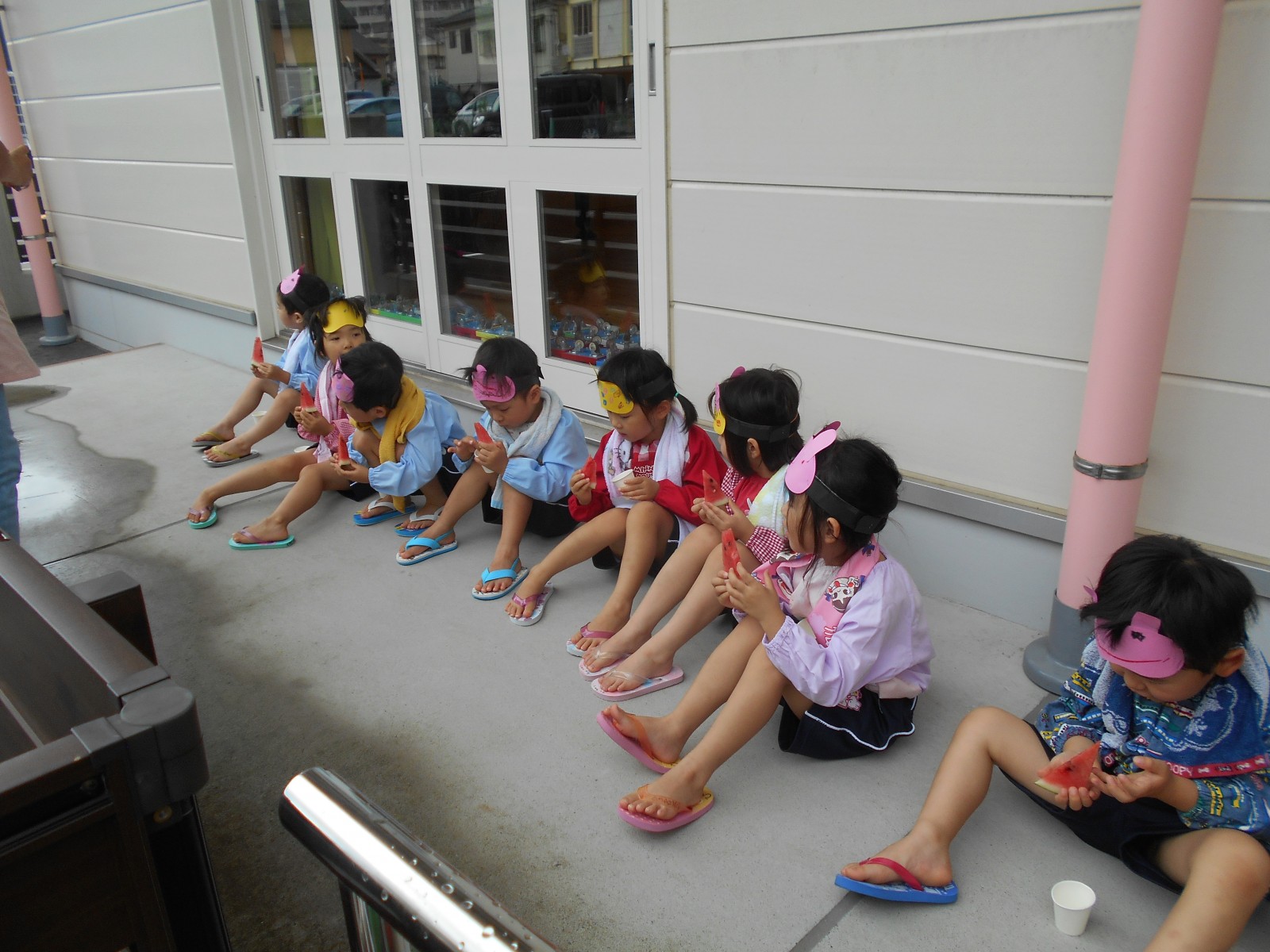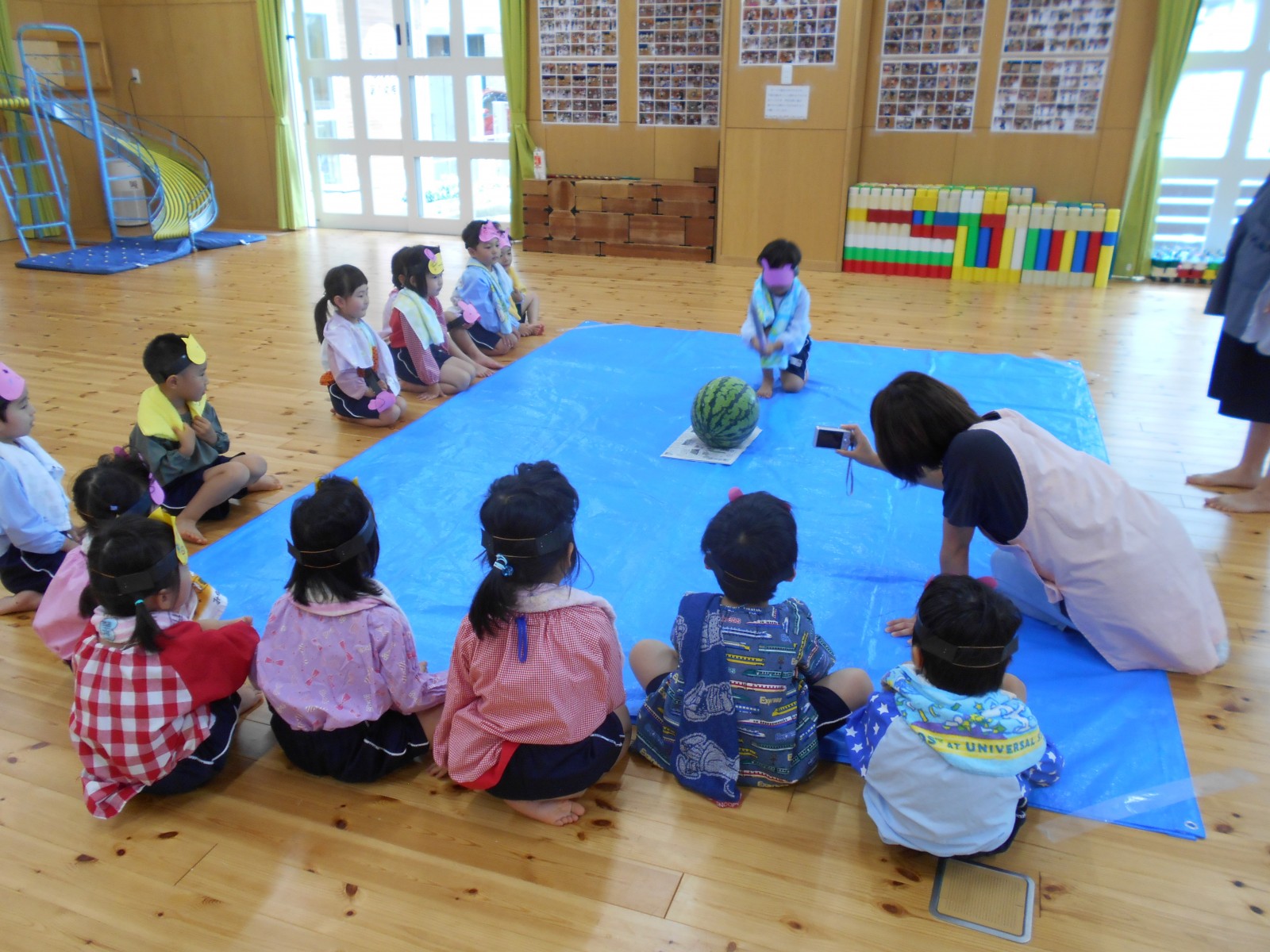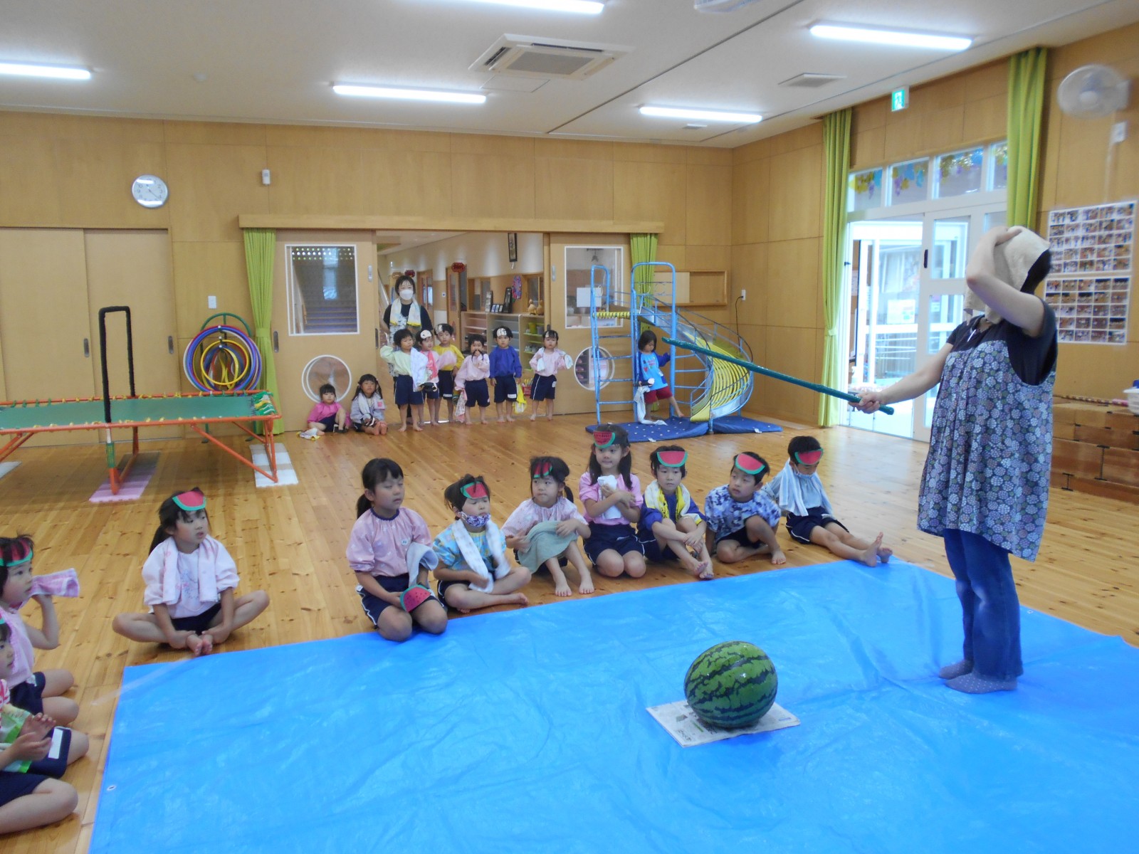 7月12日、雨がふってしまい、残念ながらホールで敷き物をしいてクラス毎にすいかわりをしました。