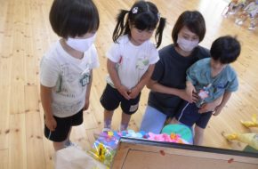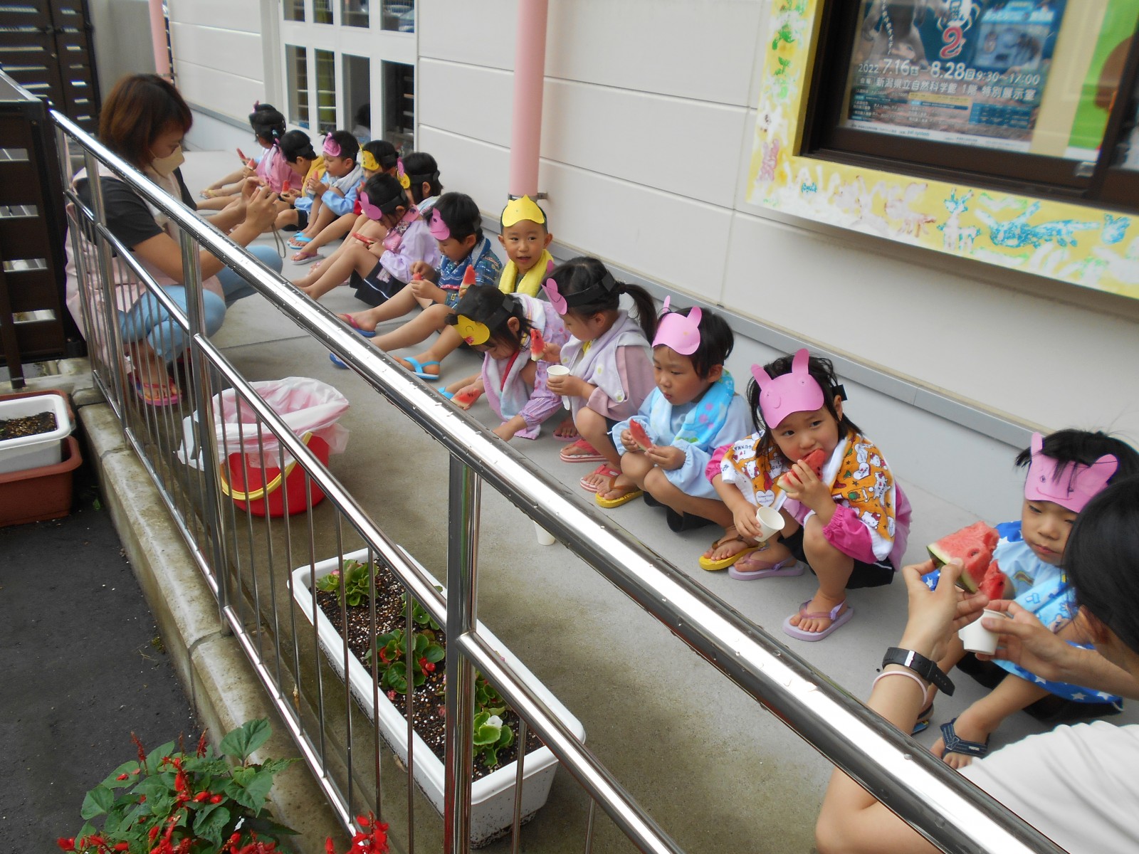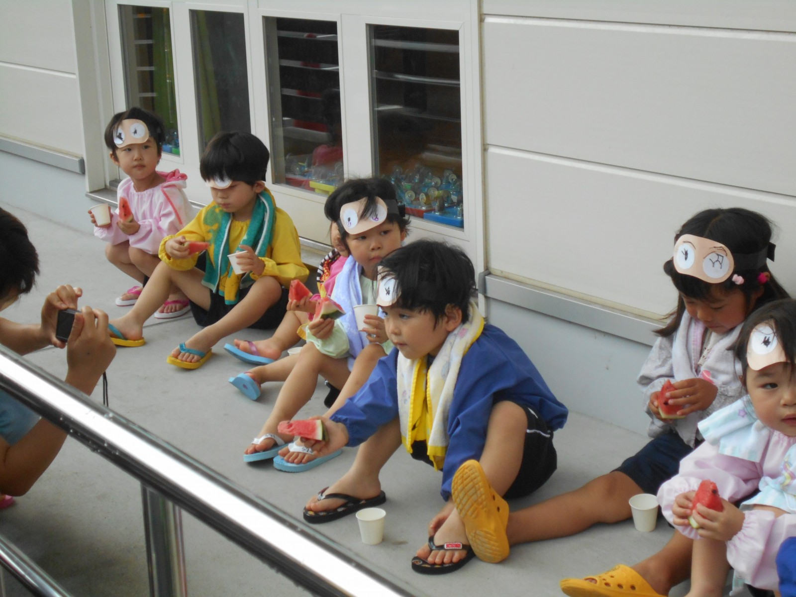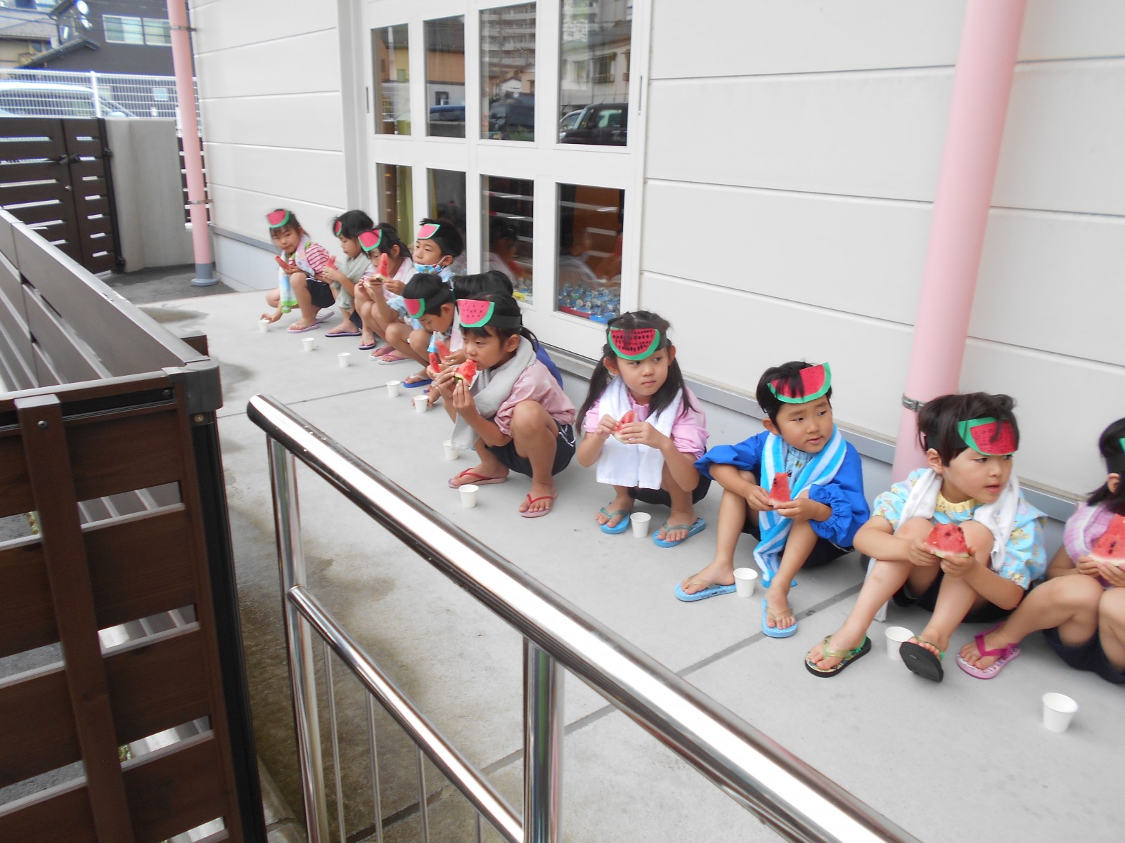 7月12日、雨がふってしまい、残念ながらホールで敷き物をしいてクラス毎にすいかわりをしました。