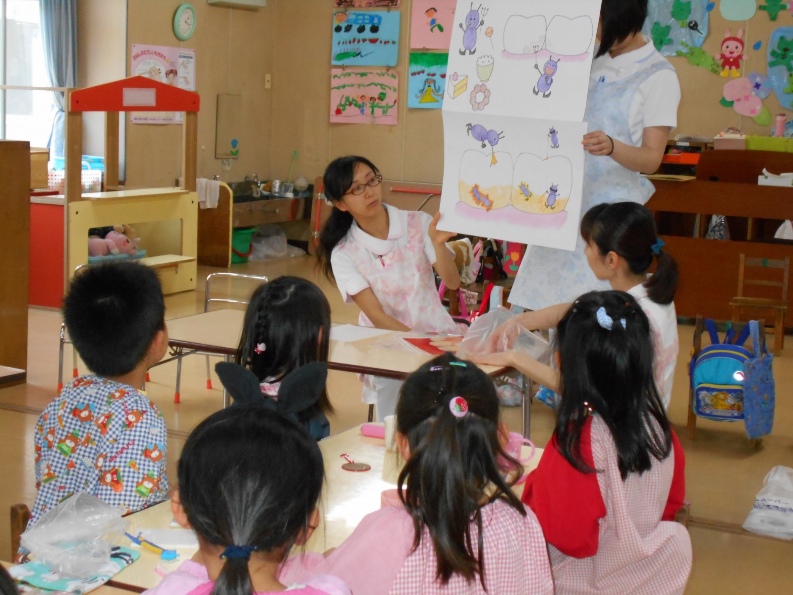 6月1日 歯科検診の後、園医である諸見里歯科医院の先生たちによる、歯磨き指導が行われました。カラーテスターを使って磨き残しがないか丁寧にみがく方法や、虫歯のことについてお話をききました。みんな鏡をみながら一生懸命にみがきました。