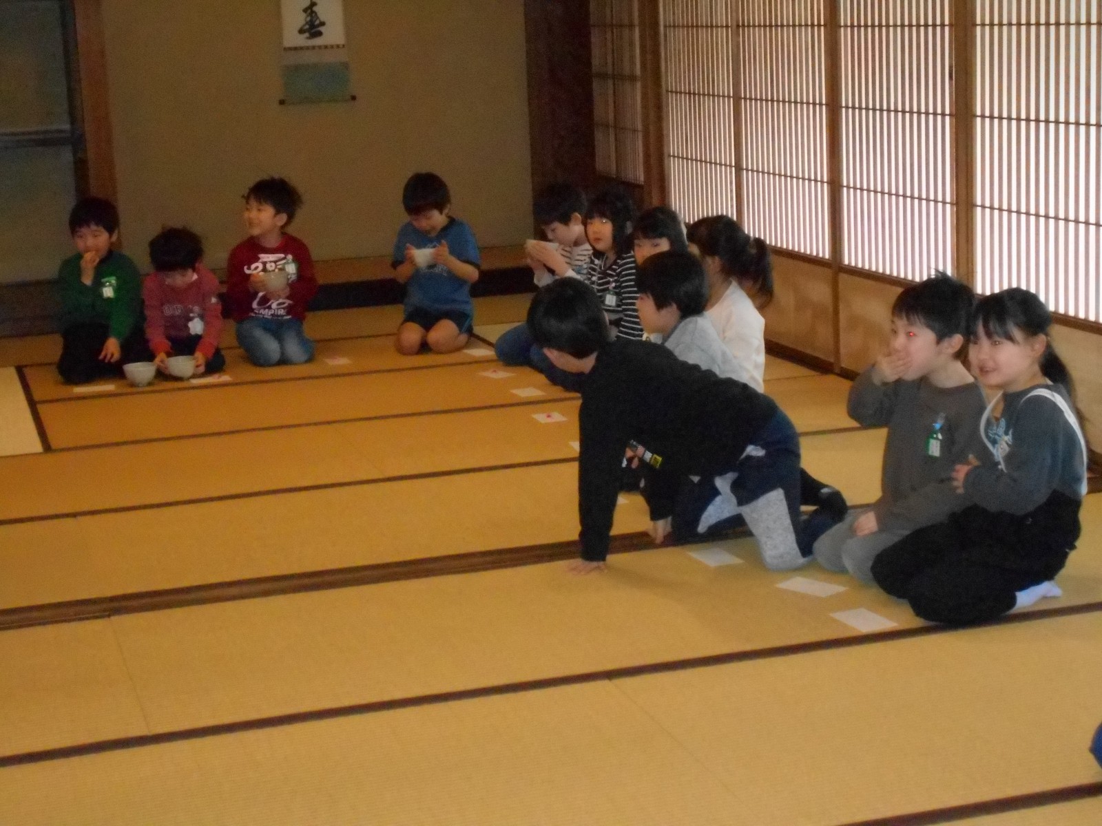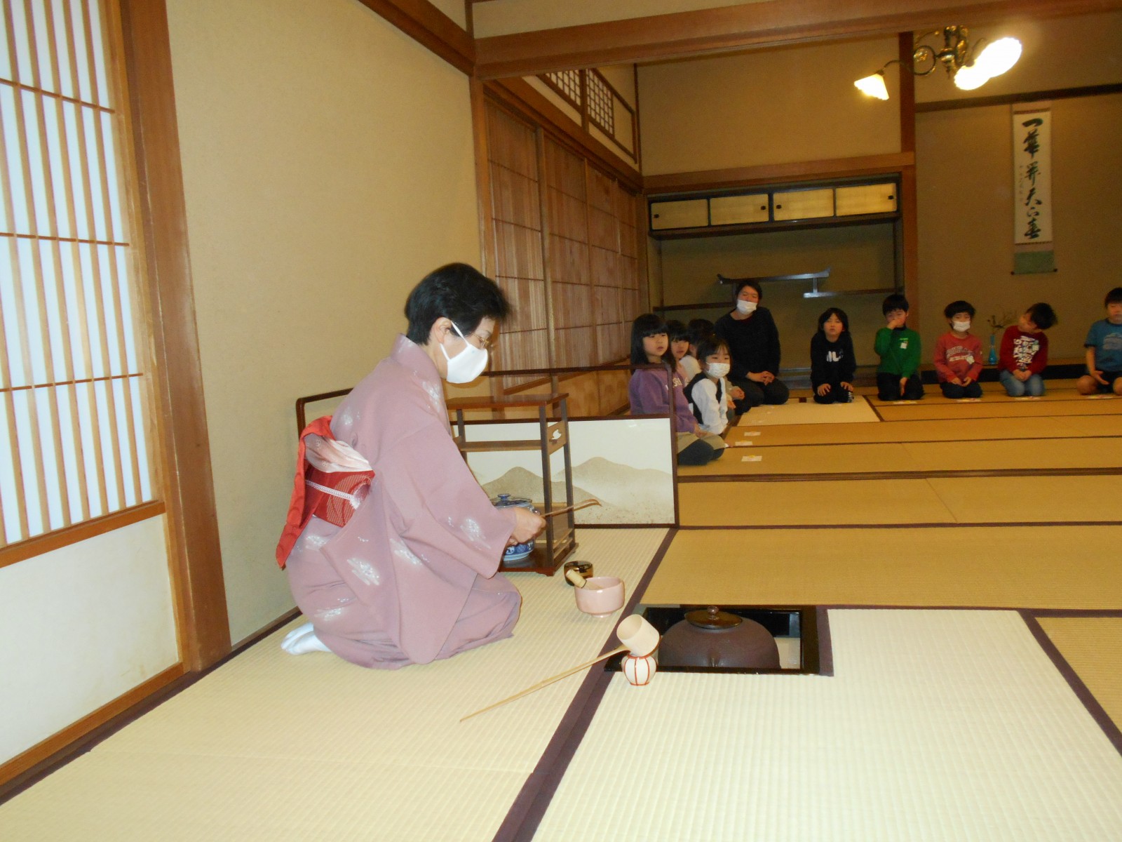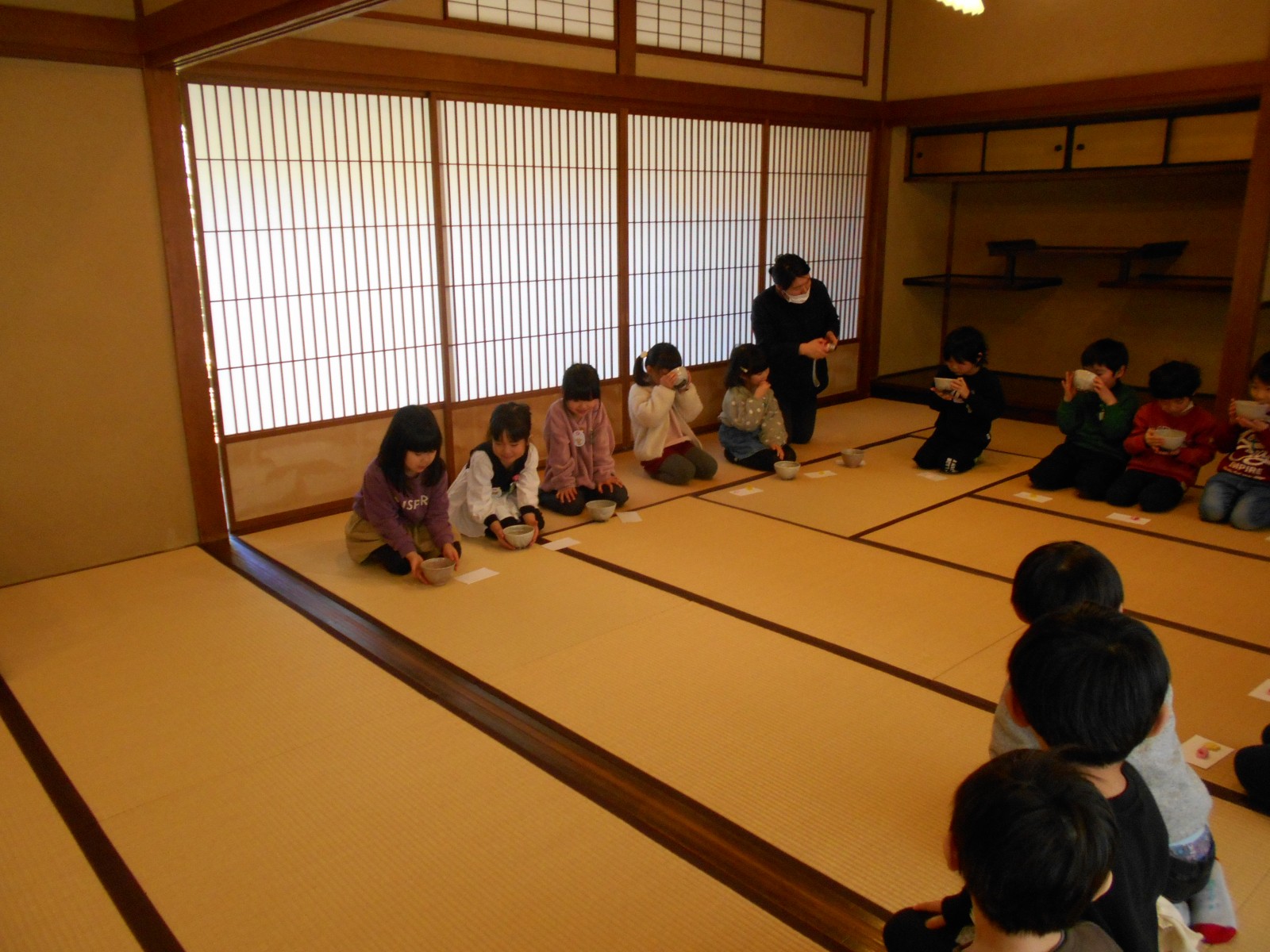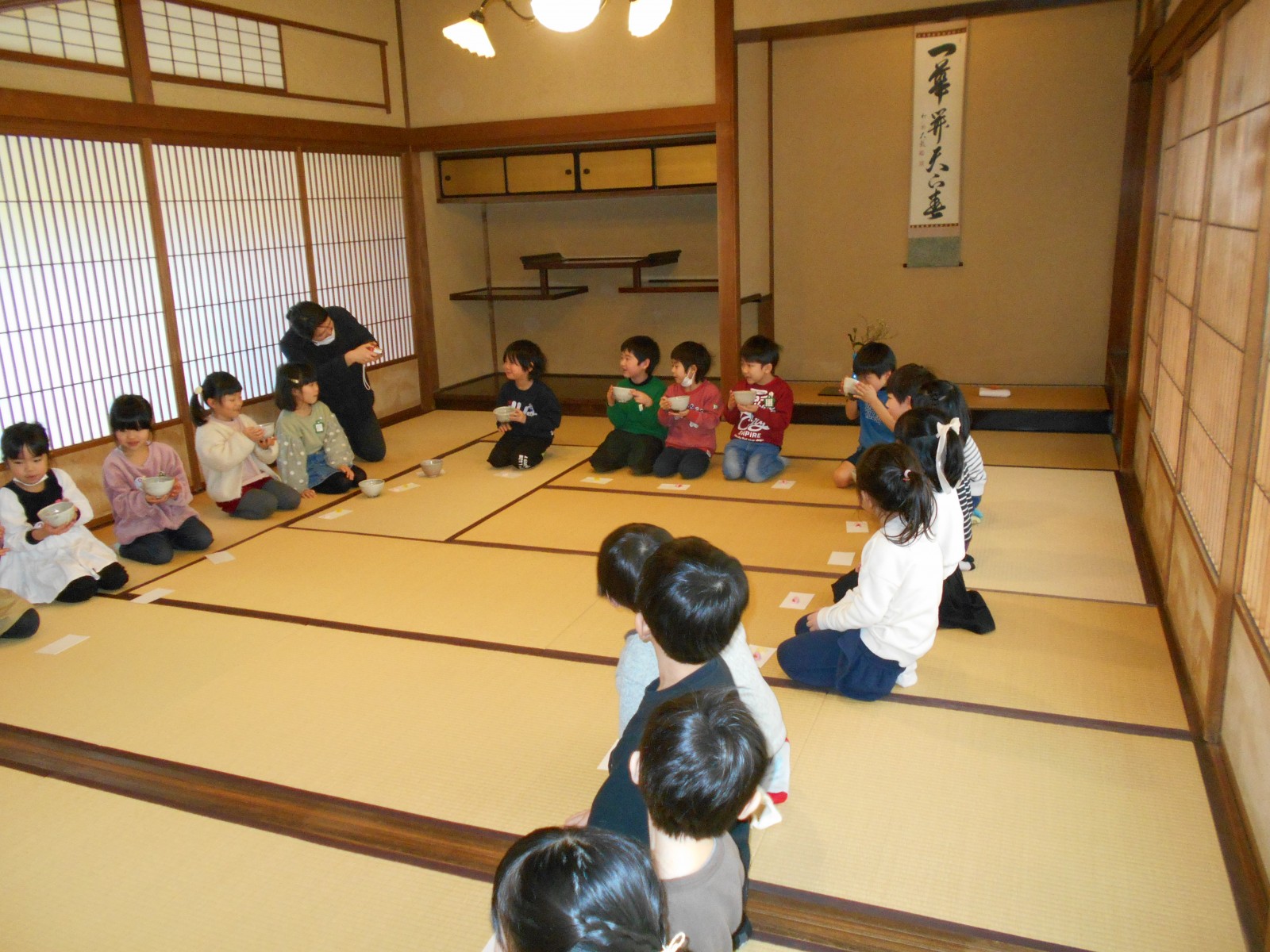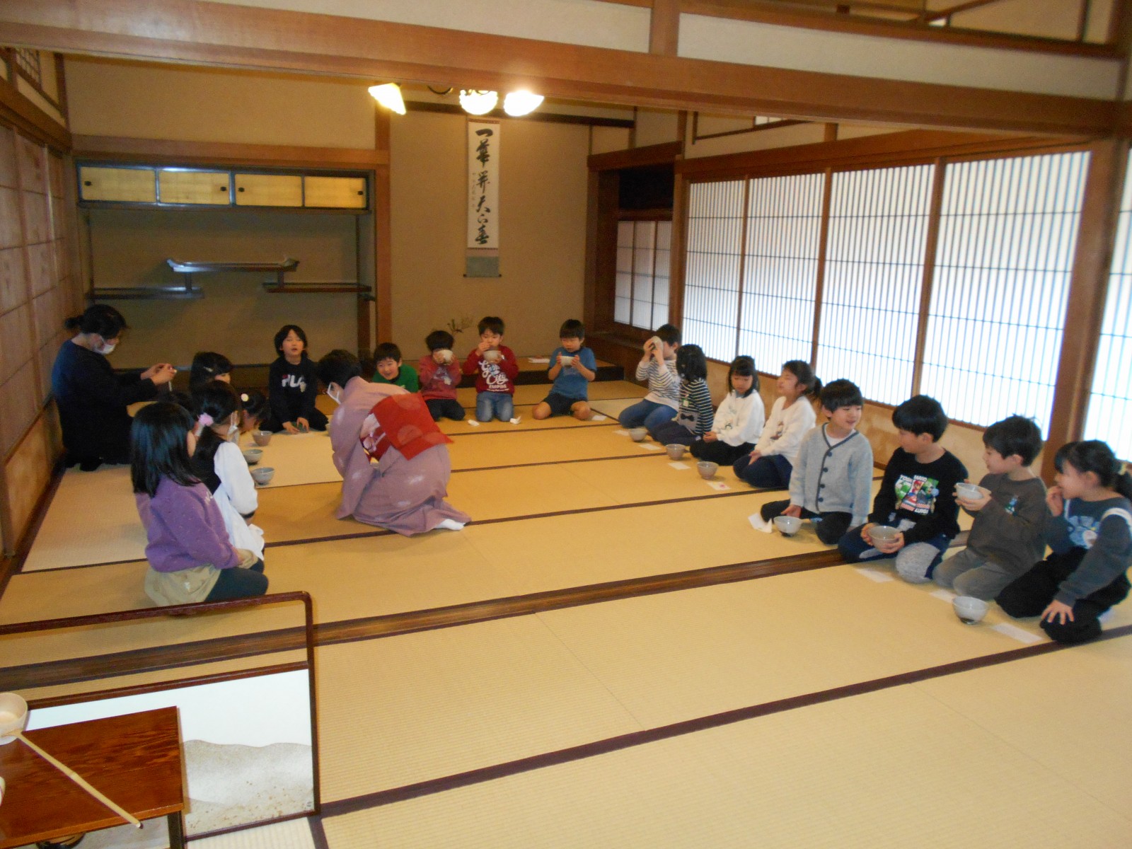 第1園と第2園の年長組さんは、白山神社の奥にある「燕喜館」というところで、お茶のお作法を教わりました。