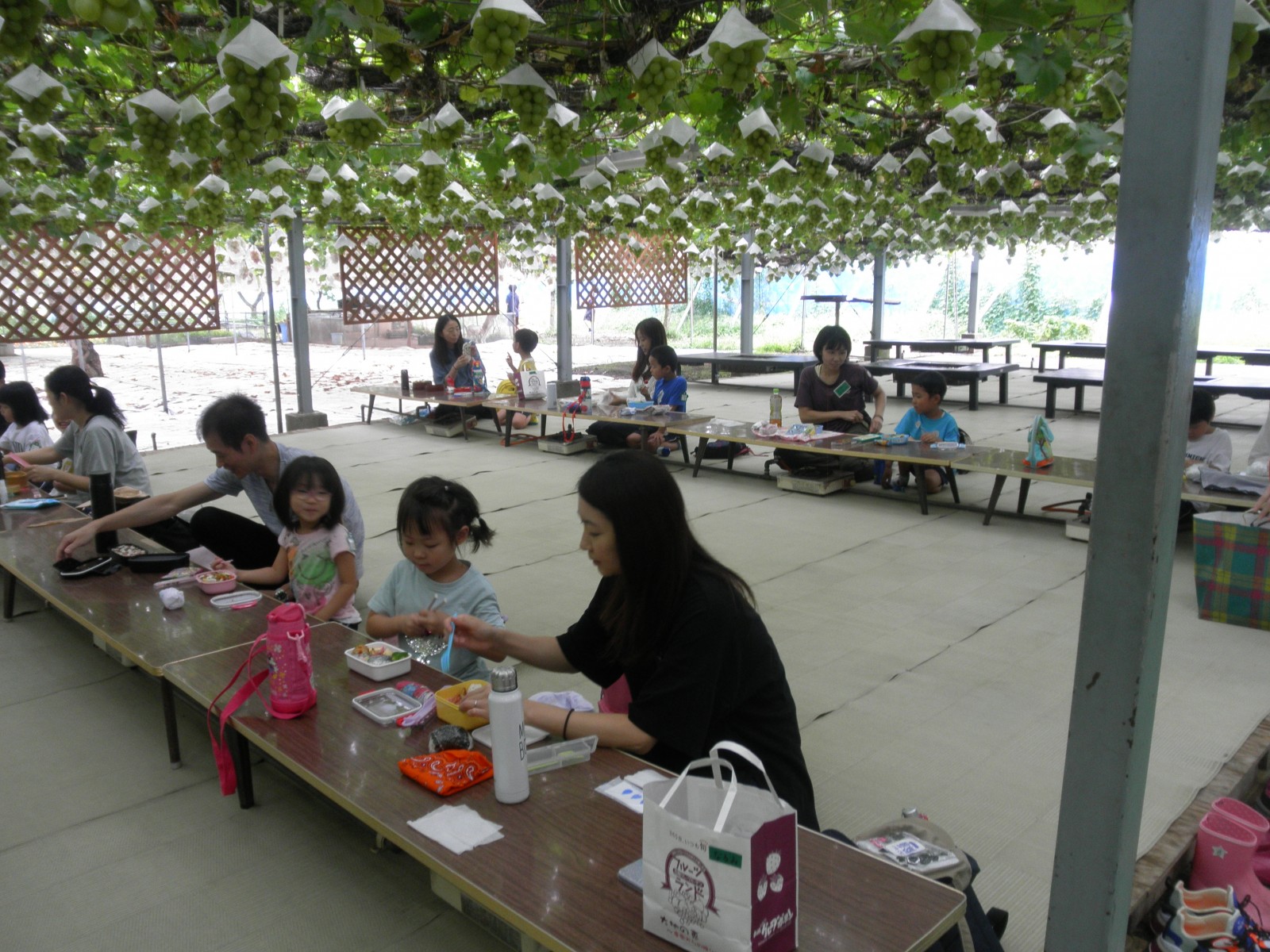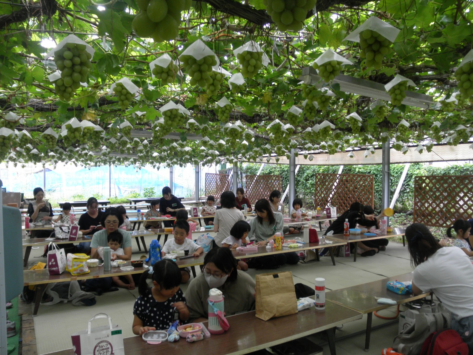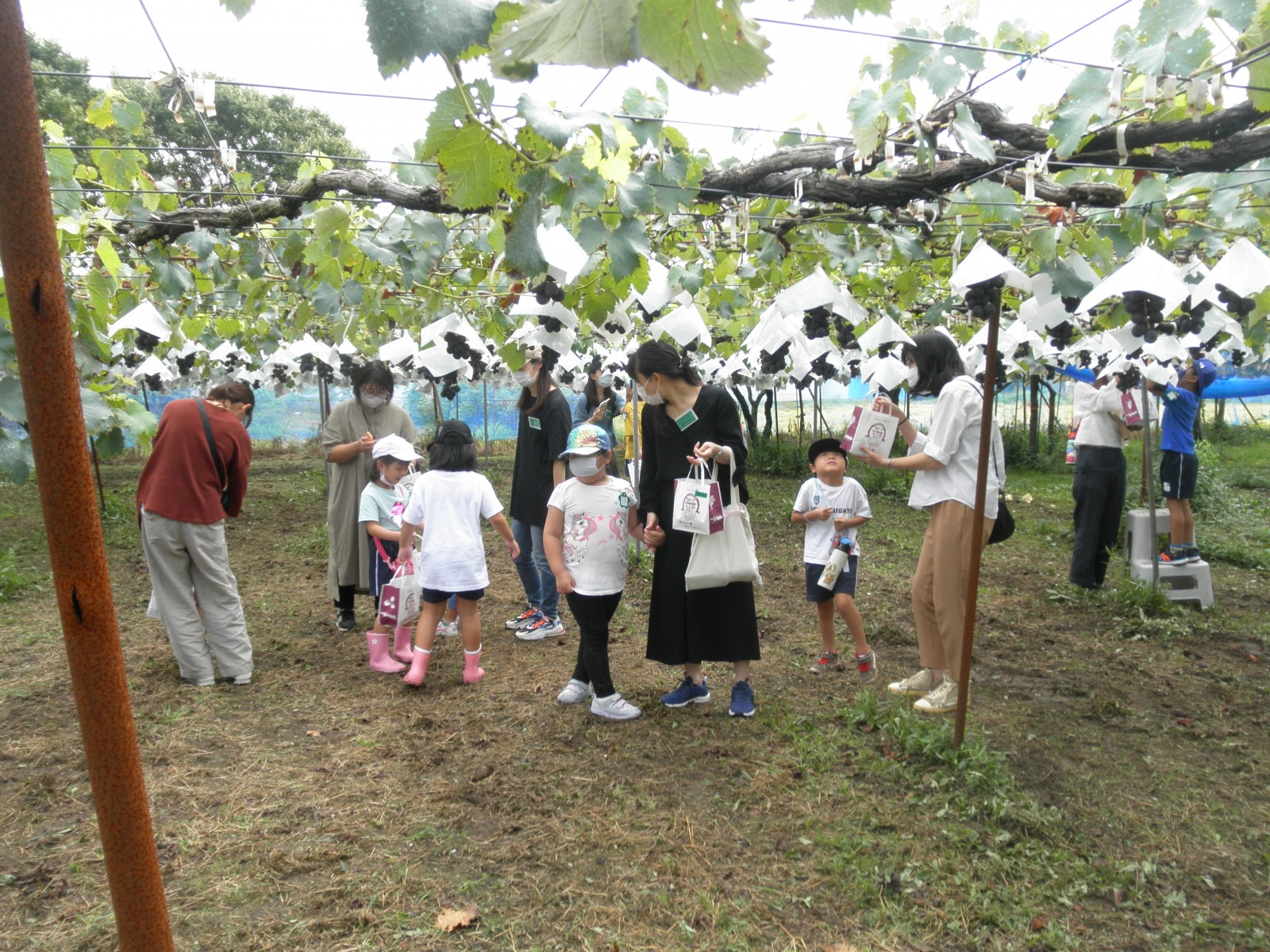 雨が心配されていましたが、無事お天気に恵まれ、白根のグレープガーデンに年長さんの親子で遠足にいってきました。行事が1学期に出来ずに実りの収穫の時期に合わせての再計画したものです。天候のせいでブドウの房が例年より小さく残念でしたがお店の方が少し増やして袋にいれてくださったので助かりました。ご配慮ありがとうござい。