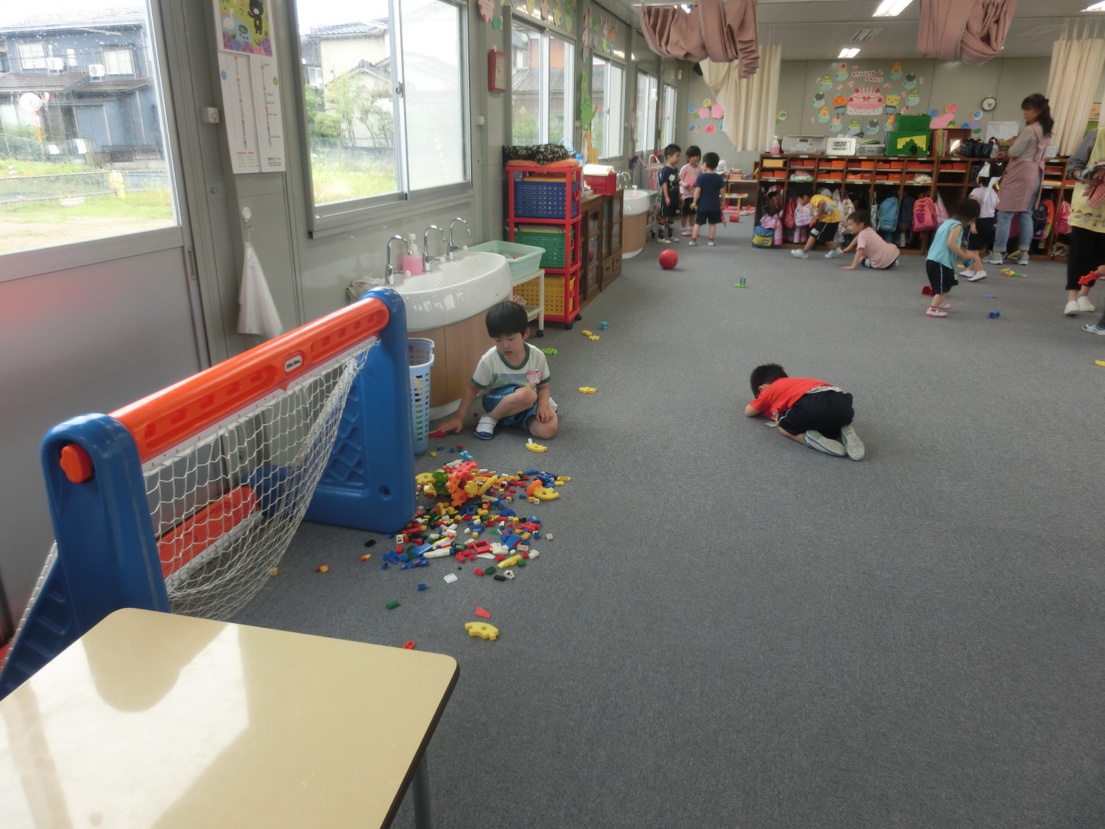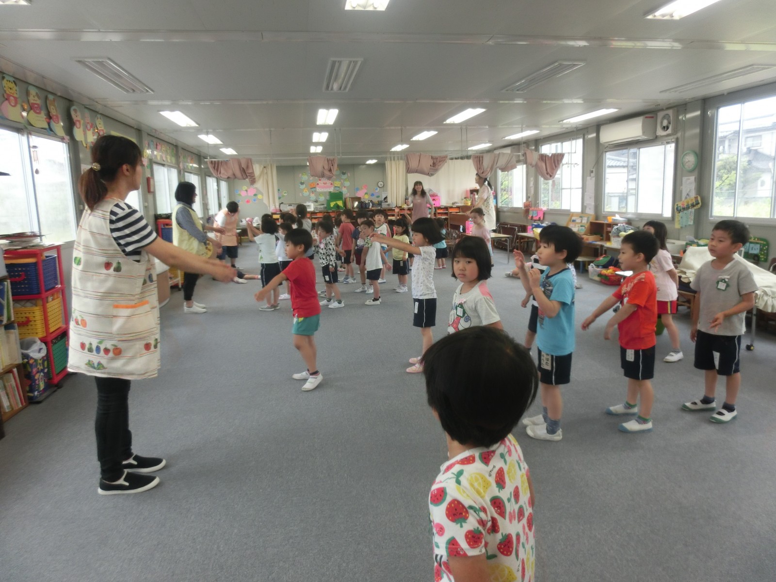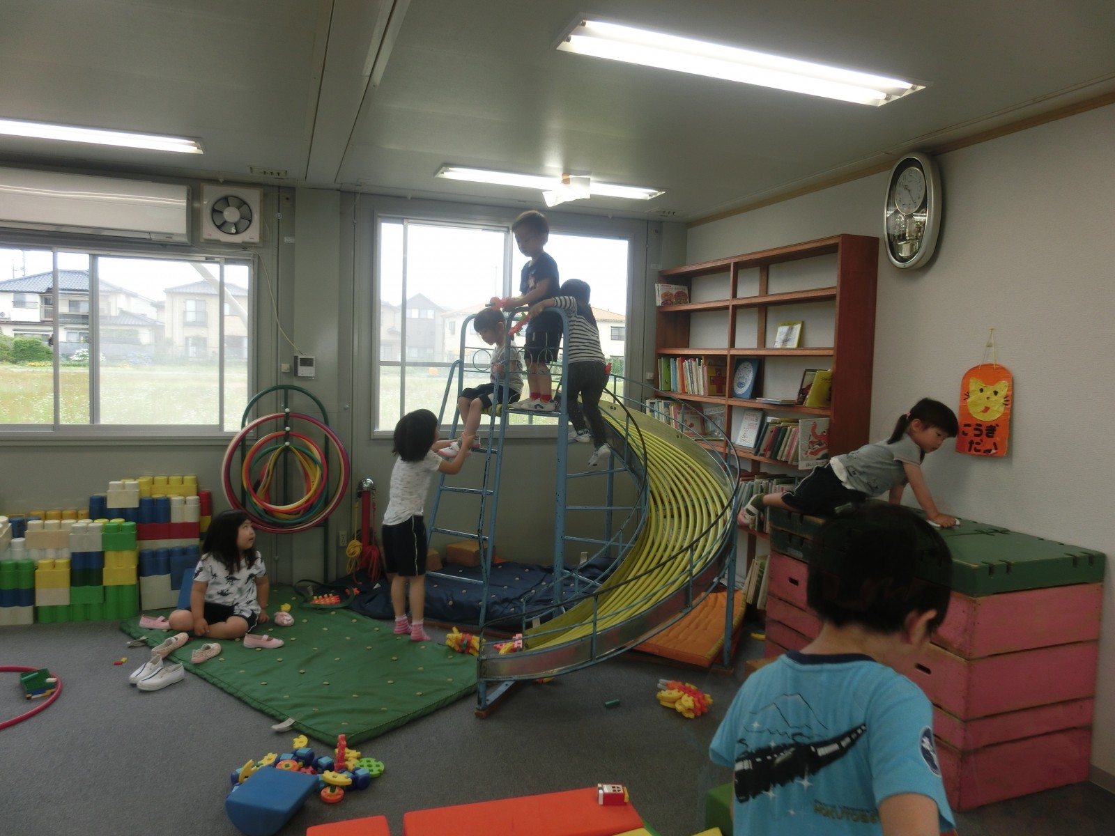 第1園の仮園舎室内遊び、体操、そして外遊びのようす