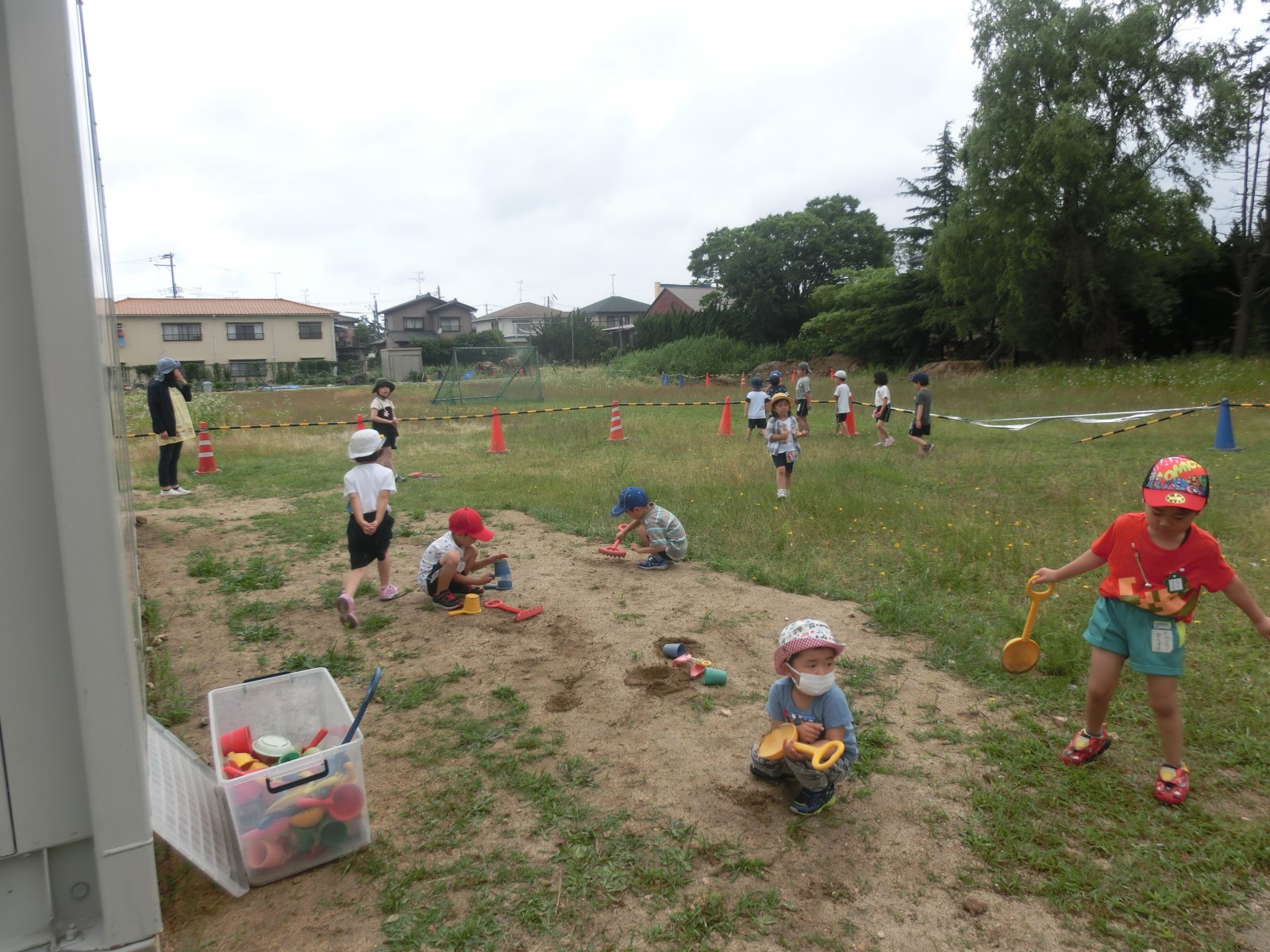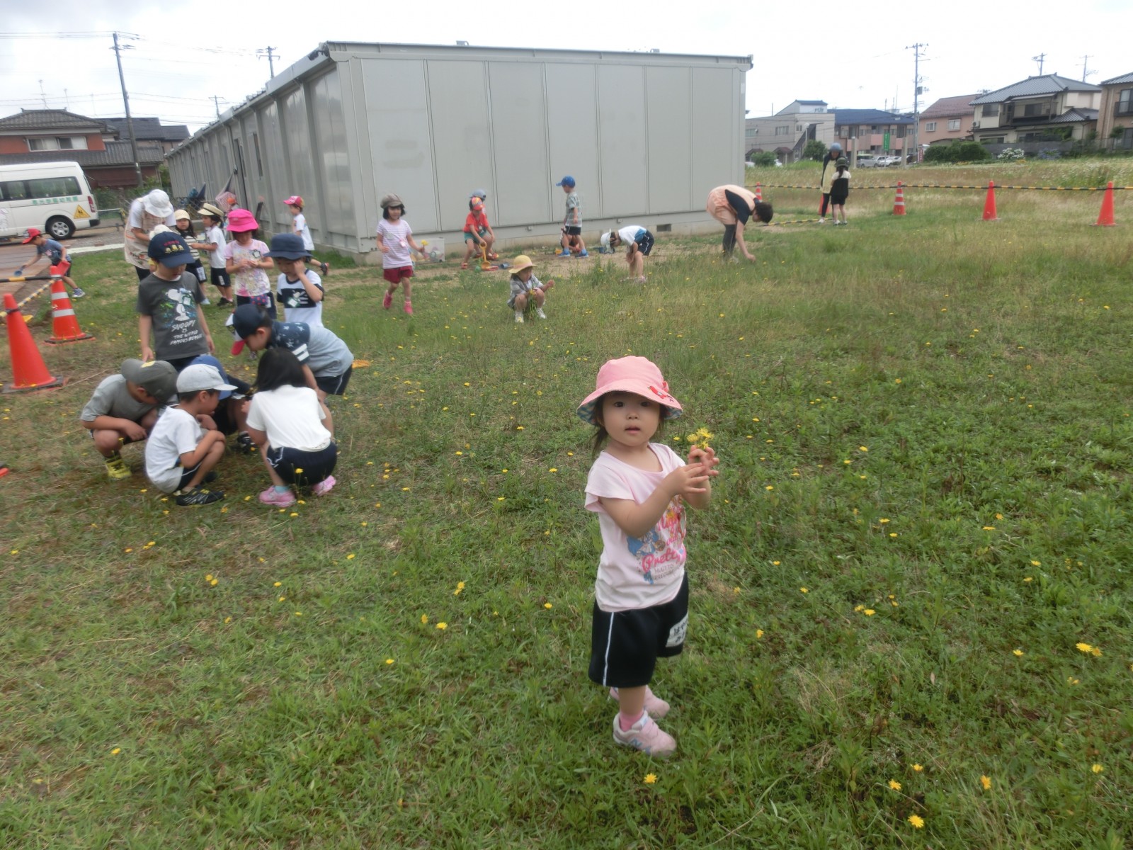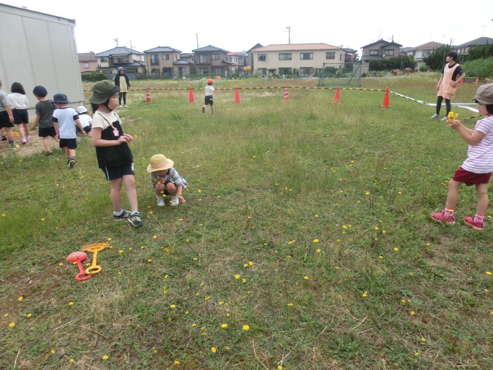 保護者の方々は、仮園舎の中がなかなか見られないので、中での遊びのようす、そして、体操の様子などをお見せします。外側は「プレハブ」という感じですが、中は意外と快適で環境が変わったことによる、子ども達の遊びがまたいろいろと広がり面白い遊びが見られます。また、近くの方が夜勤の方で昼間睡眠をとられるとのご事情を考慮して仮園舎裏の草の広場で大家さんの許可を得て遊ばせていただいていますが、これまた、みんなで黄色い野の花摘みをし、指輪にしたり、髪飾りにしたり、隙間で道路工事ごっこをしたりと林の中のような雰囲気であそんでいます。6月20日と21日の仮園舎での室内の遊びのようすと体操のようす、そして、仮園舎の裏っかわの広場での遊びのようすをアップしました。バッタが飛んでいたり、カッコウが時折鳴いたり、都会と思えない素敵な空間です。