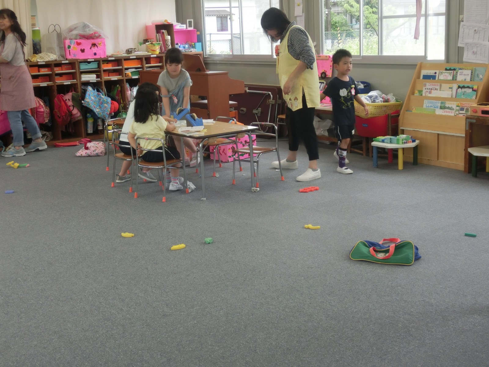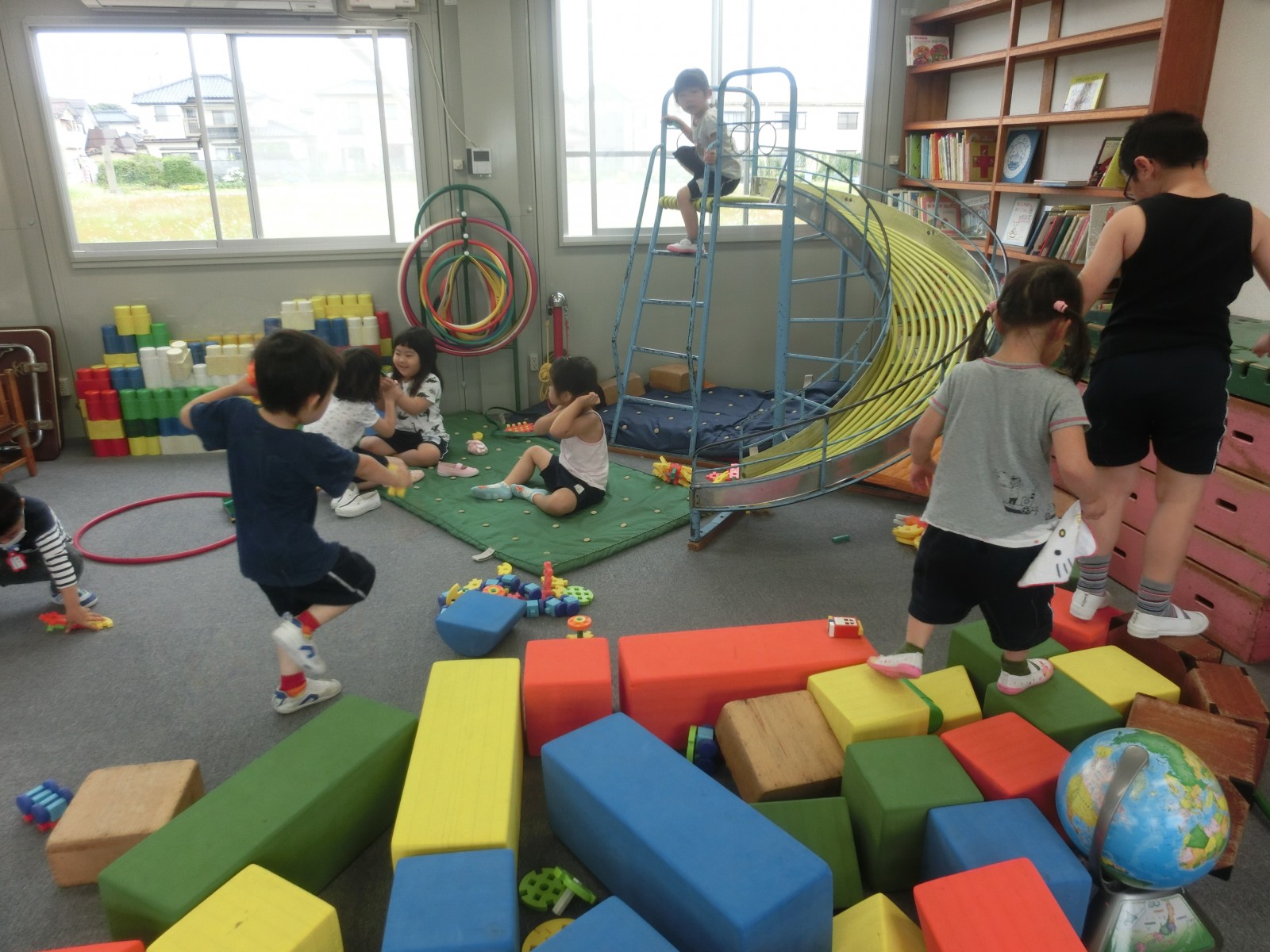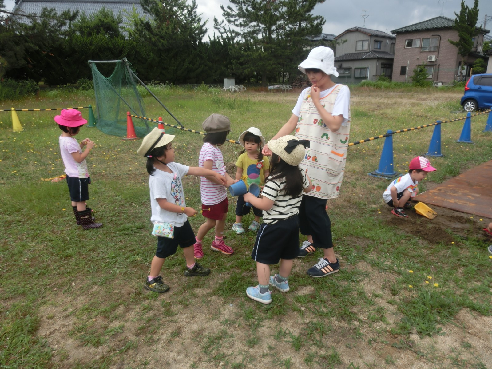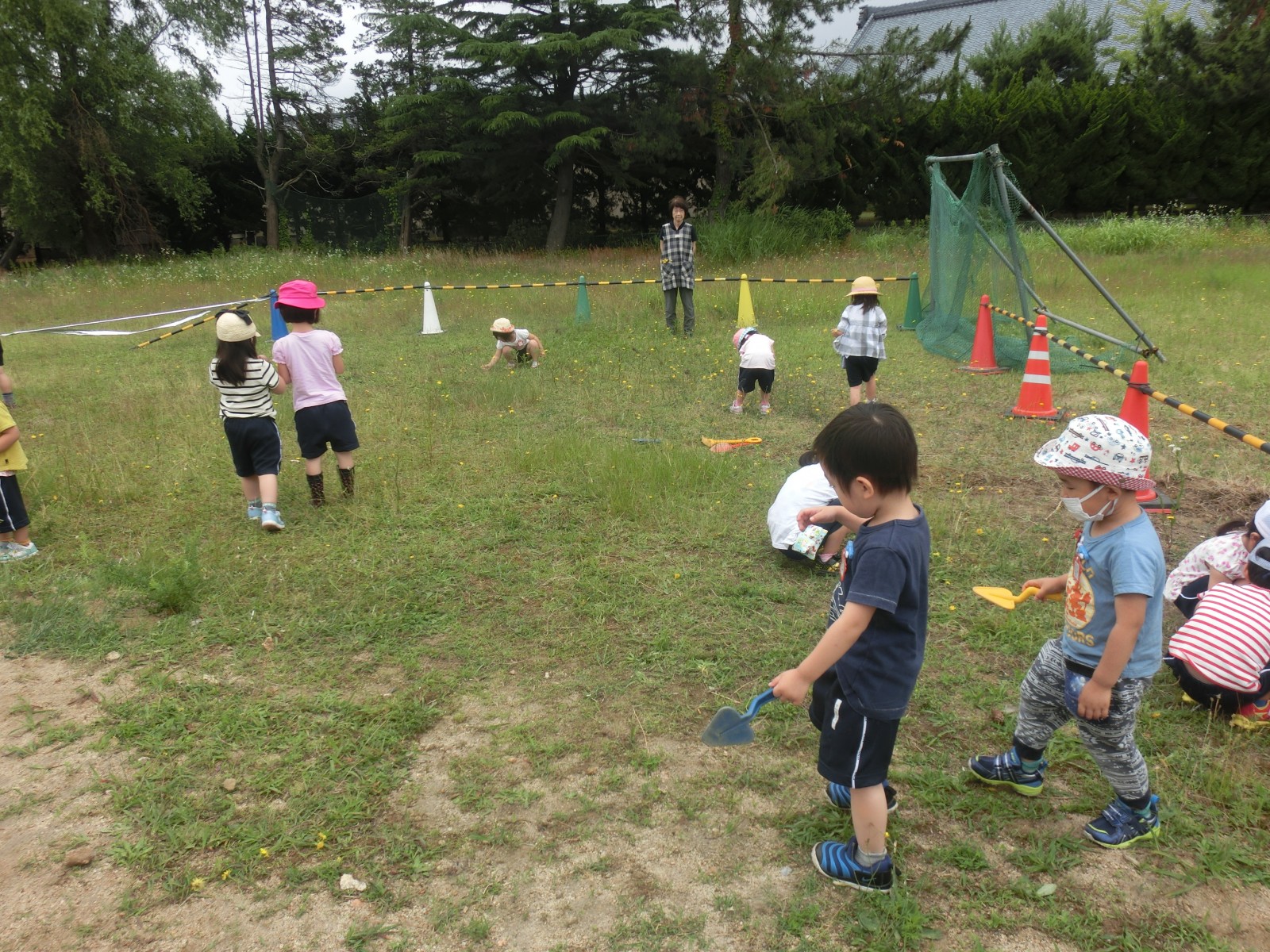 保護者の方々は、仮園舎の中がなかなか見られないので、中での遊びのようす、そして、体操の様子などをお見せします。外側は「プレハブ」という感じですが、中は意外と快適で環境が変わったことによる、子ども達の遊びがまたいろいろと広がり面白い遊びが見られます。また、近くの方が夜勤の方で昼間睡眠をとられるとのご事情を考慮して仮園舎裏の草の広場で大家さんの許可を得て遊ばせていただいていますが、これまた、みんなで黄色い野の花摘みをし、指輪にしたり、髪飾りにしたり、隙間で道路工事ごっこをしたりと林の中のような雰囲気であそんでいます。6月20日と21日の仮園舎での室内の遊びのようすと体操のようす、そして、仮園舎の裏っかわの広場での遊びのようすをアップしました。バッタが飛んでいたり、カッコウが時折鳴いたり、都会と思えない素敵な空間です。
