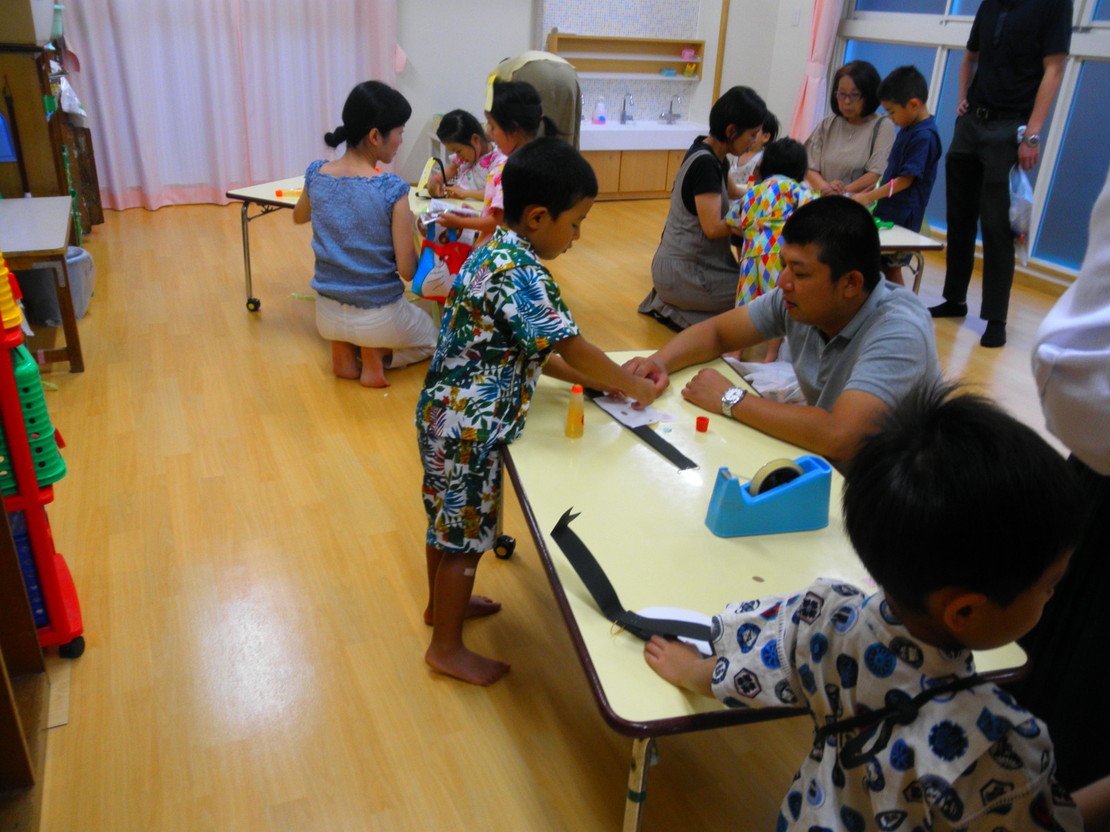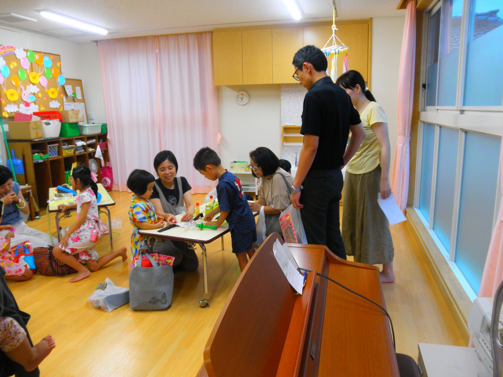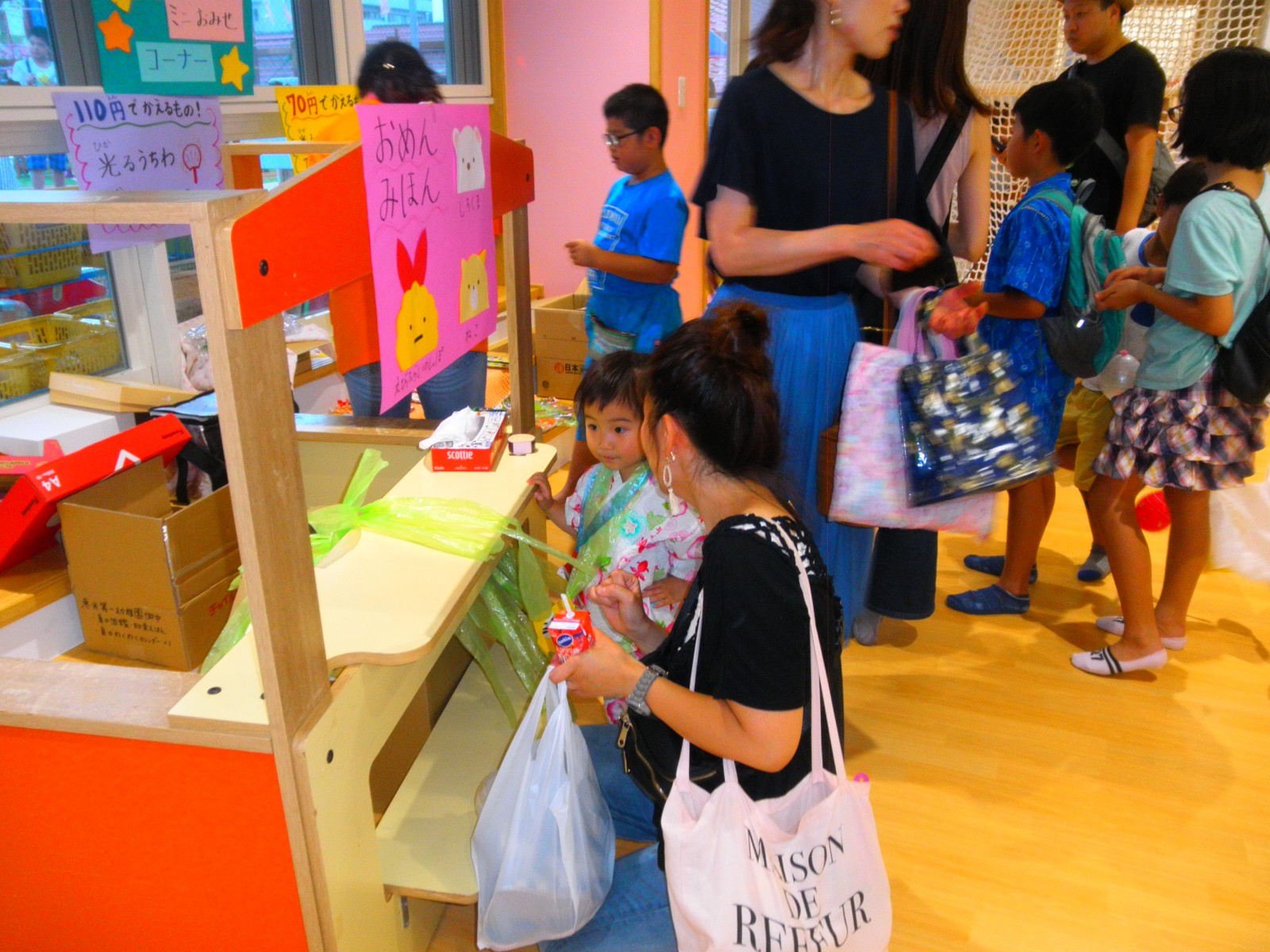 新園舎になって初めての夜祭りを29日に行いました。遠方から卒園生も来てくれてにぎやかに夜店のゲームやお面作りで楽しみました。黄昏の頃、年長さんが作ったおみこしを運び輪になってまんまる音頭を卒園生も一緒に踊りました。遠いところからありがとう!