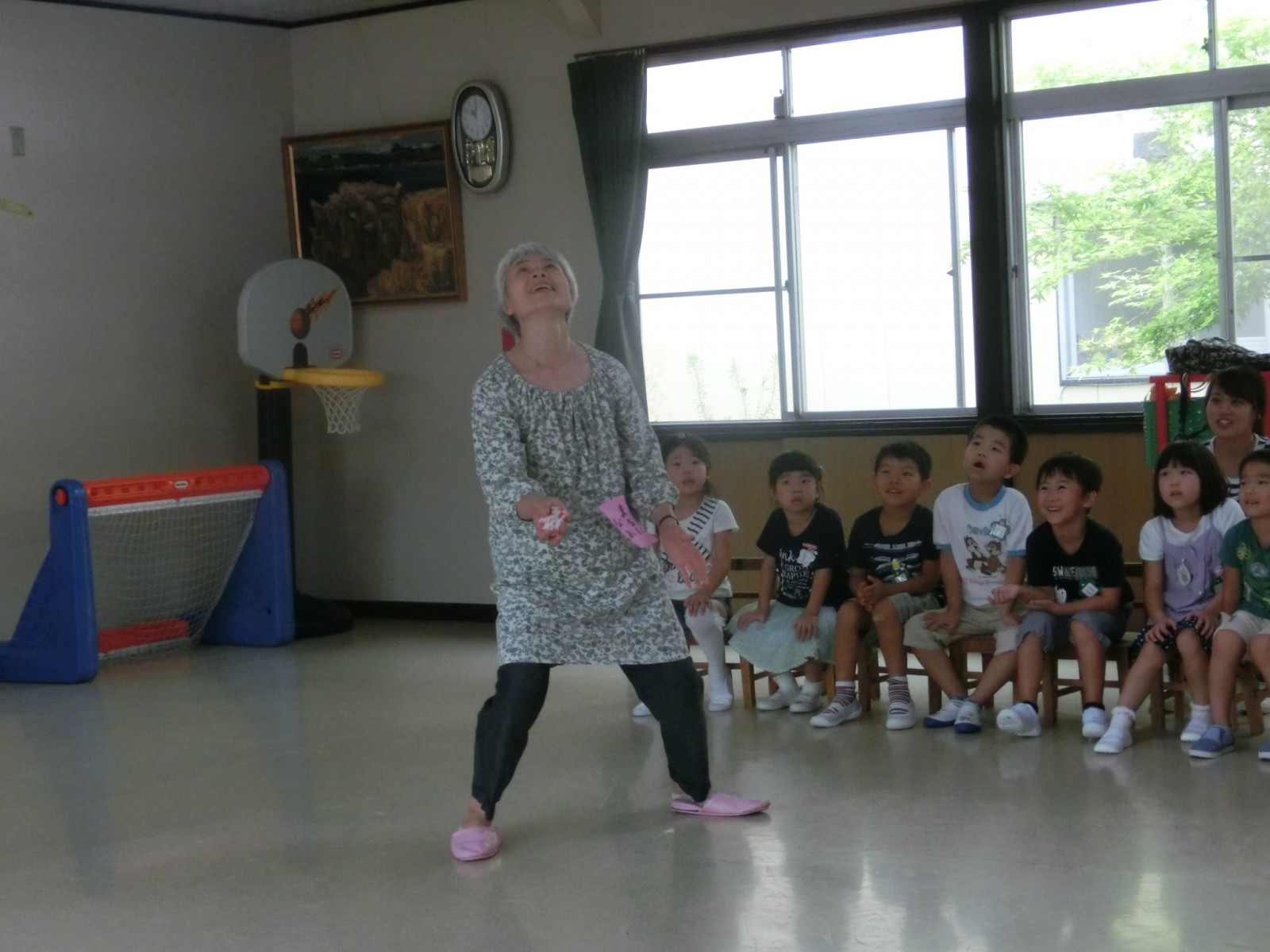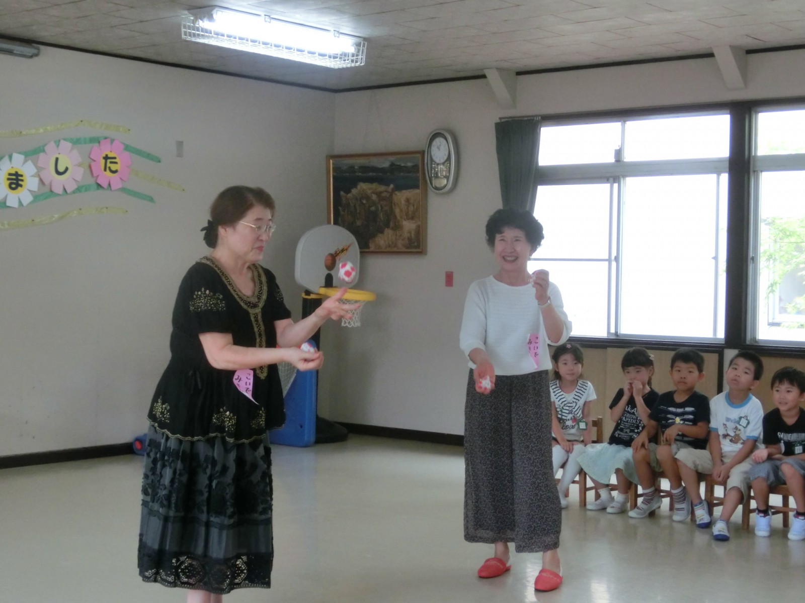 おばあちゃま達からはお手玉の披露もあり、こどもたちは大喜びです。最後はみんなでいろんなおじいちゃん達に「肩たたき」のプレゼントをしました。力が強すぎたり、弱すぎたりと、いろんなたたき方がありましたが、子供たちの「やさしさ」は肩の中に伝わったのでは・・・と思っています。ありがとうございました。子供たちの「おもてなし」のお茶とお菓子はおいしかったでしょうか?