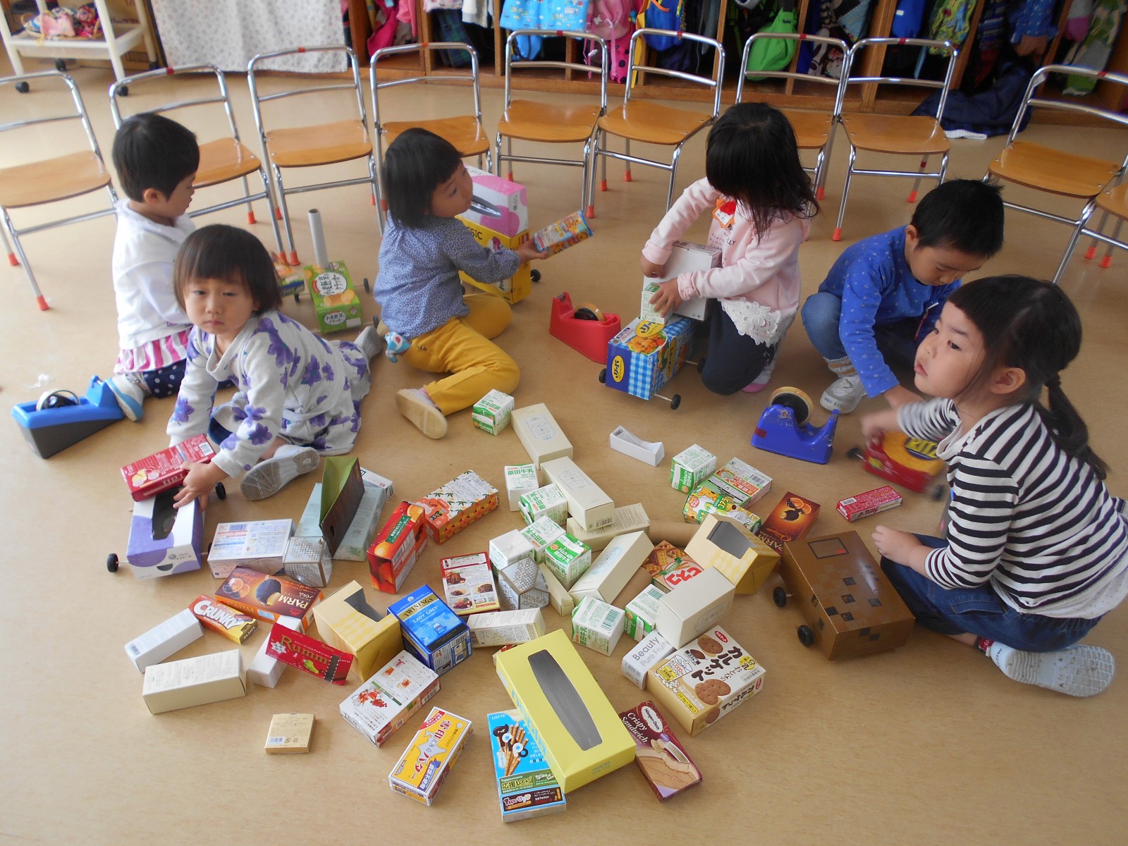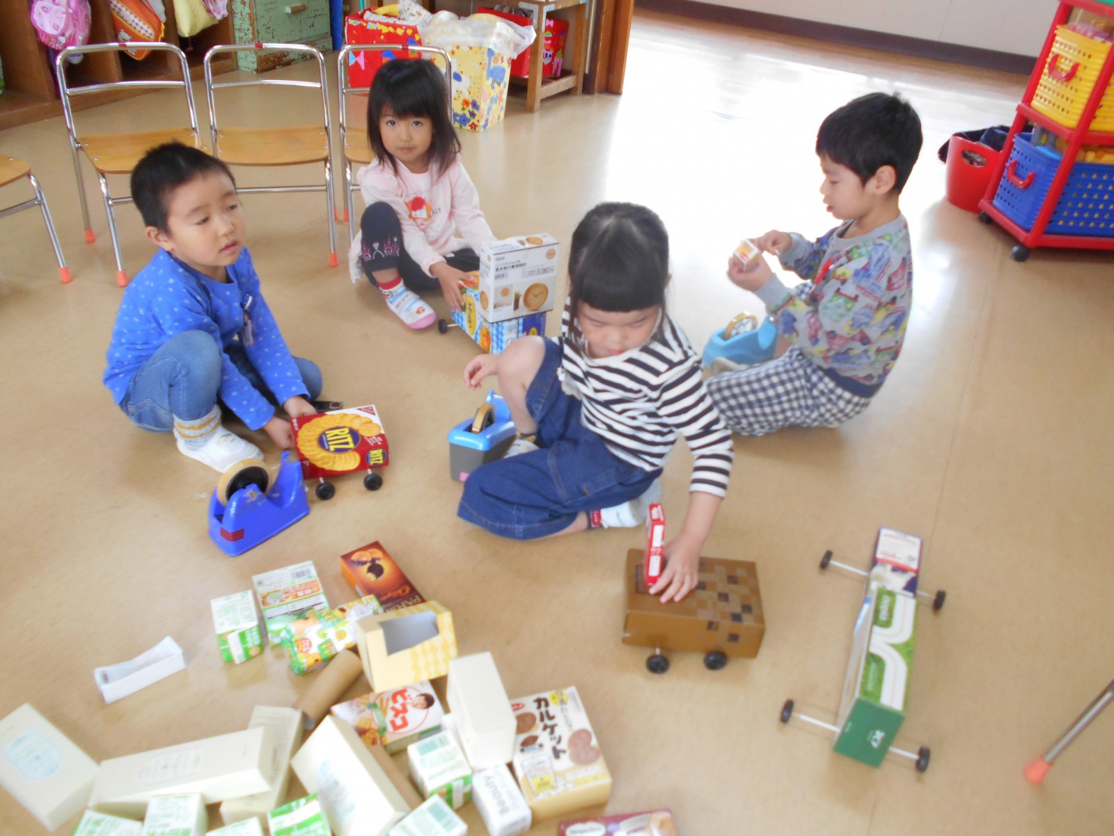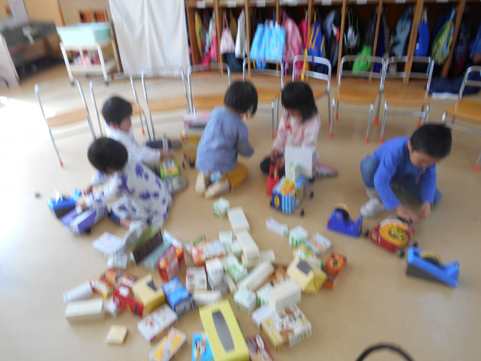 すみれ組さんは、大好きな新幹線や車を作ろうと、お菓子の箱などを持ち寄って、作り始めました。