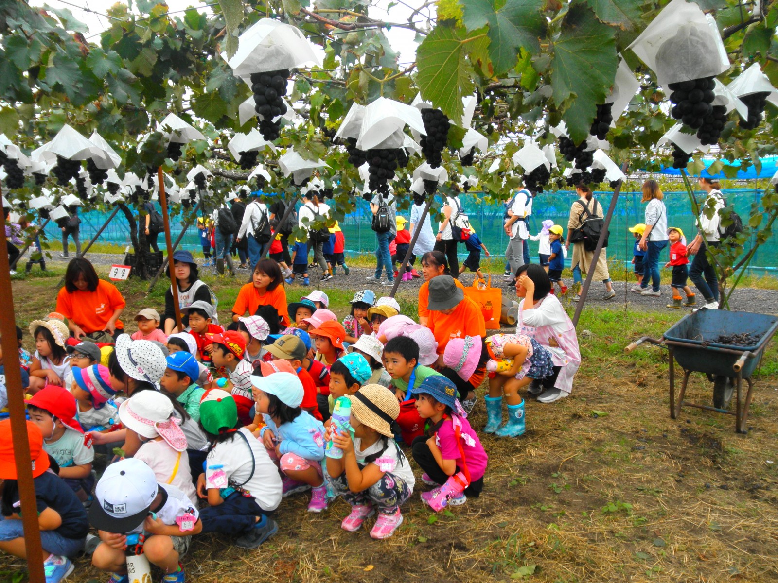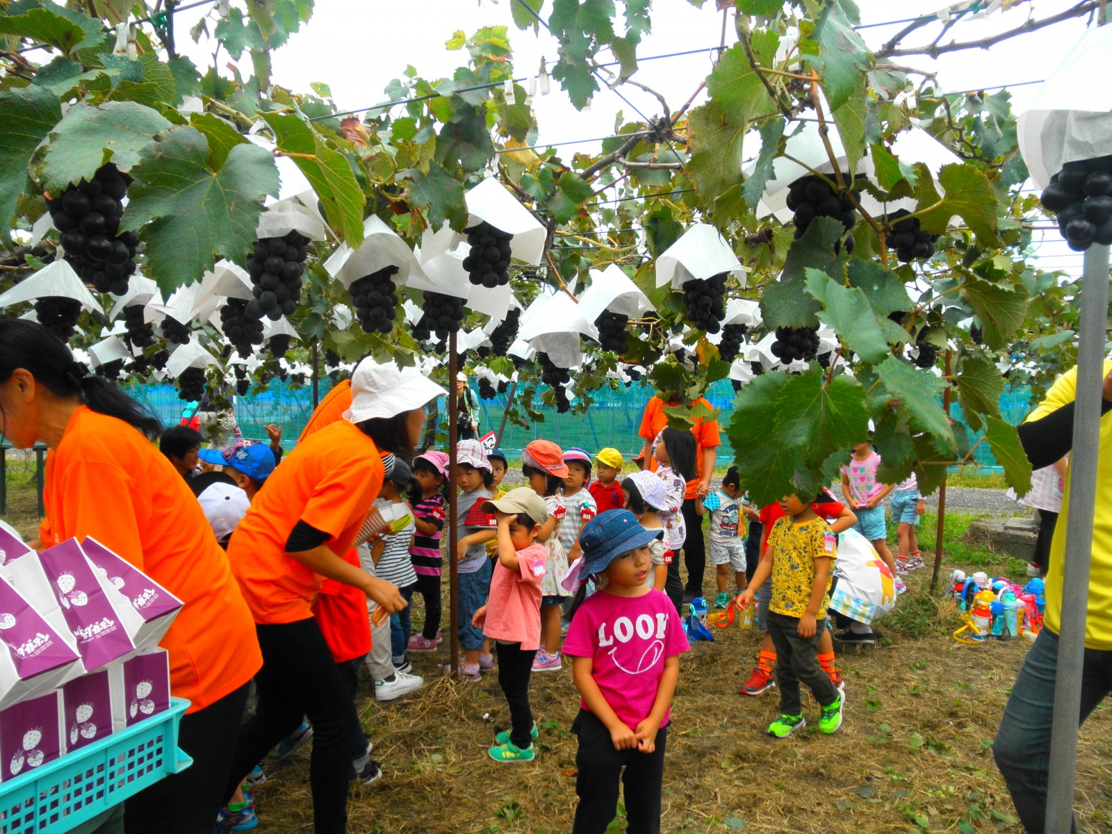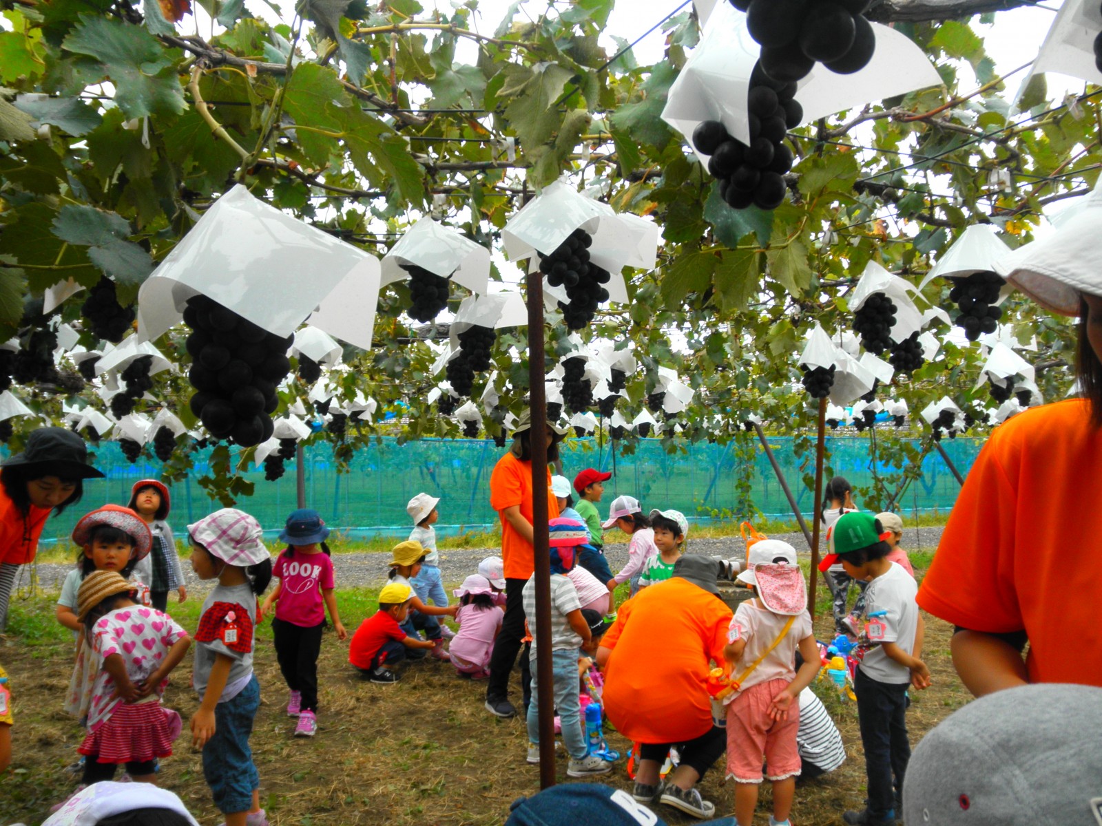 グレープガーデンにぶどう狩りにいってきました。台風の後で、ぶどうが落ちた被害もあったとか。でもおいしいぶどうの実りに感謝しつつみんなで「どれにしようかな」と選びました。動物と遊んでいる楽しい写真もあったのですが他の園の方達が写っていたのでアップできませんでした。残念!