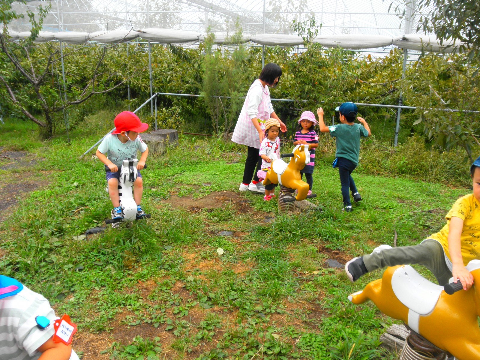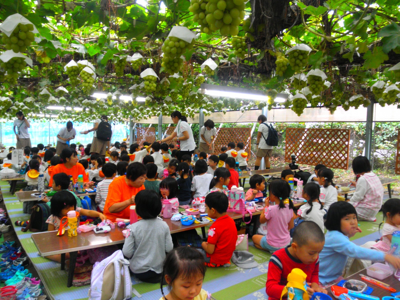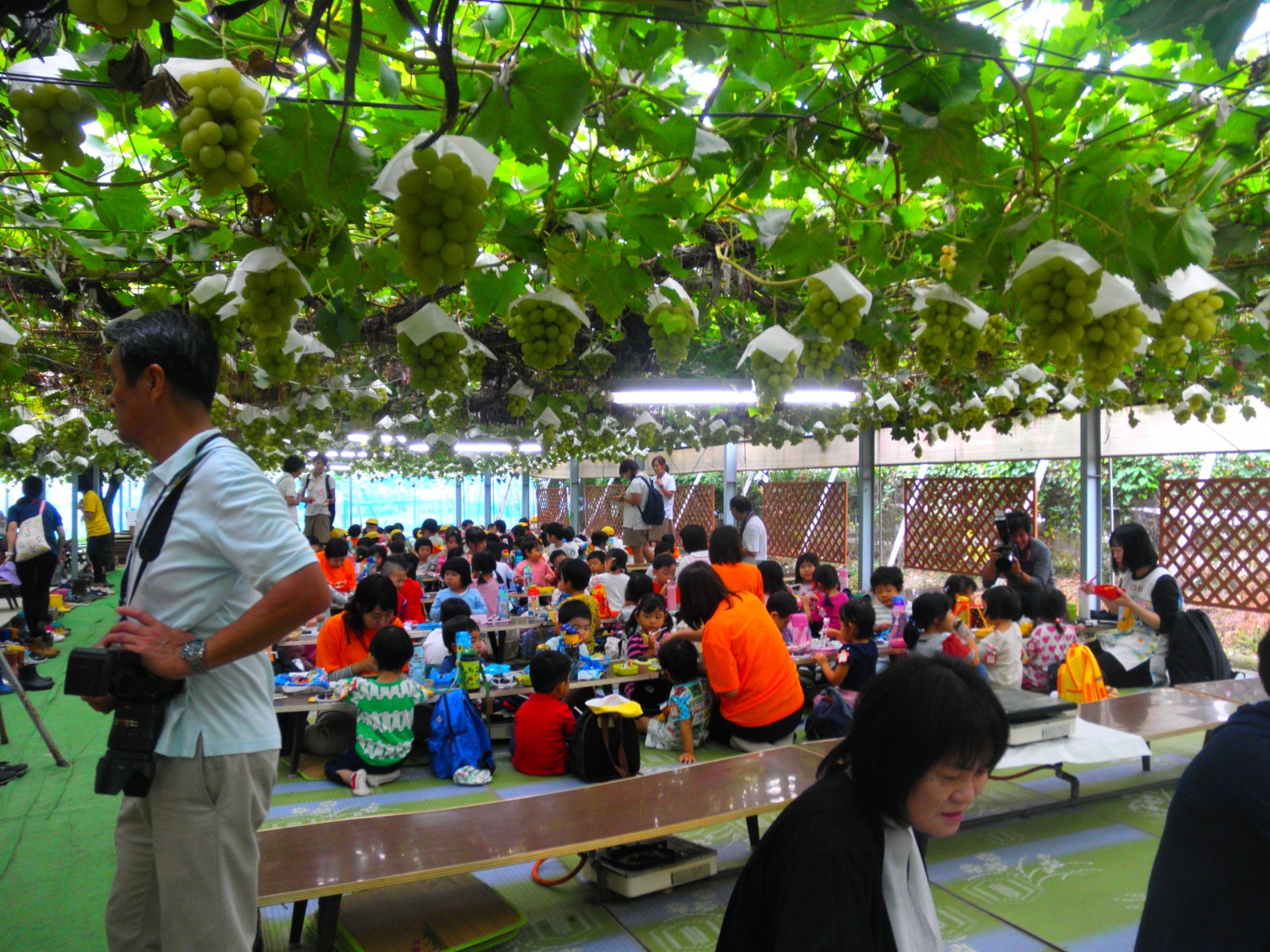 グレープガーデンにぶどう狩りにいってきました。台風の後で、ぶどうが落ちた被害もあったとか。でもおいしいぶどうの実りに感謝しつつみんなで「どれにしようかな」と選びました。動物と遊んでいる楽しい写真もあったのですが他の園の方達が写っていたのでアップできませんでした。残念!