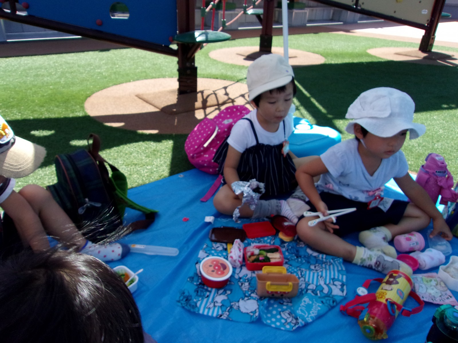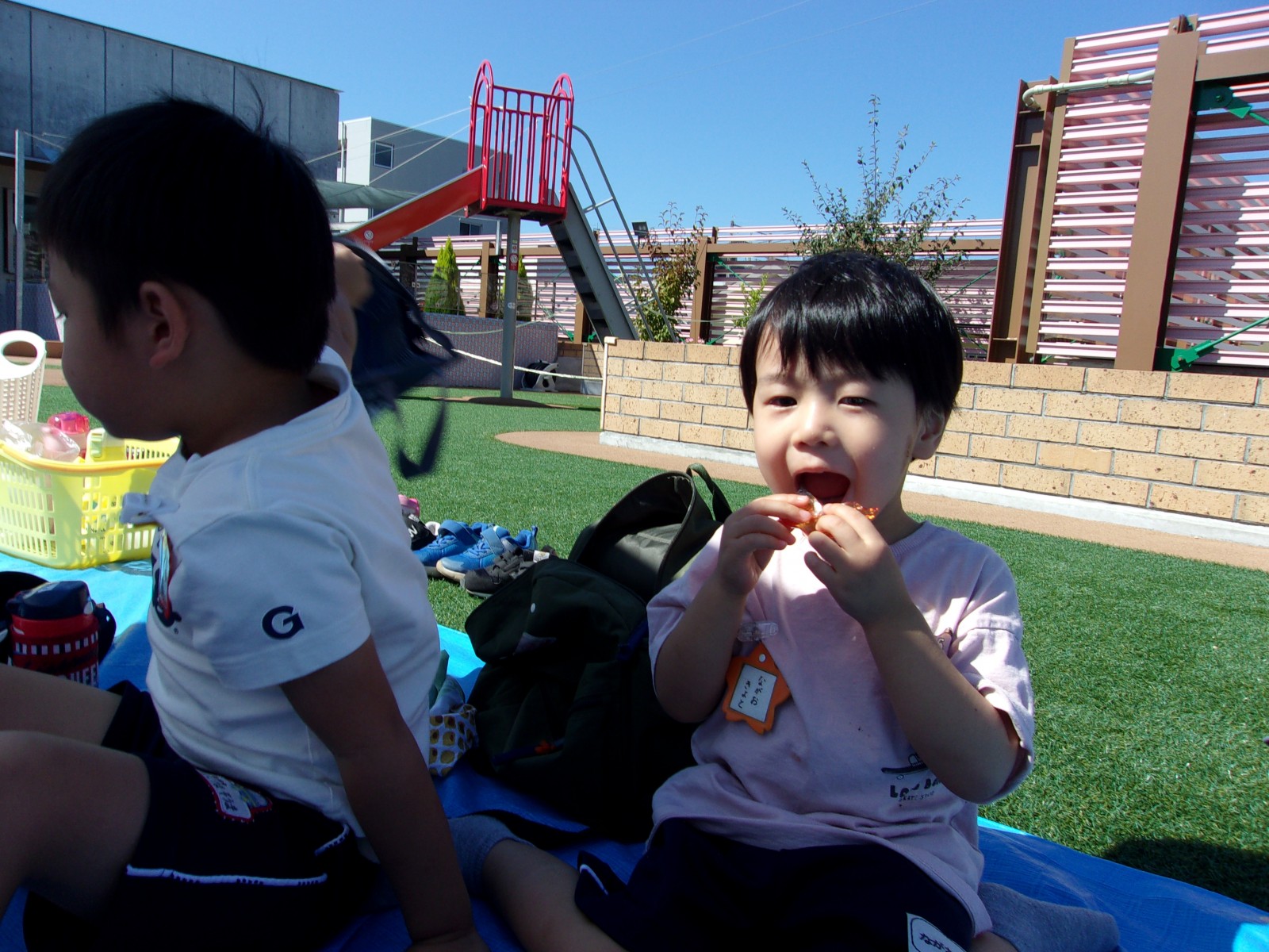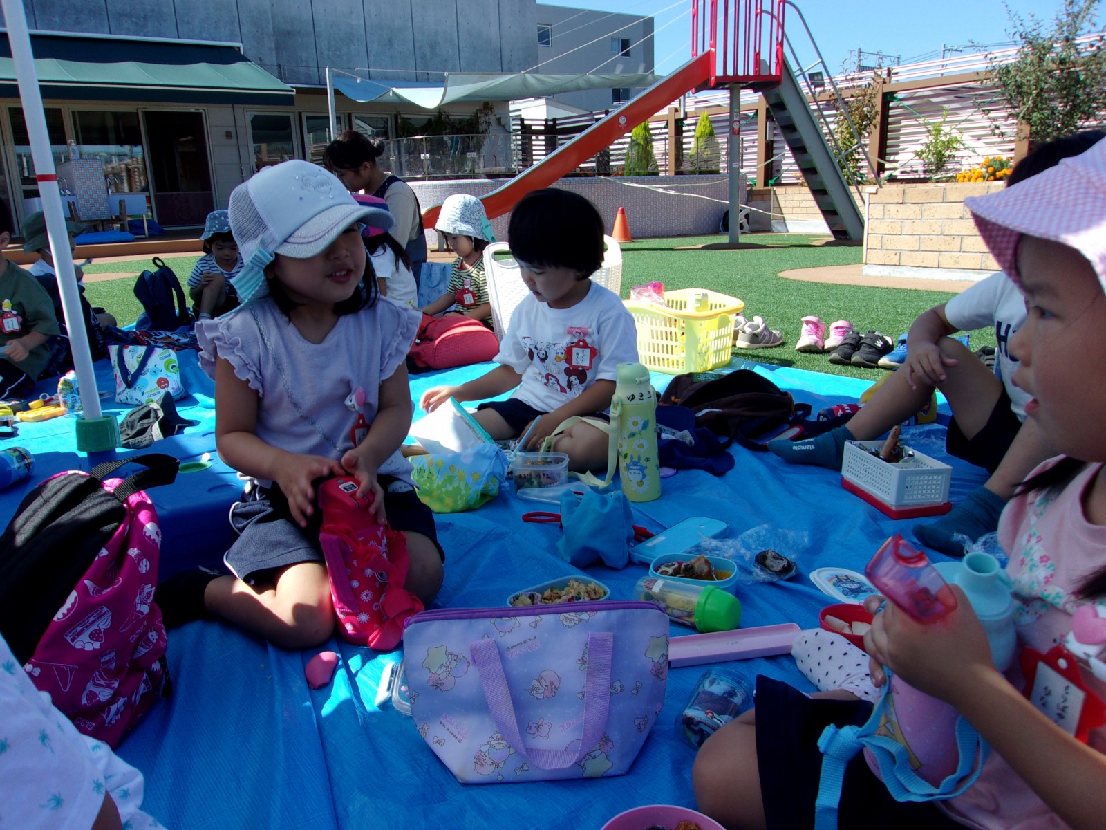 ひよこ・すみれ組さんは幼稚園に戻ってから、青空の下園庭で楽しみにしていたお弁当タイムでした!