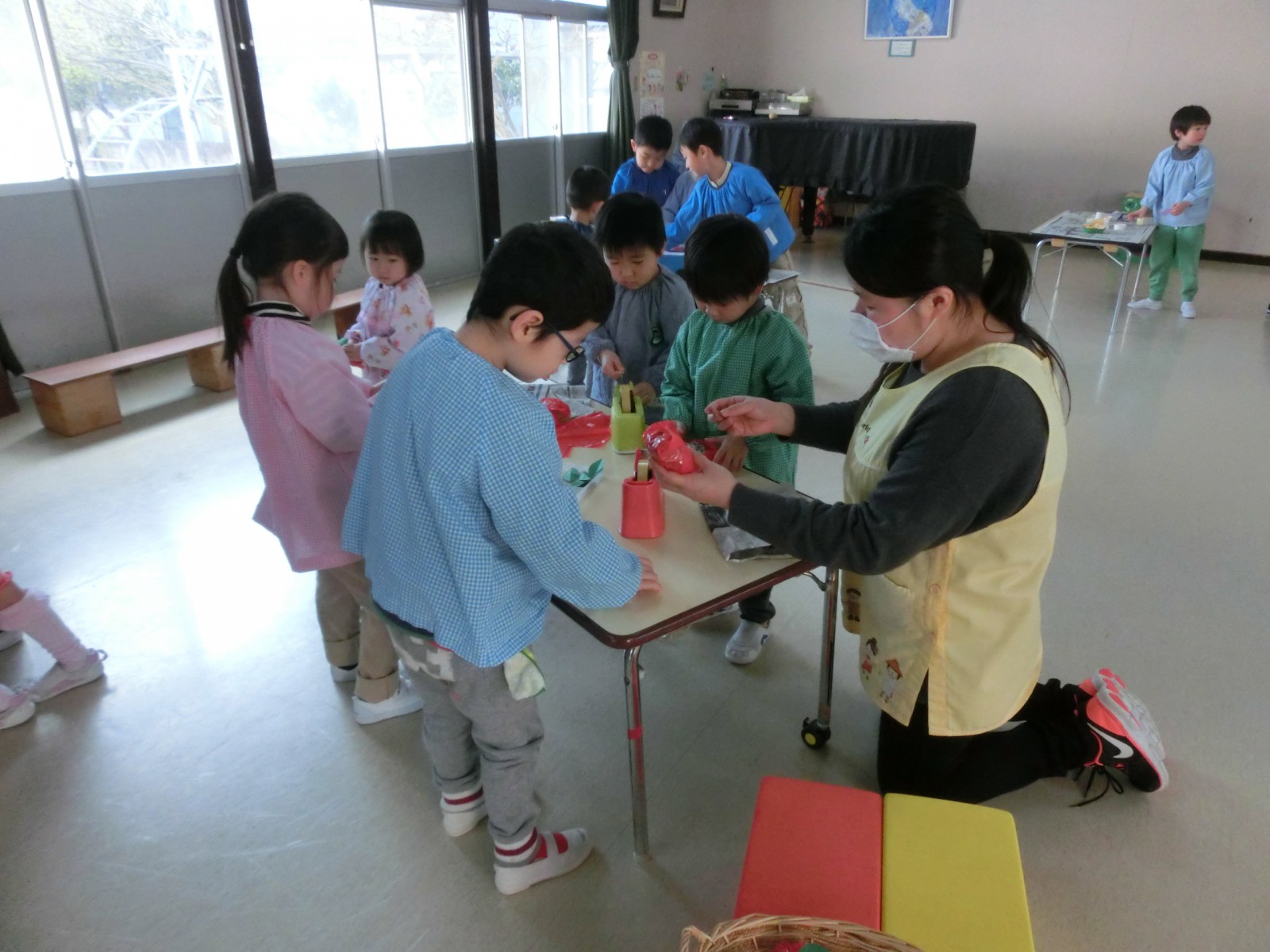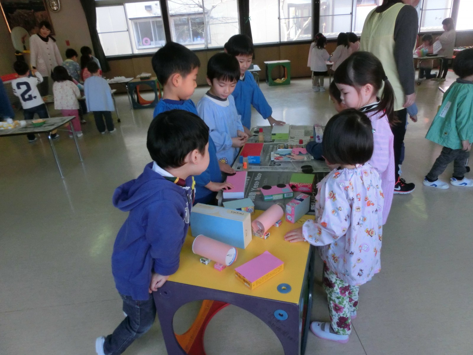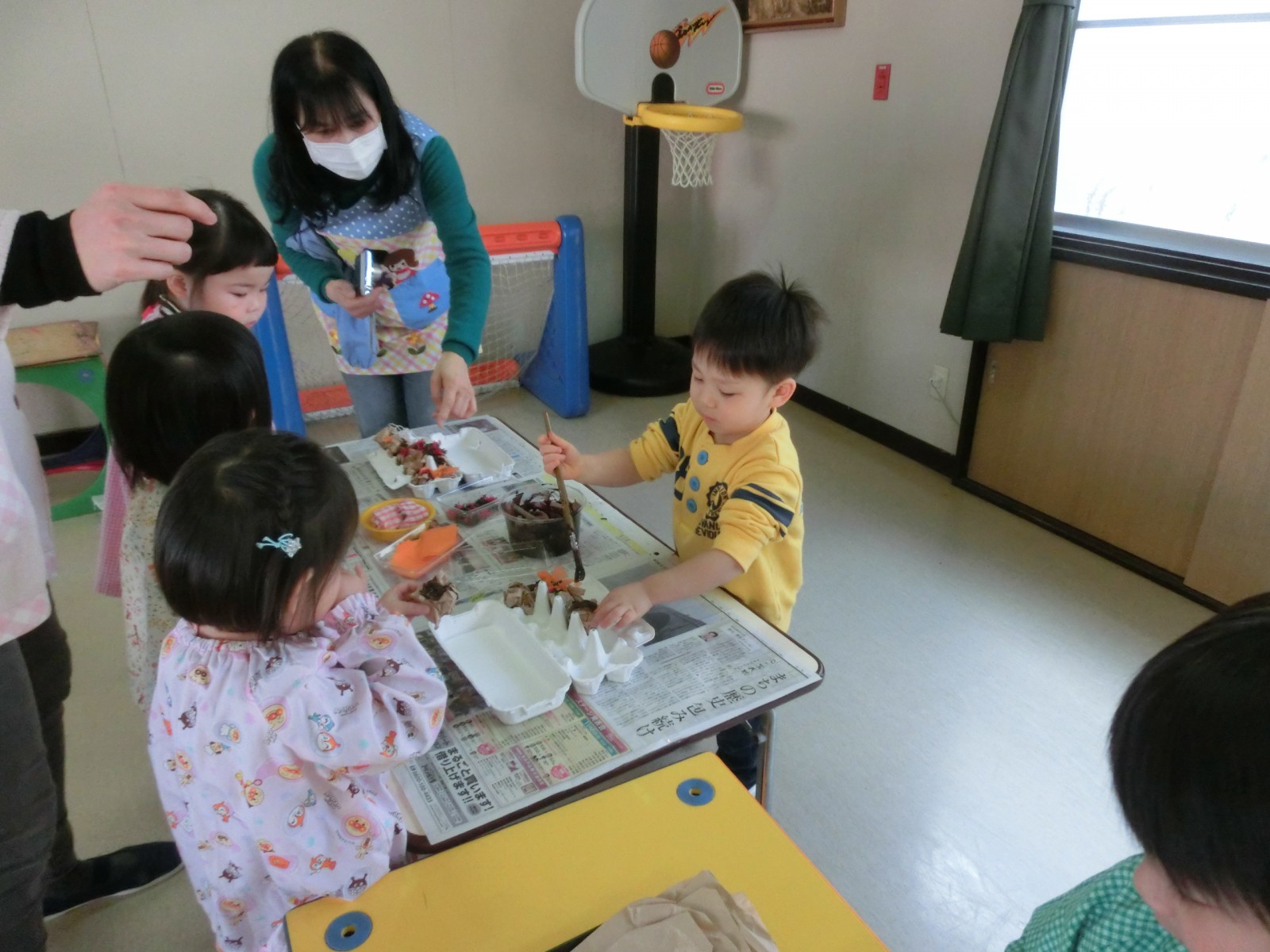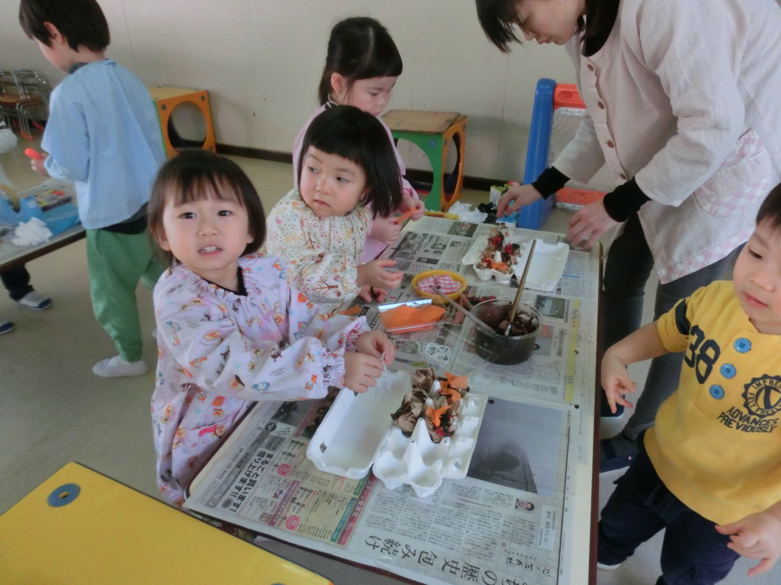 2月10日におみせやさんごっこの為の「みんな工場」が開かれました。車、飴、綿あめ、お団子、おもち、カメラ、お魚、