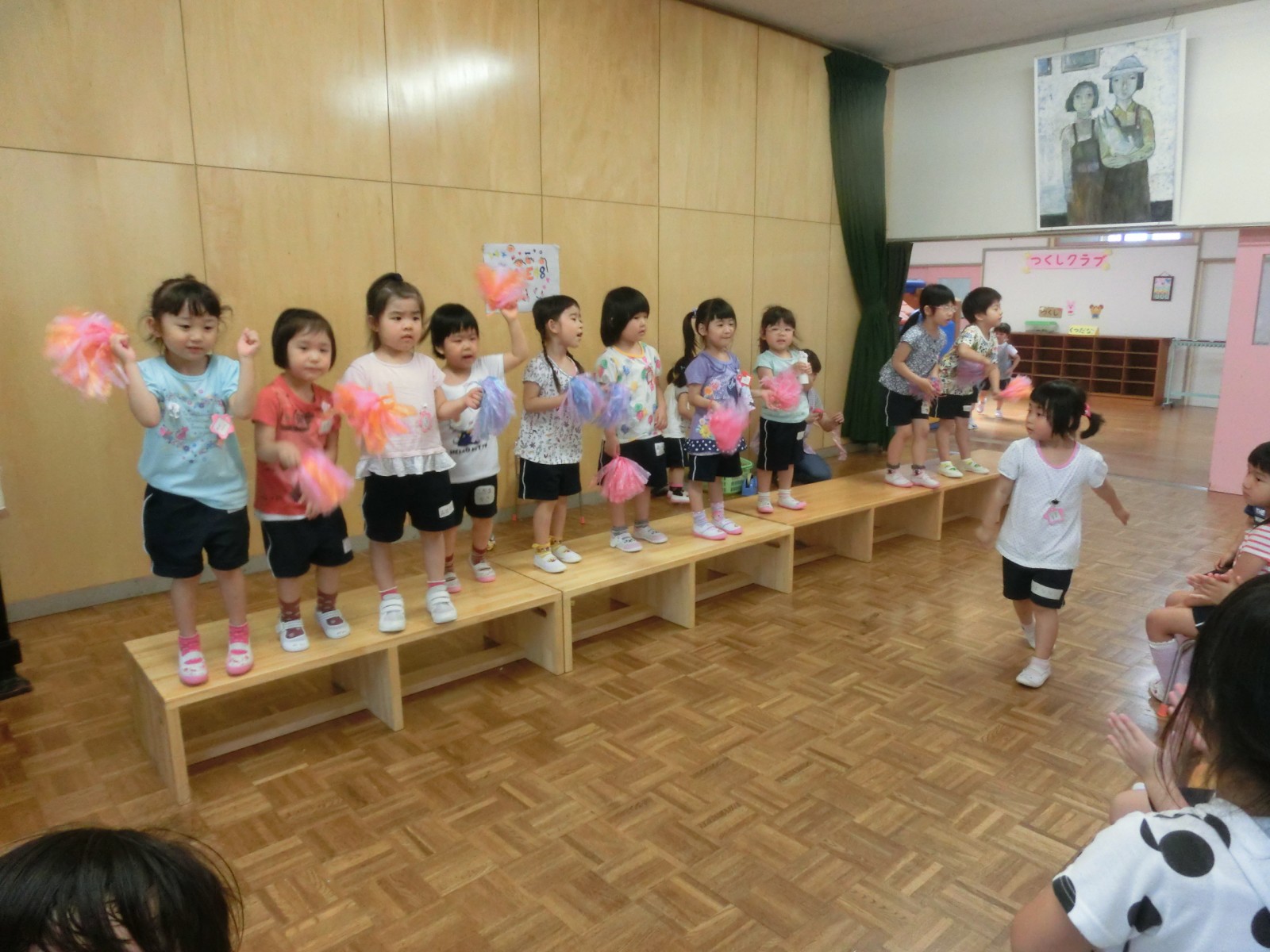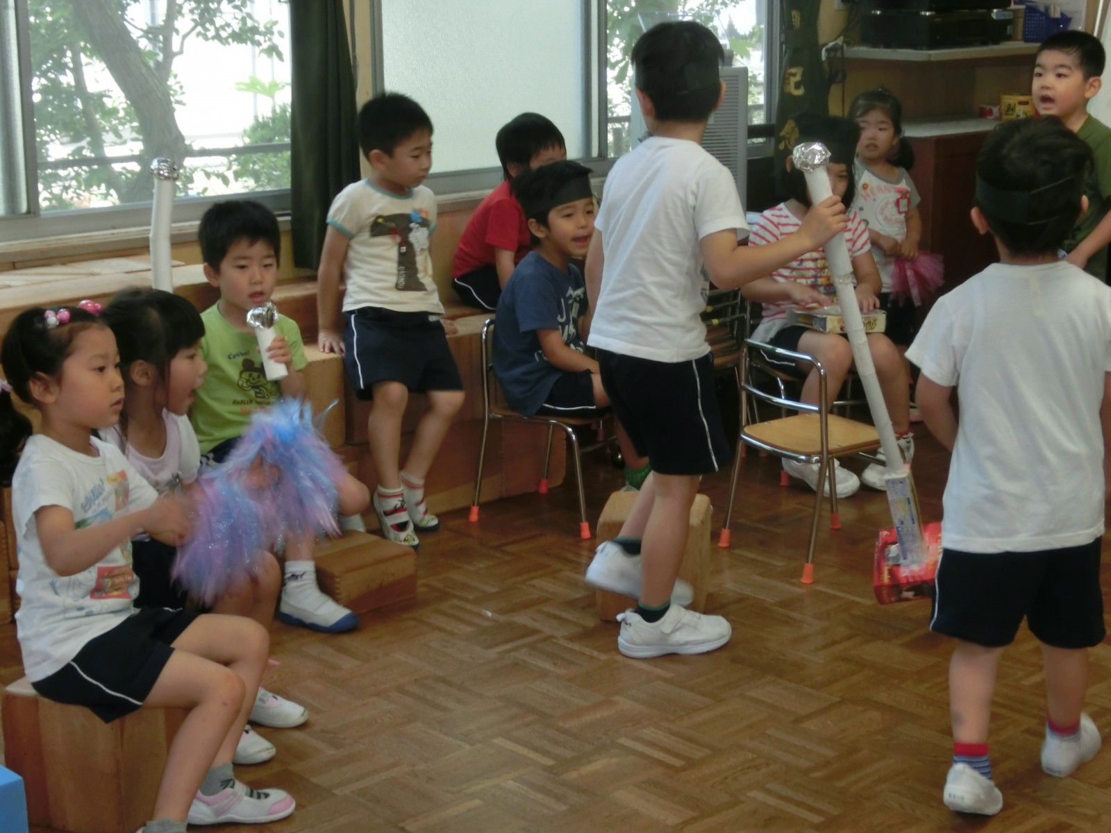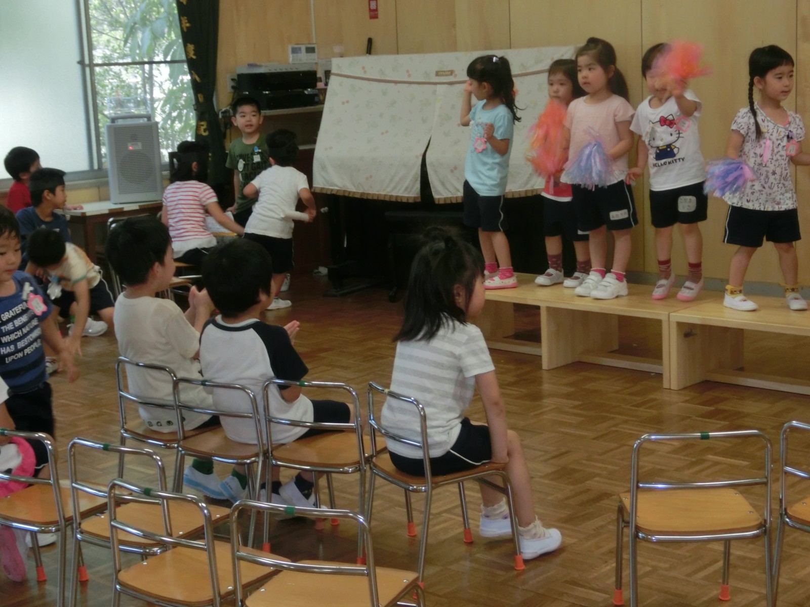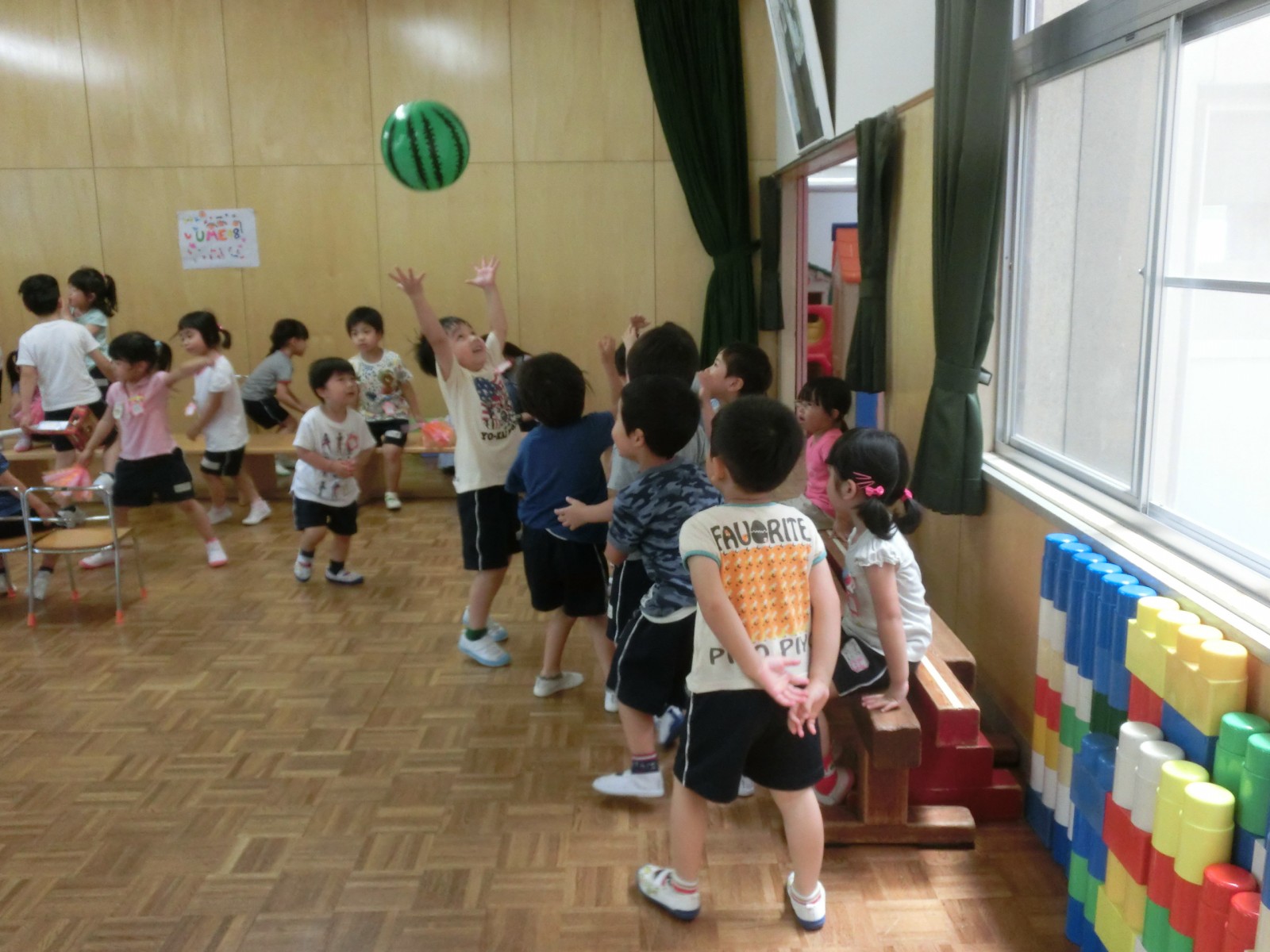 7がつ号の「ひかりのその」に書かれている「UME48」のライブのようすです。この日はうめ組は裏方に徹し、マイクの準備をしたり、観客席を作ったり・・・と大忙しです。そして、スターの歌姫歌みことはばら組とすみれ組の子ども達で舞台でダンスを披露!その傍らでなぜか西瓜割をめざしての西瓜ビーチボールごっこがとびかいます。熱気こもるホールでした。