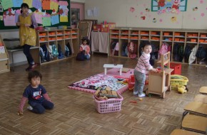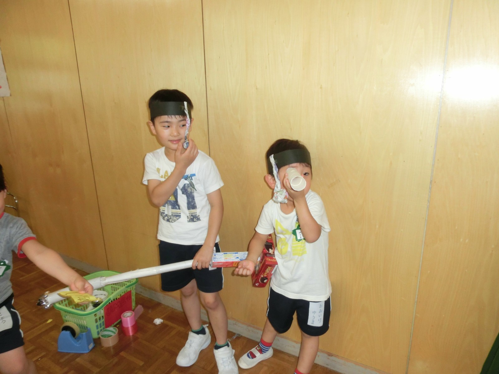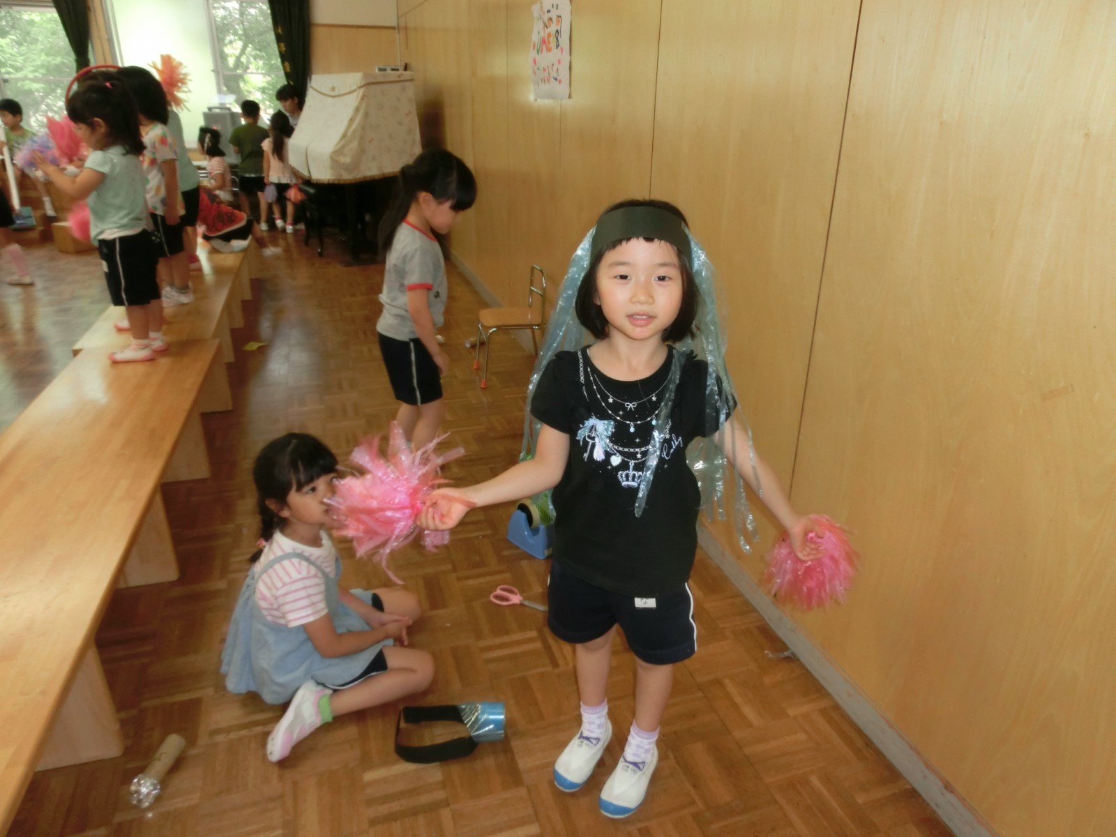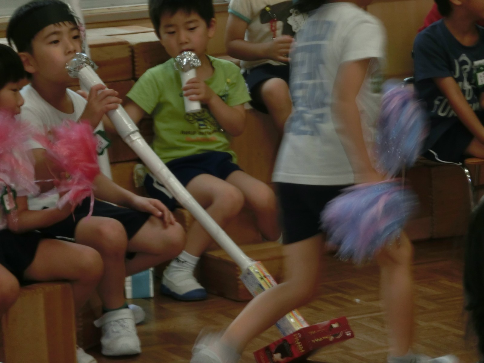 7がつ号の「ひかりのその」に書かれている「UME48」のライブのようすです。この日はうめ組は裏方に徹し、マイクの準備をしたり、観客席を作ったり・・・と大忙しです。そして、スターの歌姫歌みことはばら組とすみれ組の子ども達で舞台でダンスを披露!その傍らでなぜか西瓜割をめざしての西瓜ビーチボールごっこがとびかいます。熱気こもるホールでした。