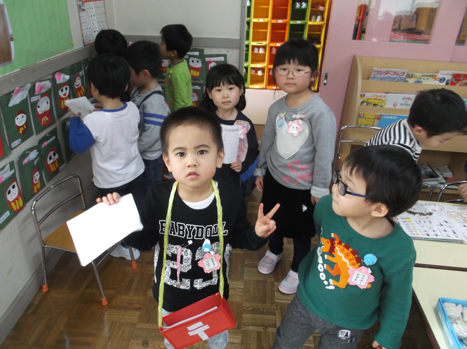 すみれ組さんは郵便屋さんごっこの初体験をしてお手紙をお友達のポストにいれたり、お手紙を書いたりとにぎやかにおこなっています。