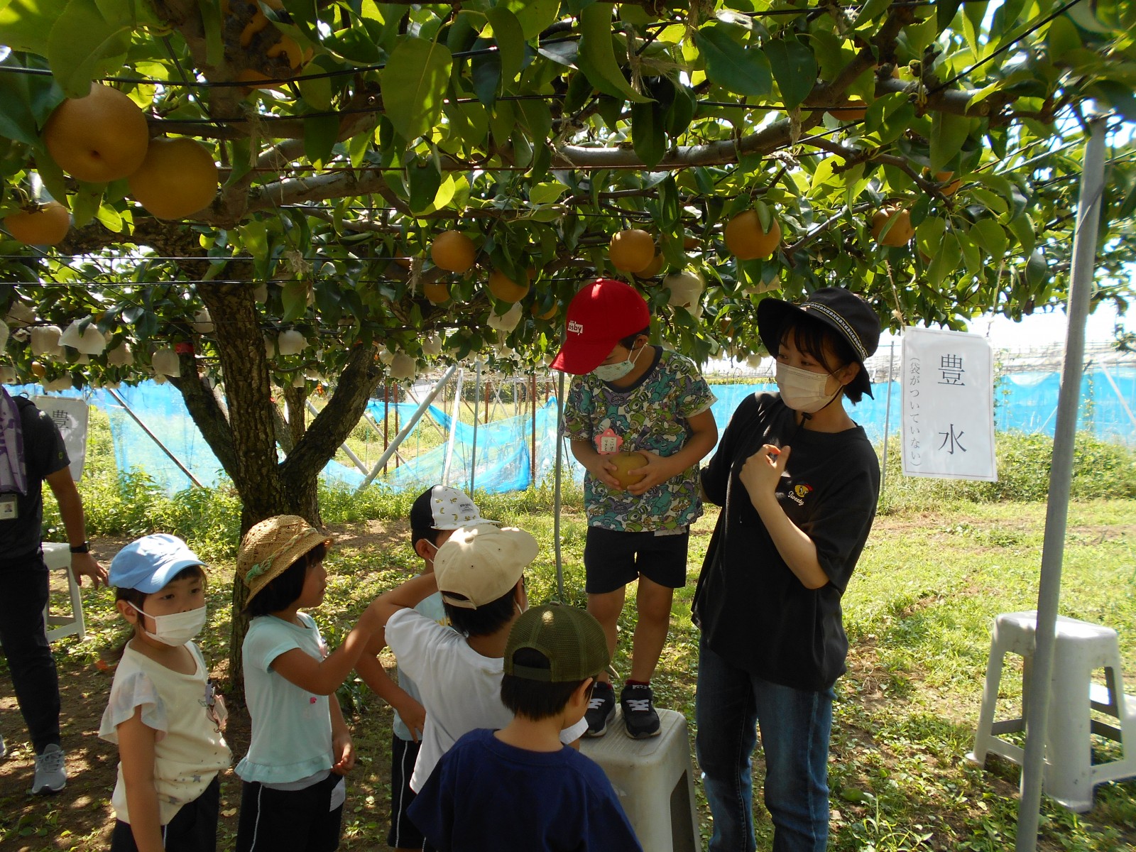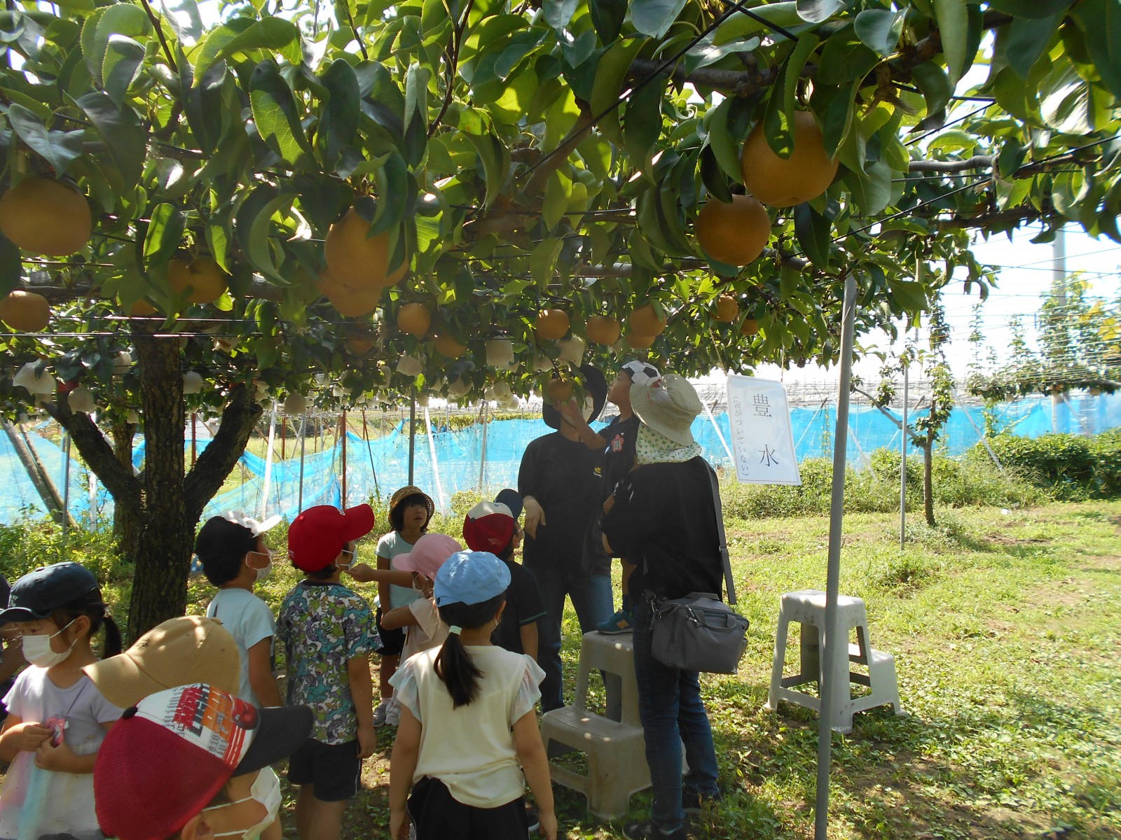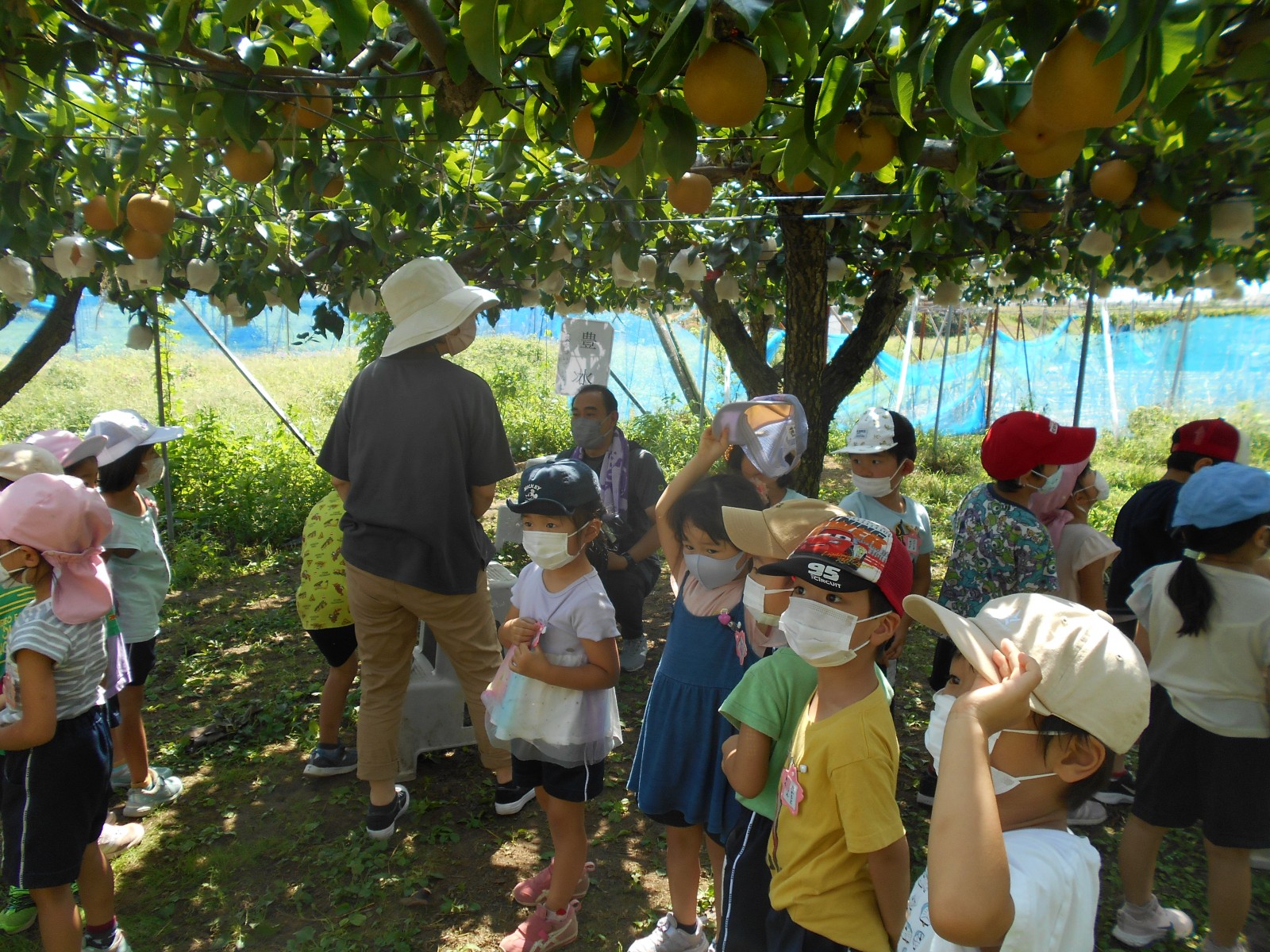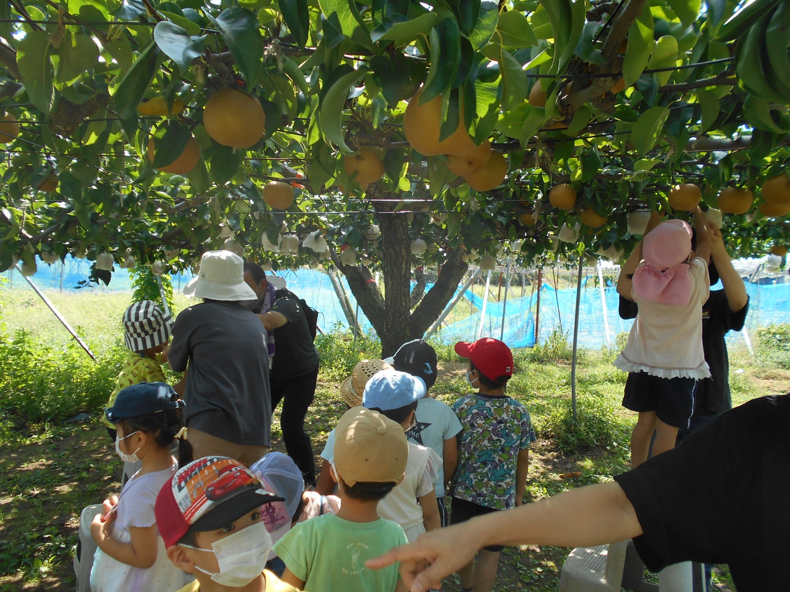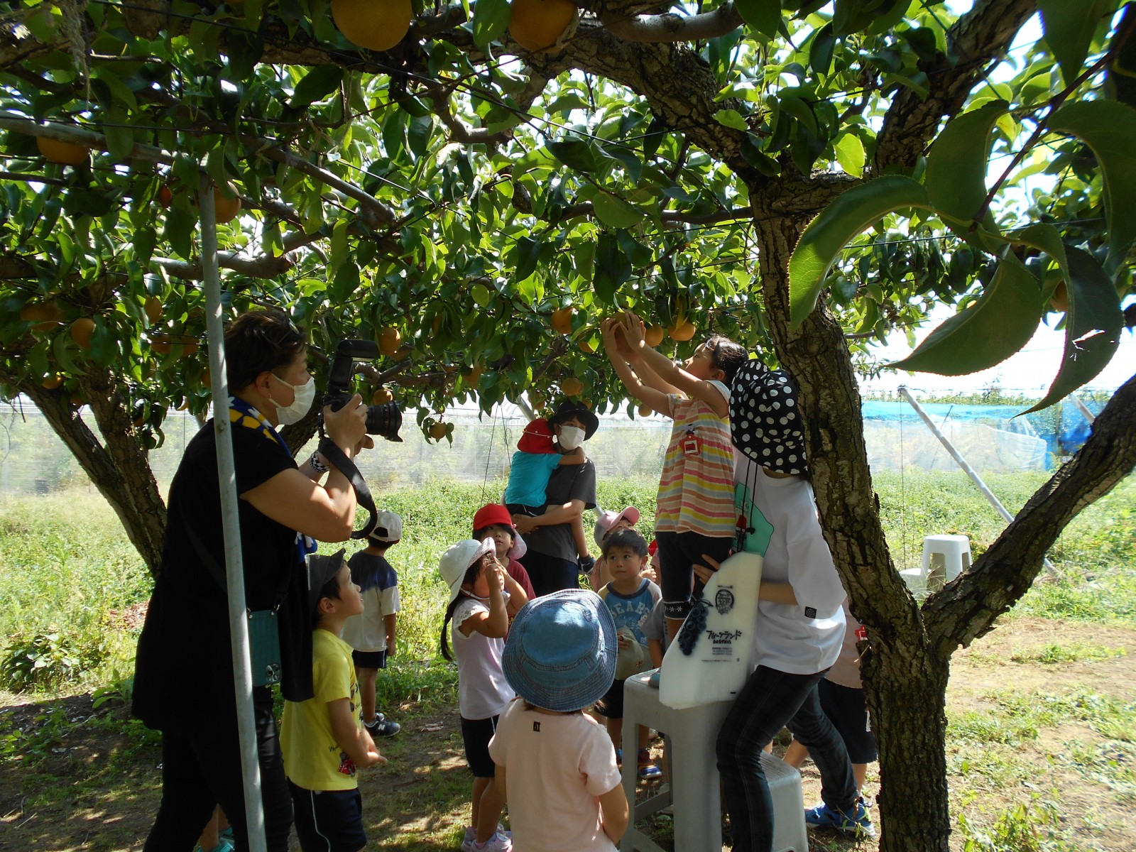 幼児部さんで白根に梨狩りにいきました。天気にもめぐまれて、沢山の梨のがなっている様子をみられました。青空の下でお弁当を食べることもできました。