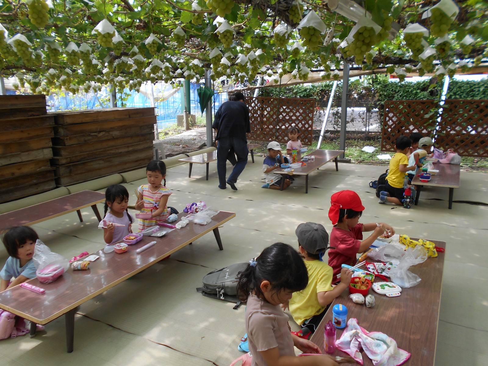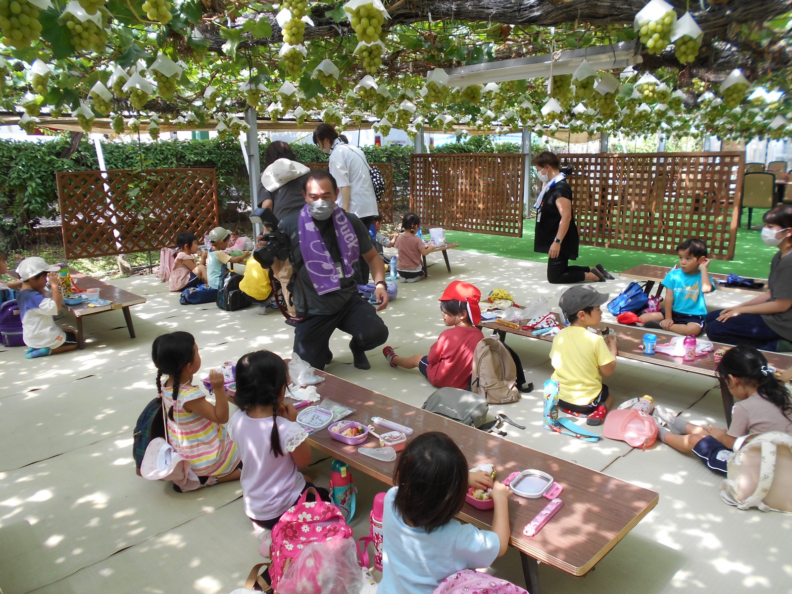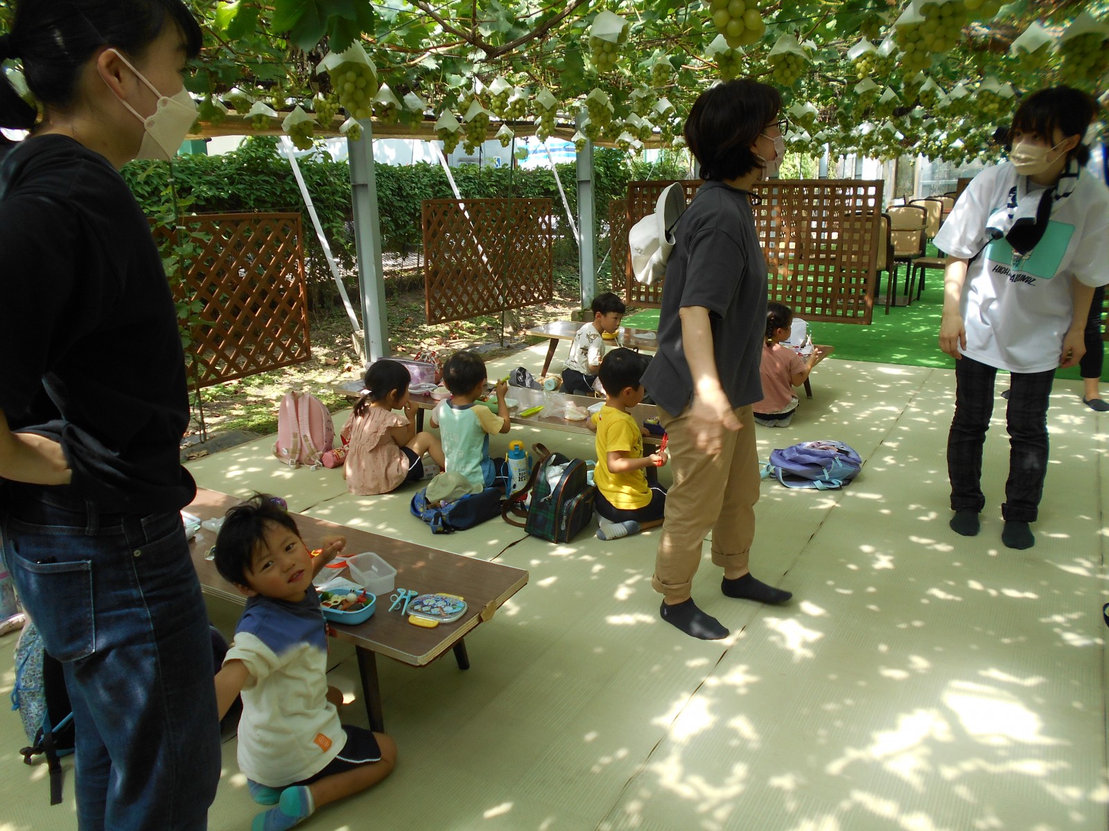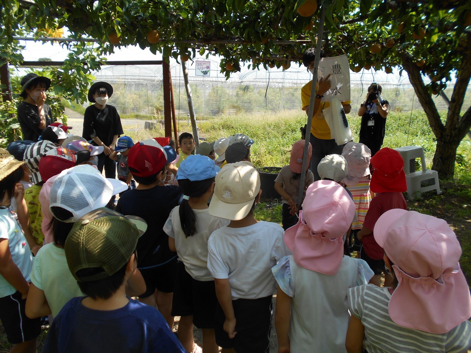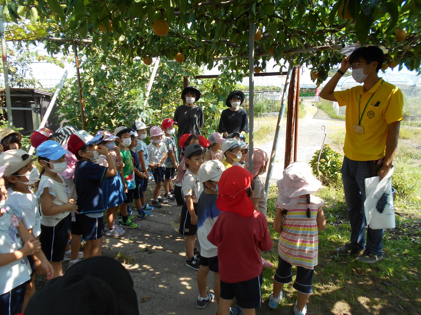 幼児部さんで白根に梨狩りにいきました。天気にもめぐまれて、沢山の梨のがなっている様子をみられました。青空の下でお弁当を食べることもできました。