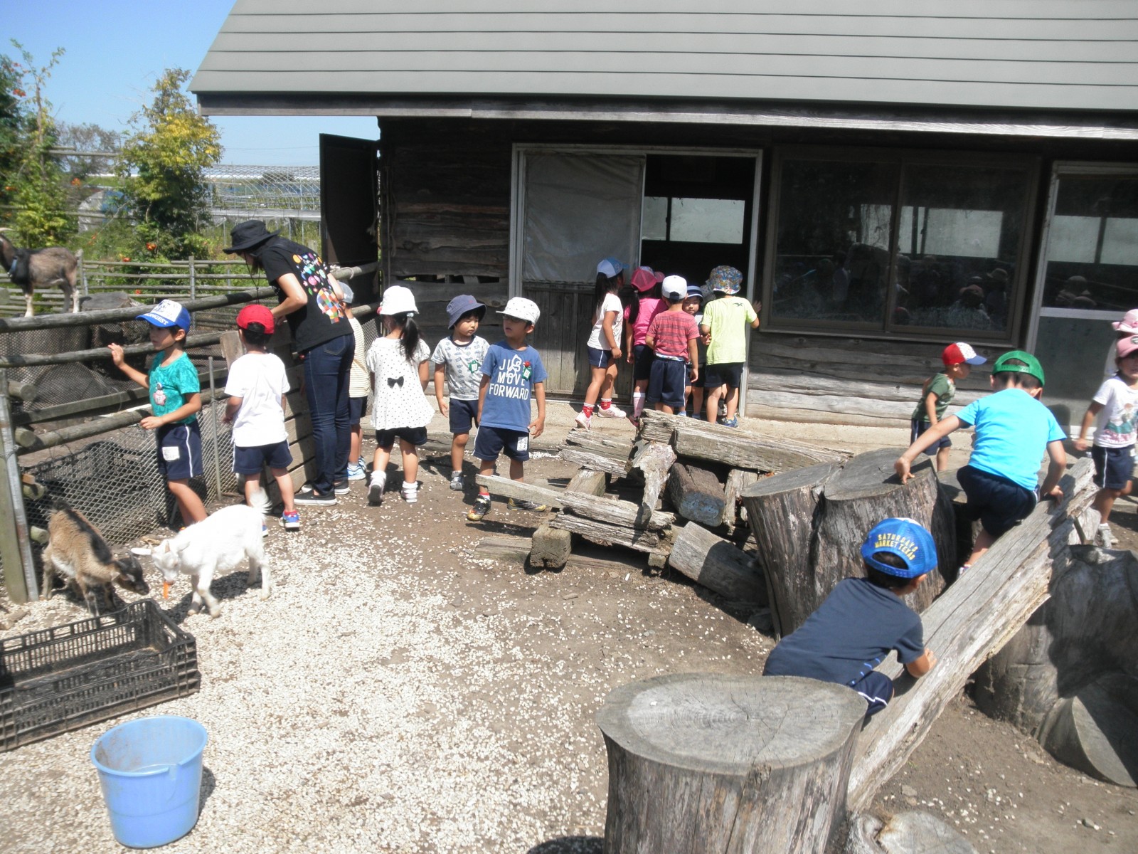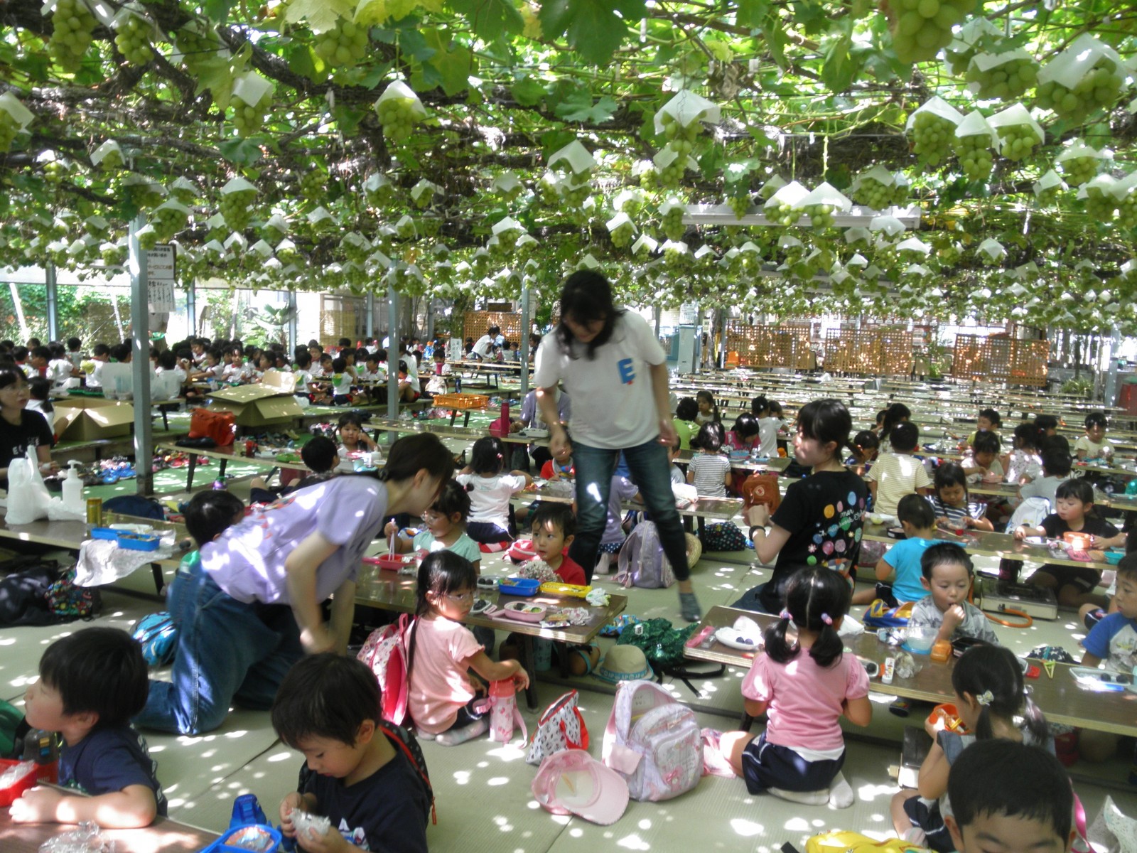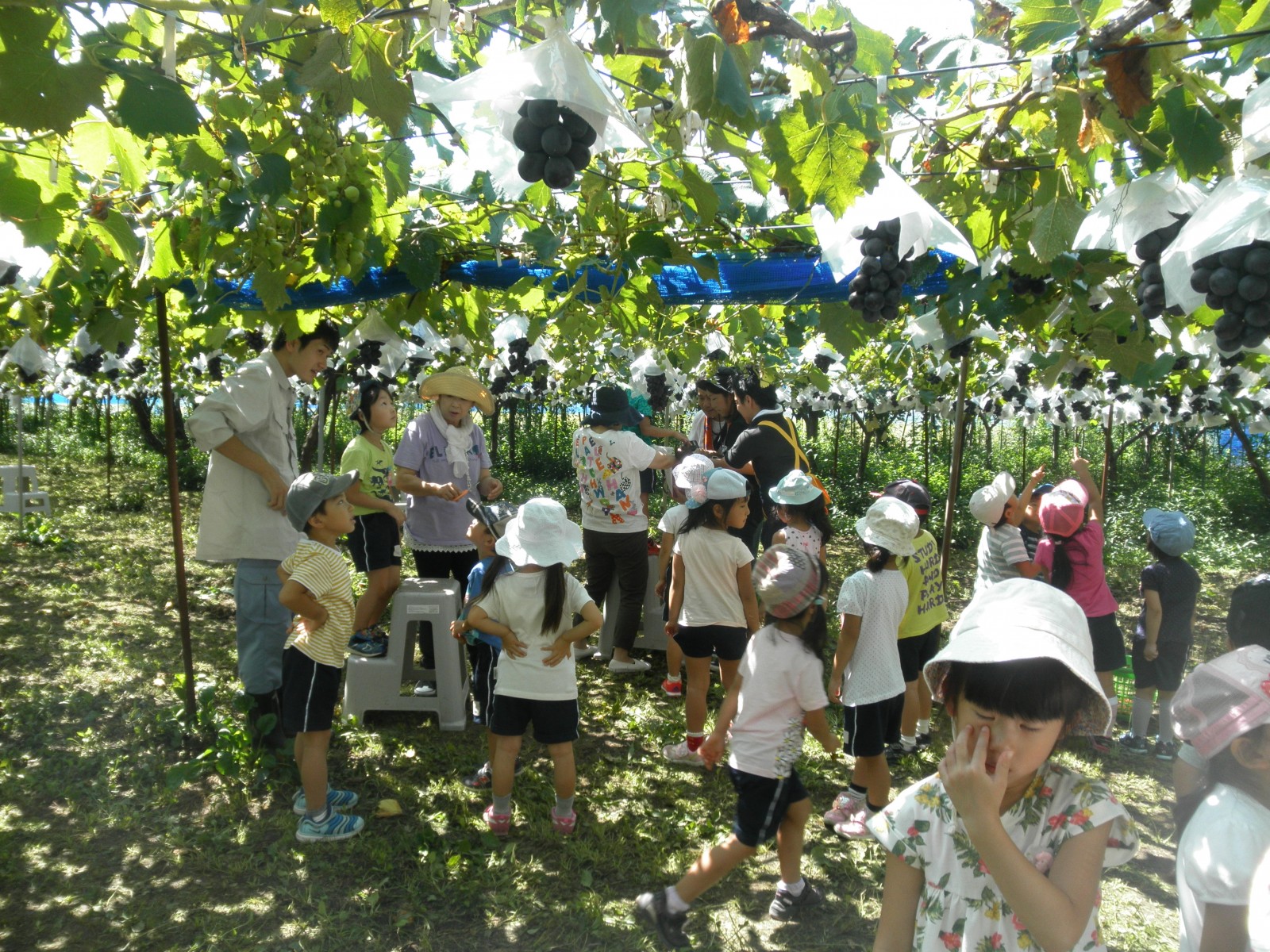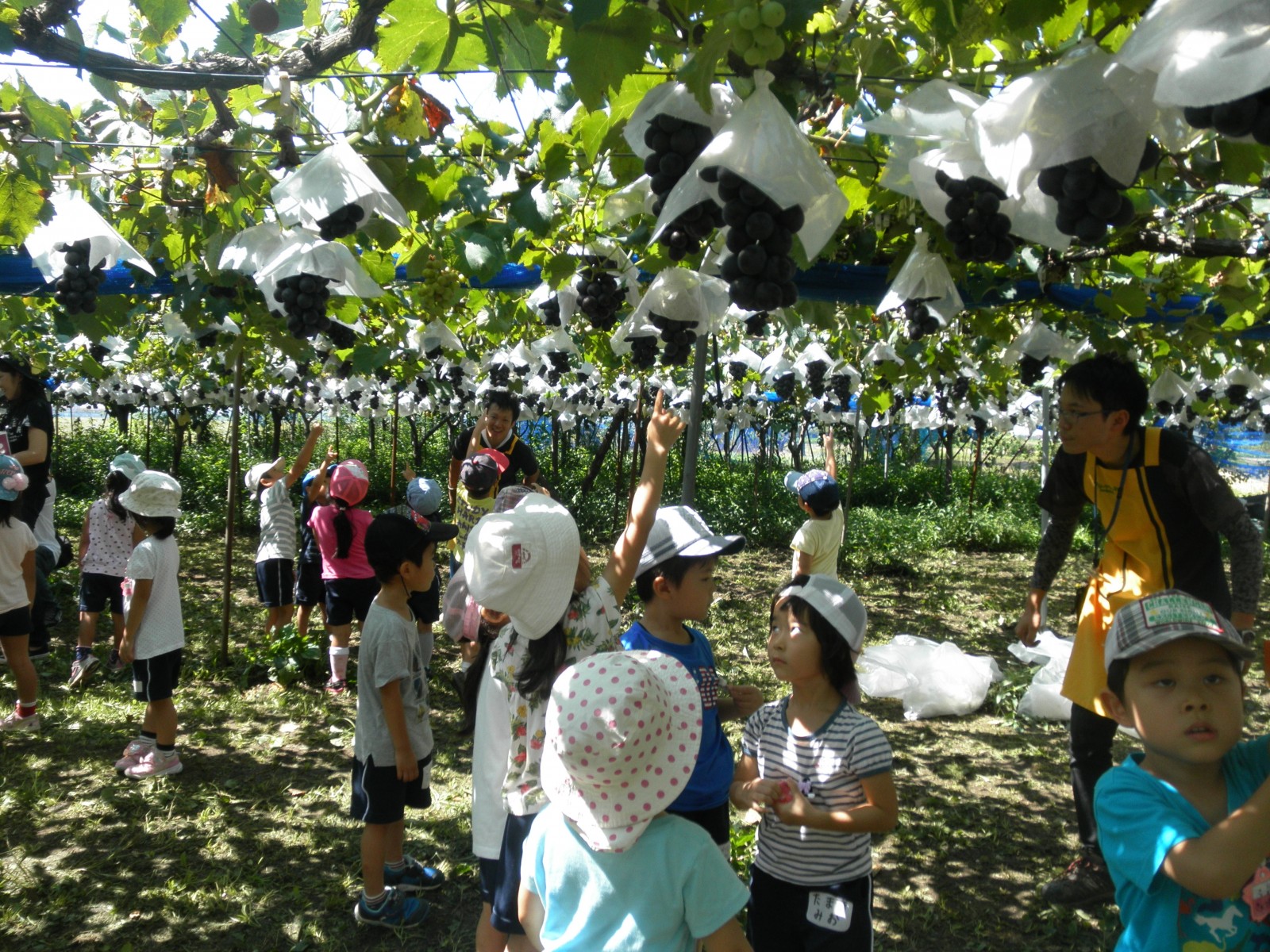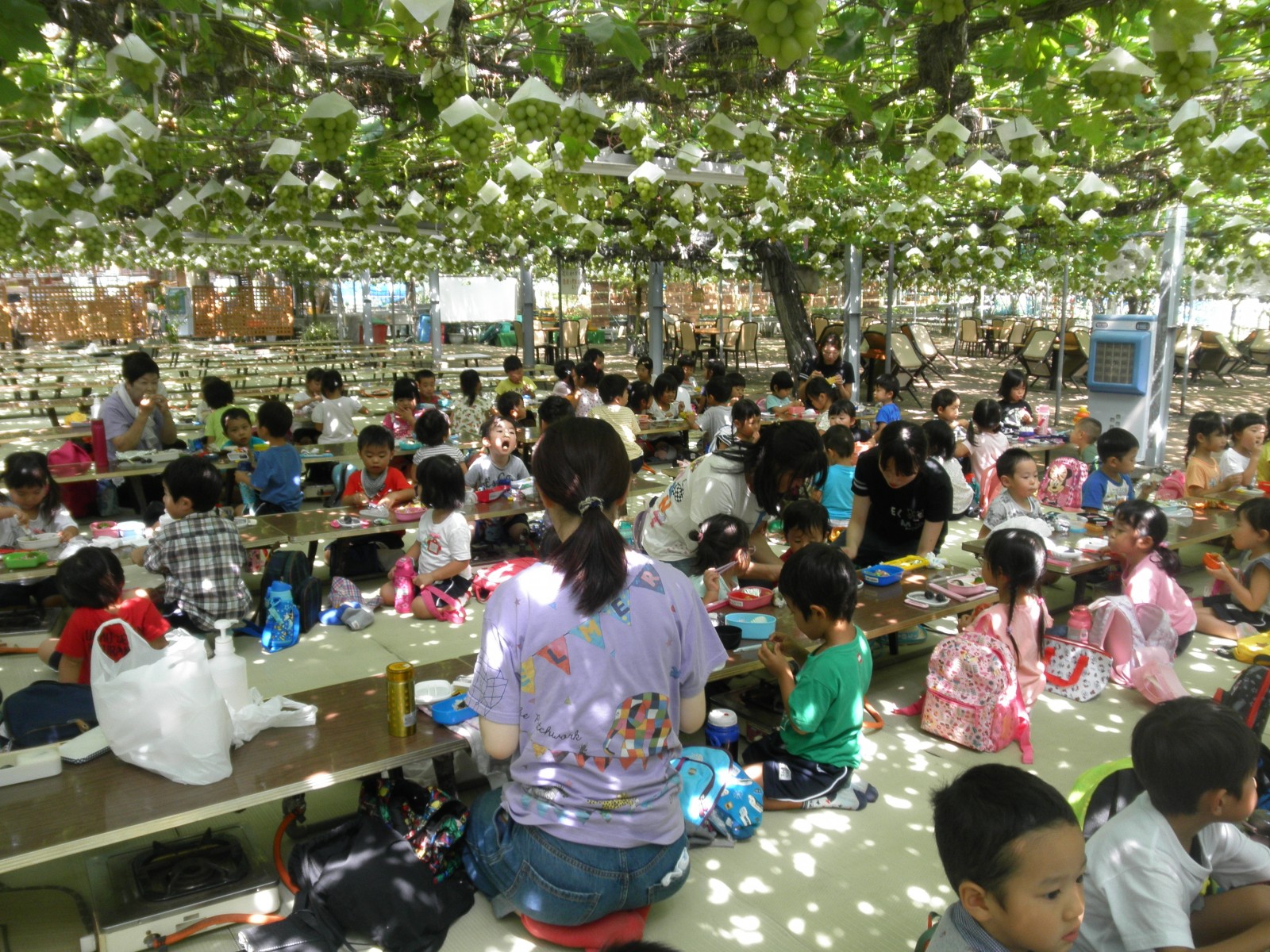 お昼はお母さんの愛情たっぷり弁当をおいしくいただき、その後デザート用にぶどうをいただきました。上手にむけたりなかなか出来なかったりとさまざま!終わって裏の動物がいるところに行きやぎに餌をやったり、うさぎをだっこしようと走り回ったり(なかなか足が速くて簡単にはつかまえられないのです!)木の輪投げをしたりと広場でたくさんあそびました。お家でみんなで食べたぶどうはいかがでしたか?