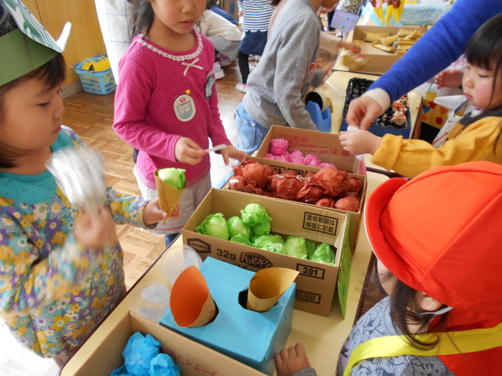 お店は3店舗あり、すみれ組とひよこ組さんの虹屋さん、くじなどある「きらきらおもちゃセンター」、スタバの帽子?をかぶっておしゃれな売り子さんの「スペシャルマーケット」です。アイスはコーンが横に用意され、ちゃんとアイスつかみでアイスの上の部分を取ってコーンに入れて「はいどうぞ!」そして、ひよこ組さんもたくさん売り、たくさん買いました。みんな絵本袋がパンパンです。
