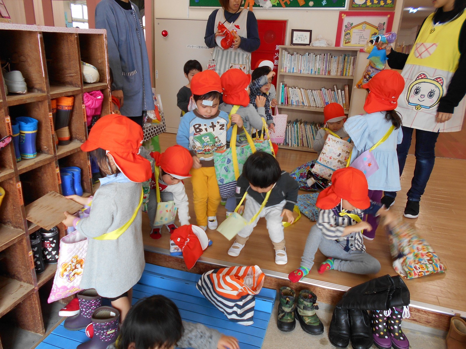 乳児部のいちご組さんもお店を開きまた買い物をたのしみました。オレンジの帽子をかぶっているのがいちご組さんです。