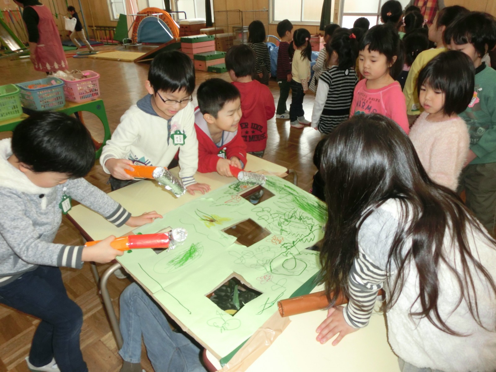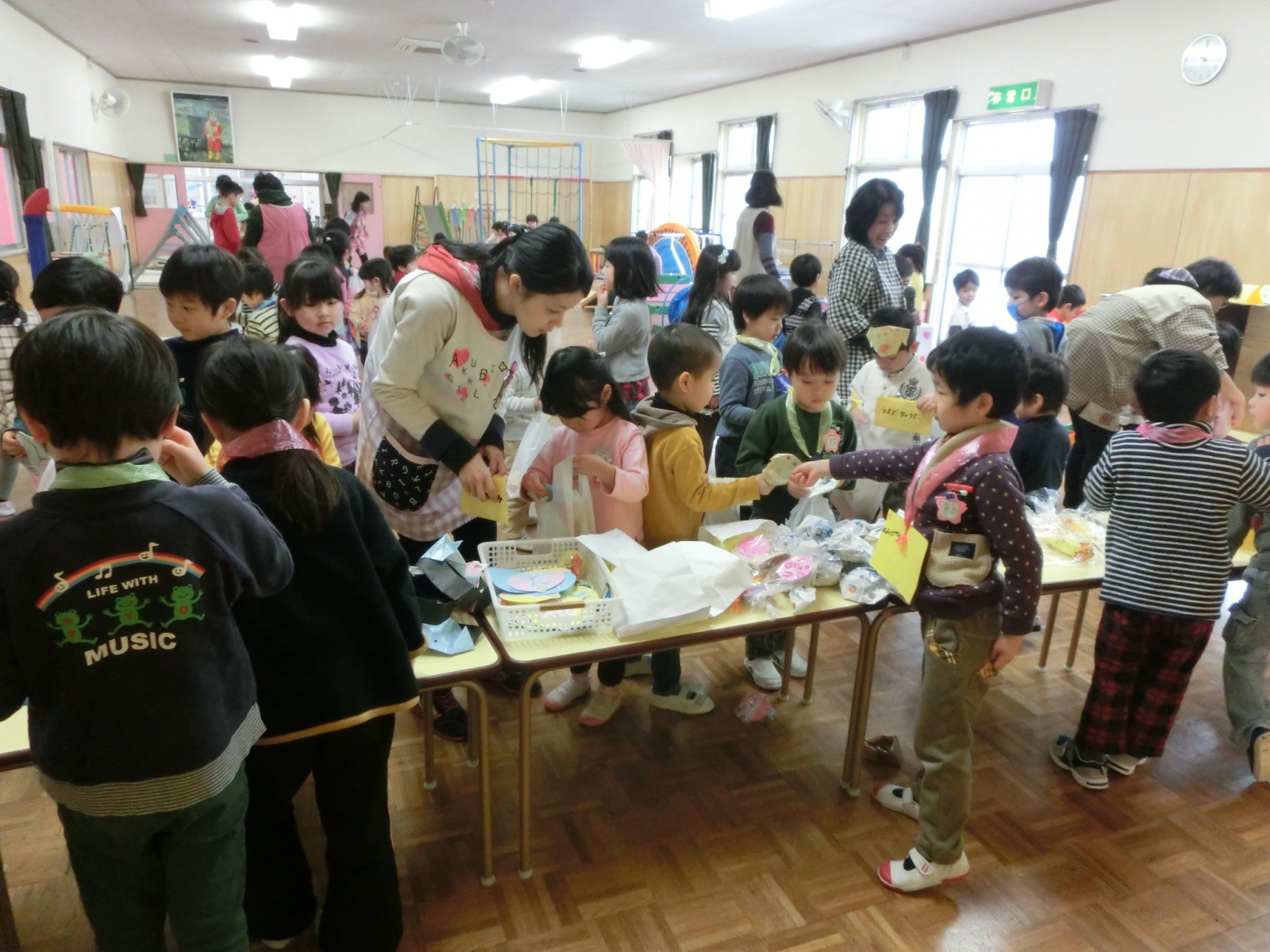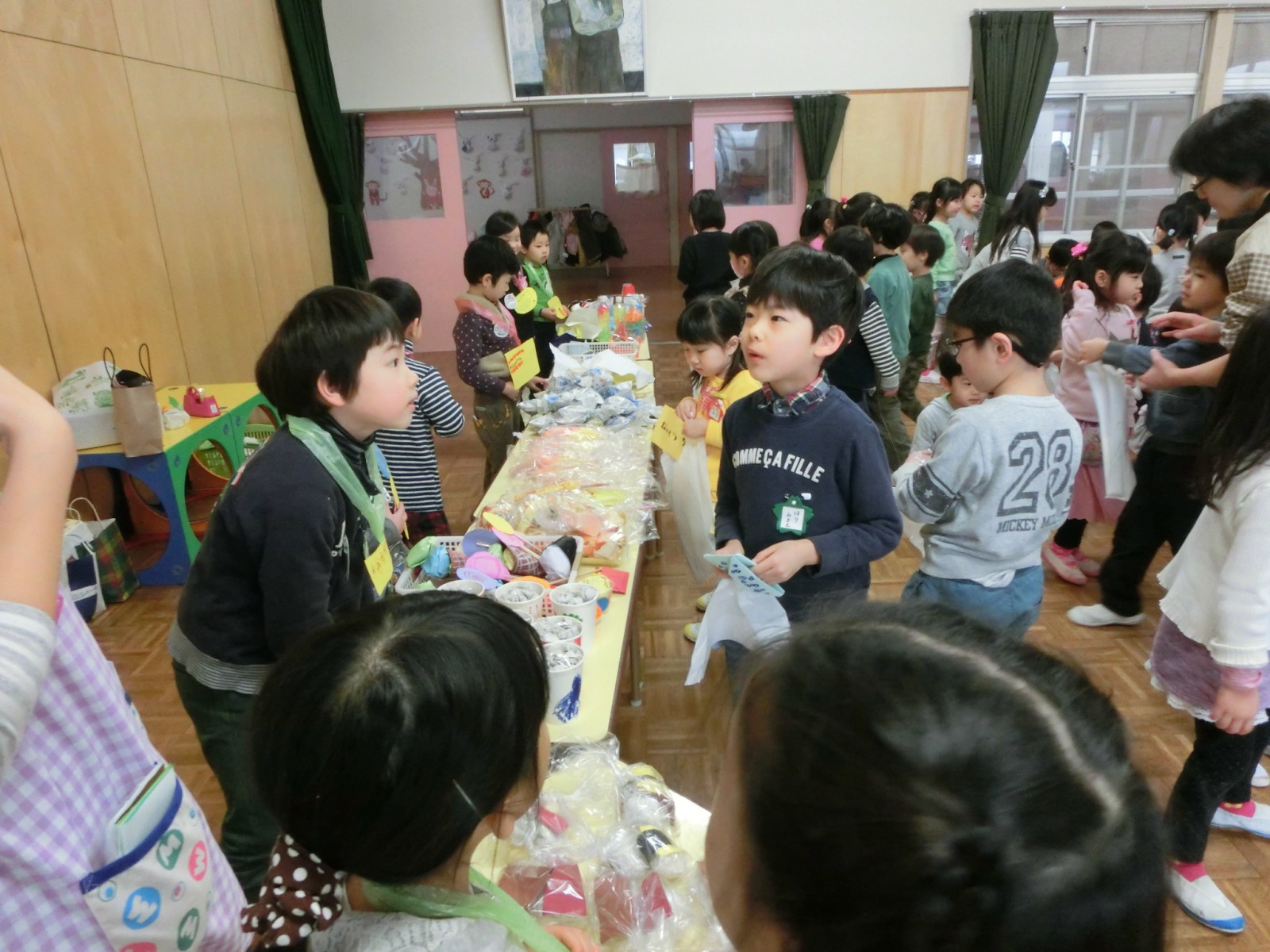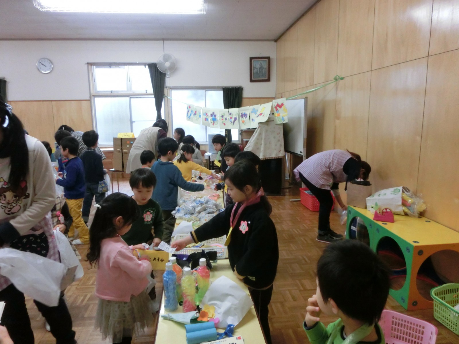 第2幼稚園では、お店屋さんごっこの当日にインフルエンザが大流行のため、たくさんのお友達が参加できずに悲しい思いをしました。そこで2月25日に風邪復活組のお友達のためにミニお店屋さんを開催しました。そのときの写真です。ゲームは全員参加出来るようにしたので、再度大盛況でした。ここでもモグラたたきが大人気でした。