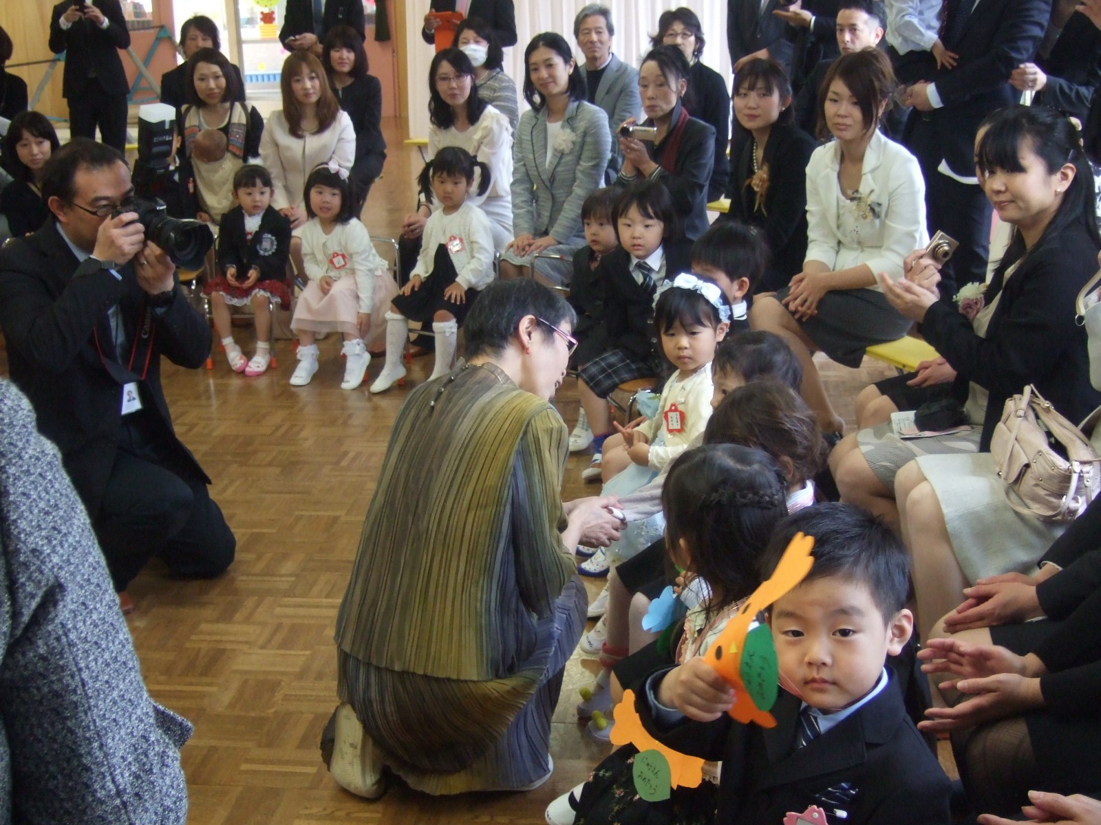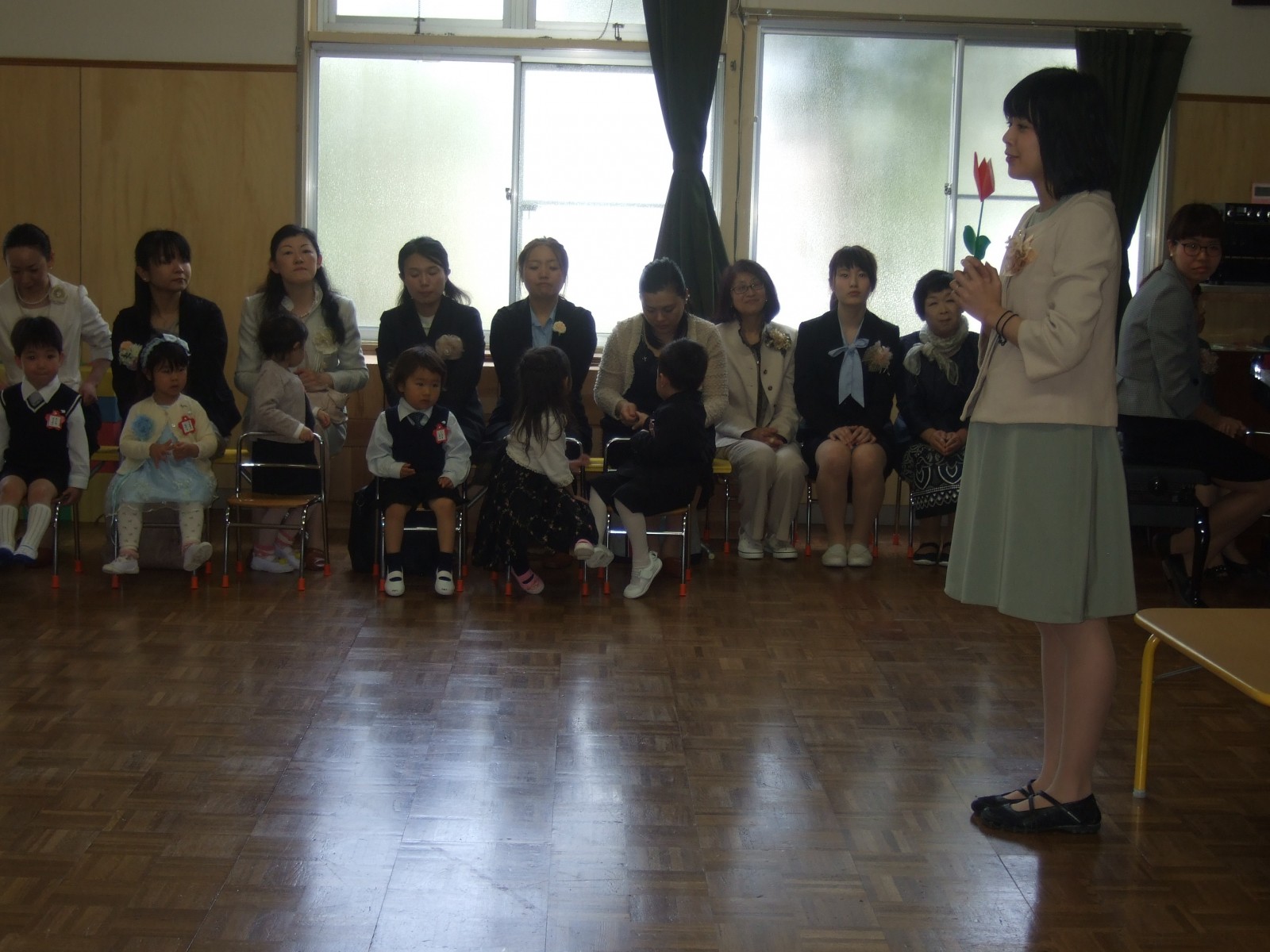 とてもすばらしい天気に恵まれて、あたたかい入園式となりました。大勢のお父様がいらしてくださり、びっくりです。そして、ありがとうございました。お姉さん達が作ってくれた、大きなペンダントをかけてもらって大喜びでした。