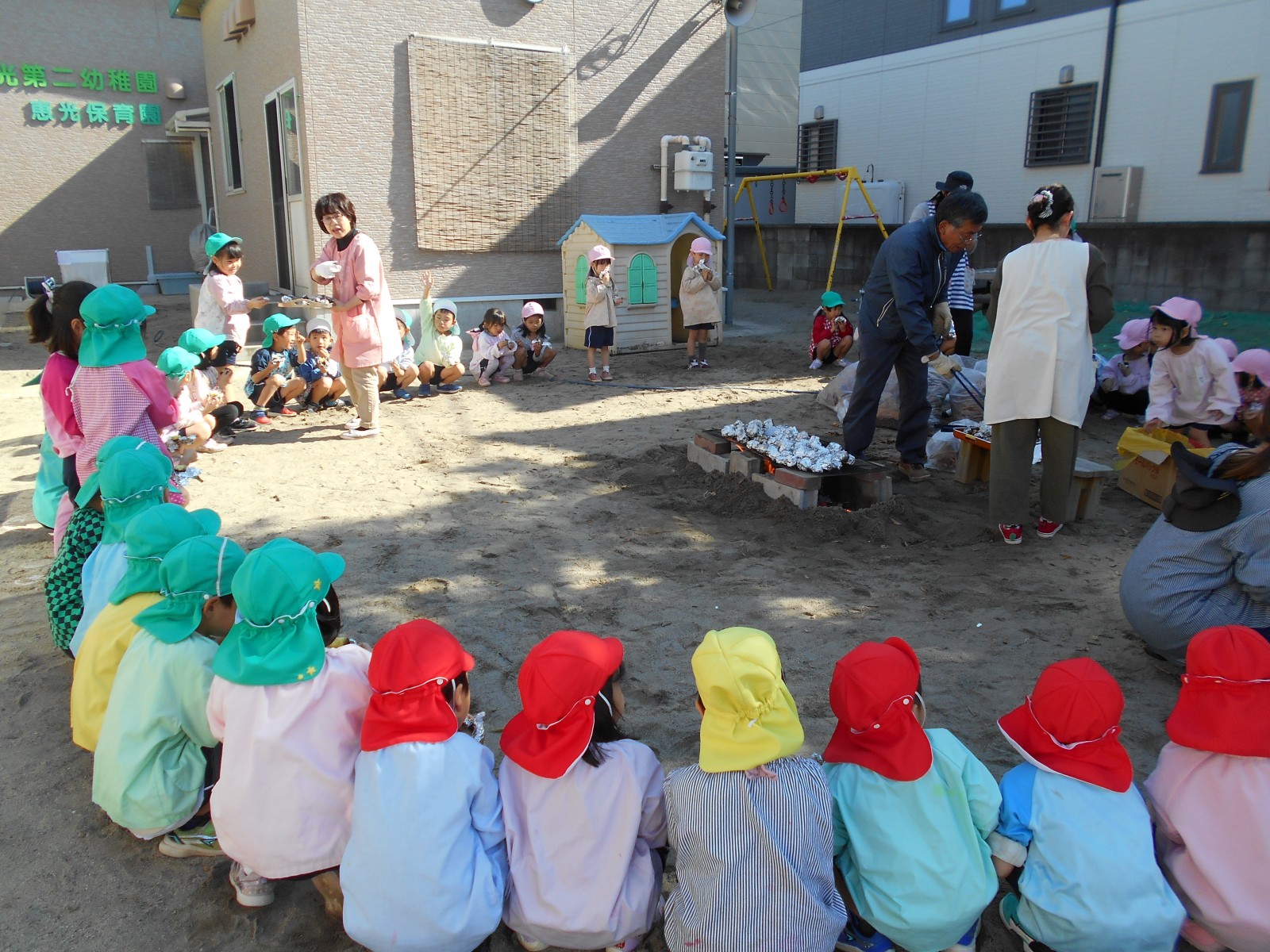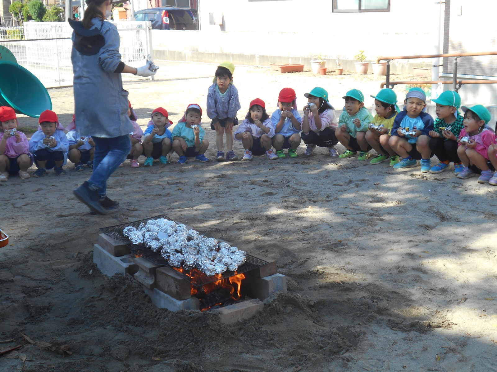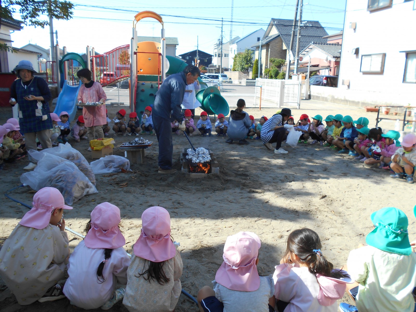 11月1日のとてもよい天気の日、バスの廣川さんが上手に用意してくださったかまどで焼き芋大会が始まりました。
