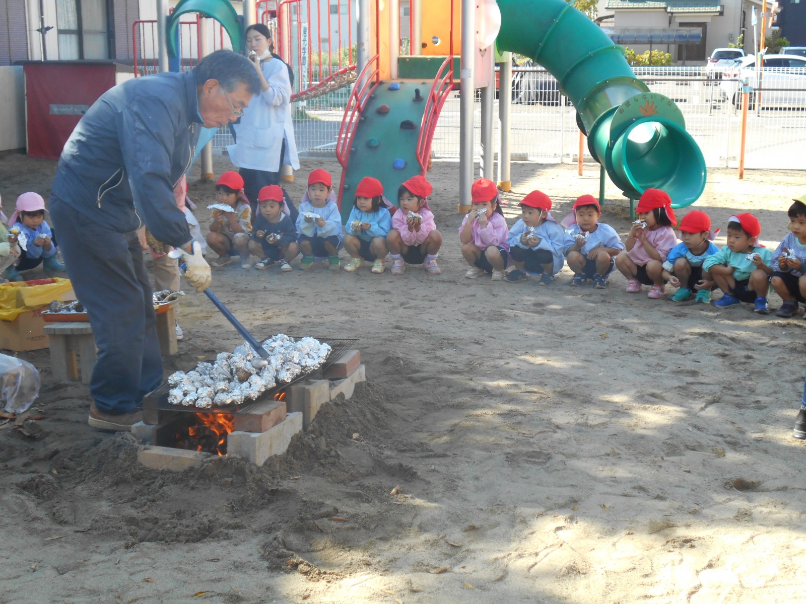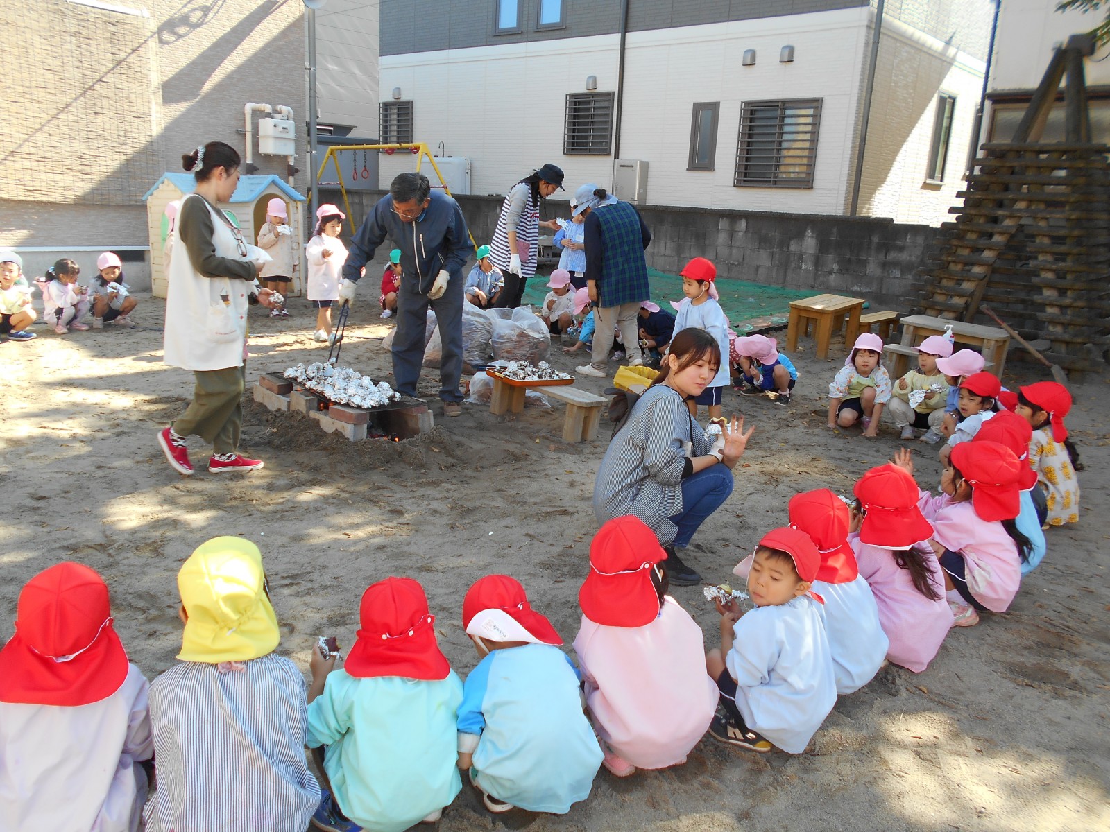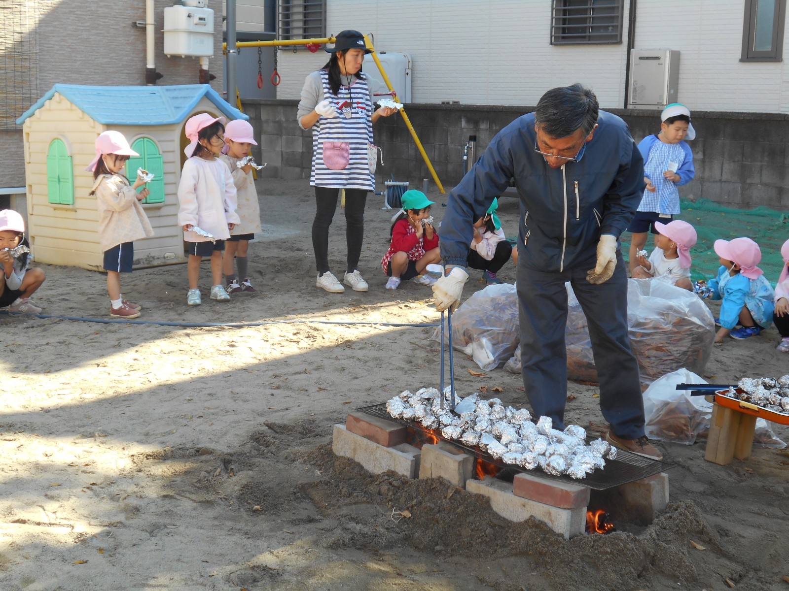 11月1日のとてもよい天気の日、バスの廣川さんが上手に用意してくださったかまどで焼き芋大会が始まりました。