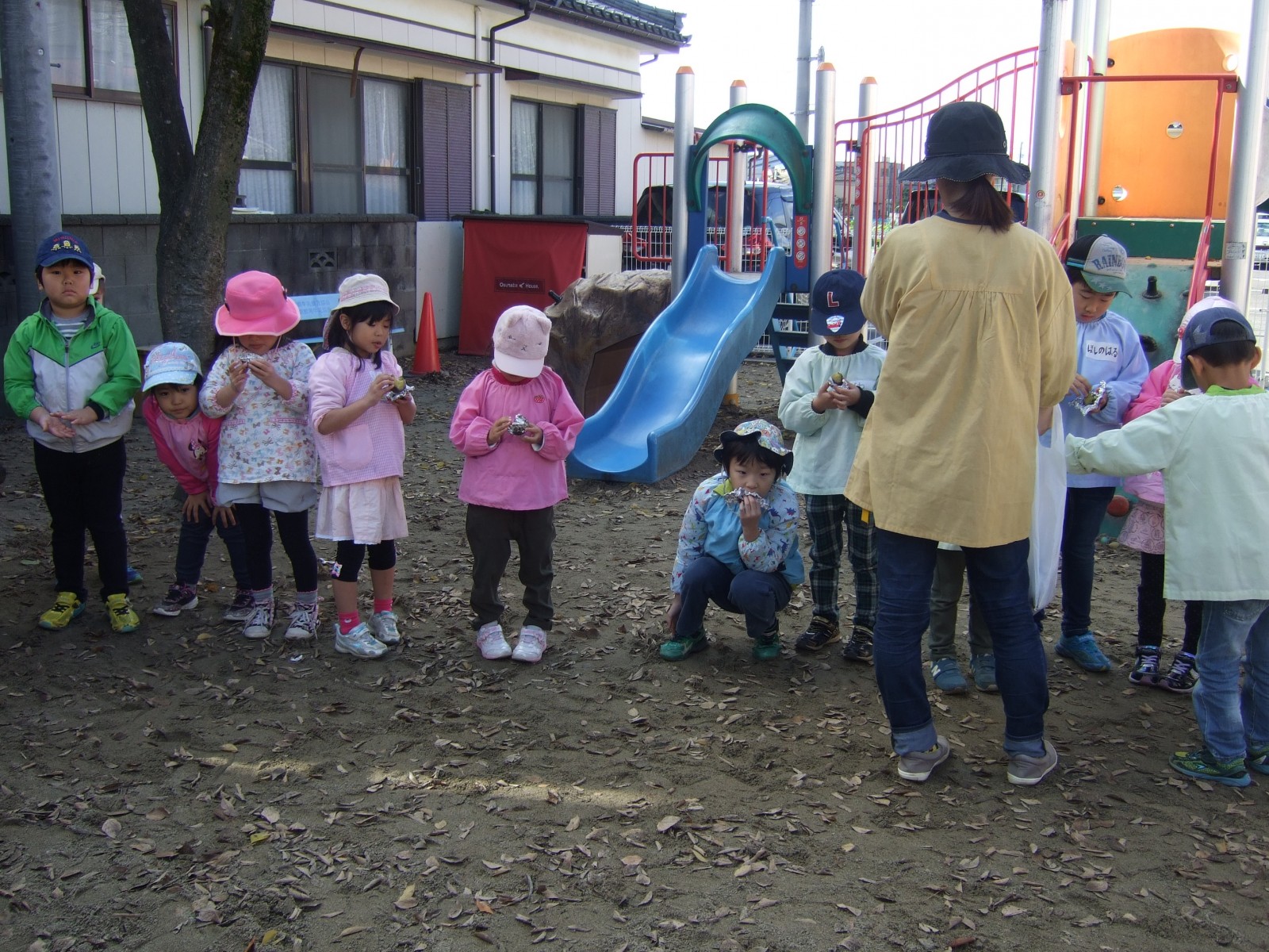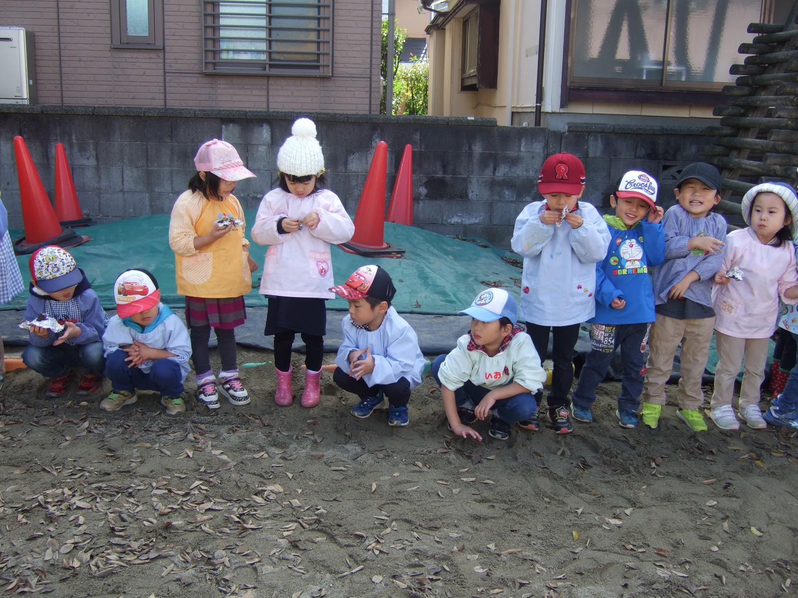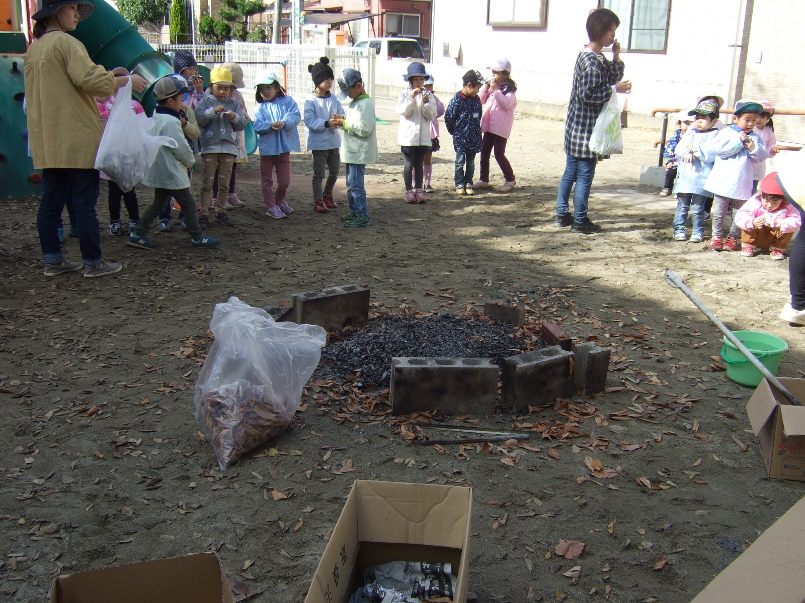 11月14日雨模様が怪しい中、先日出来なかったやきいも会をやることが出来ました。みんなで採ってきた枯葉の葉っぱがやはり湿っていたので、朝あわててドライヤーで乾かしました。そして厨房のみなさんに蒸かしていただいたお芋をうめ組さんがアルミで包み葉っぱの焼き芋が出来ました。厨房のみなさんありがとうございました。