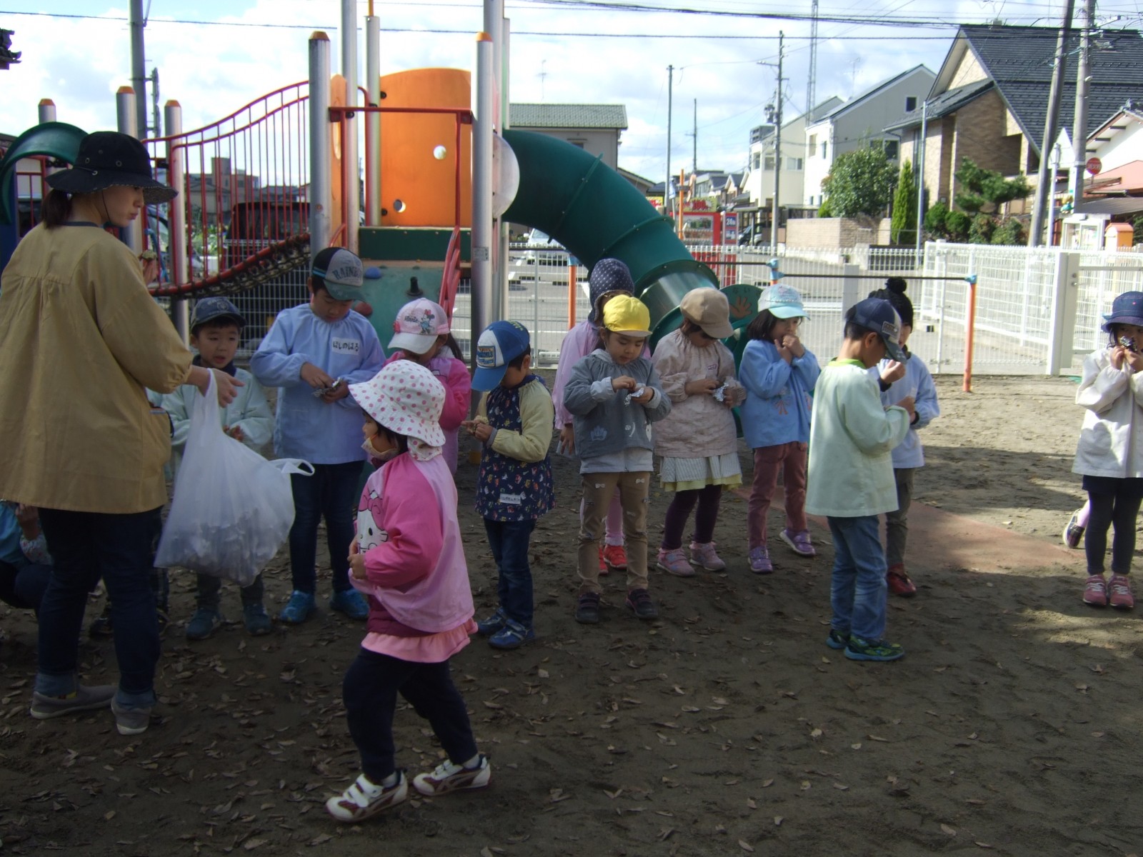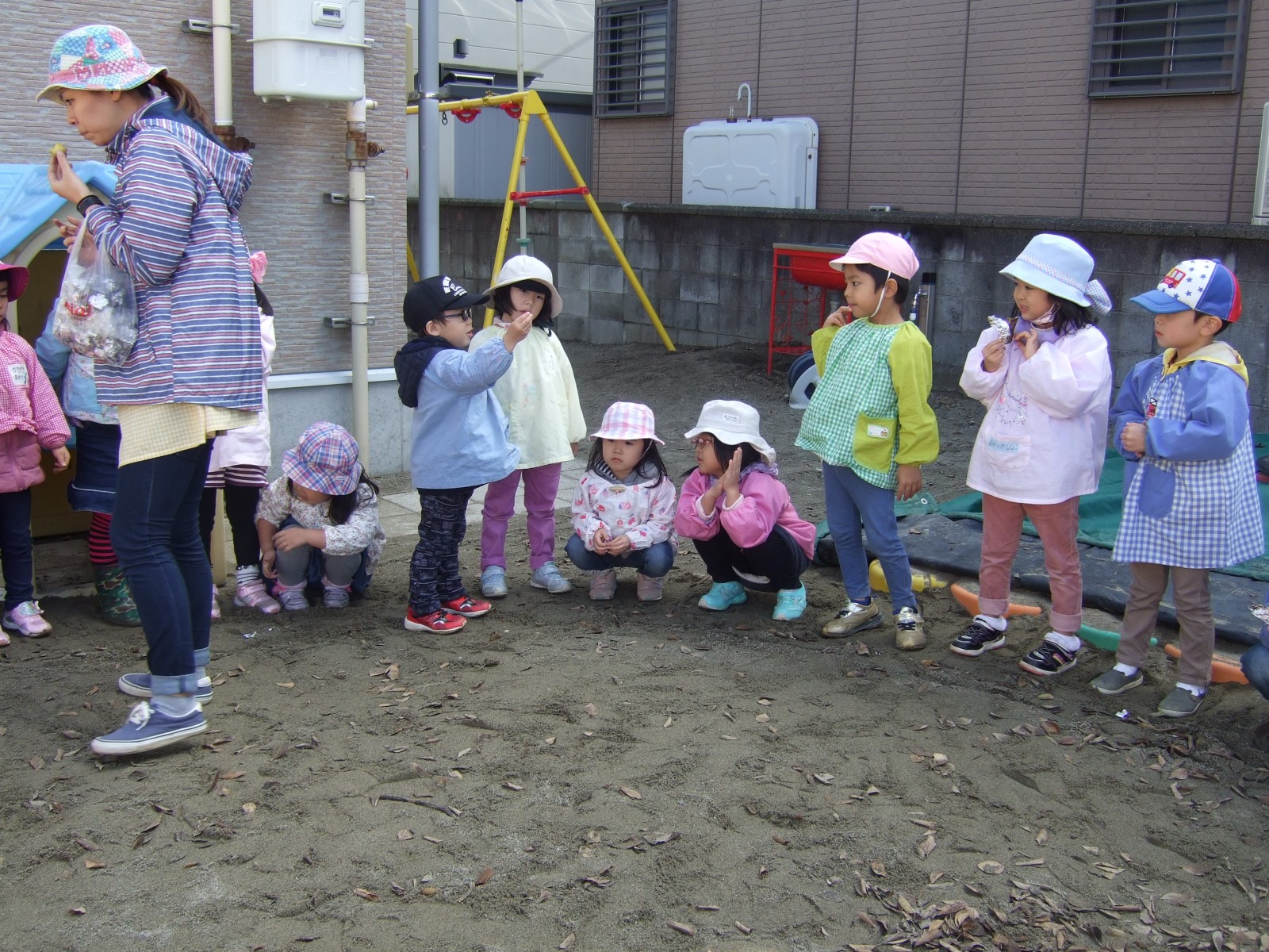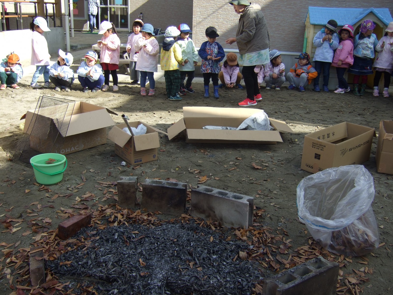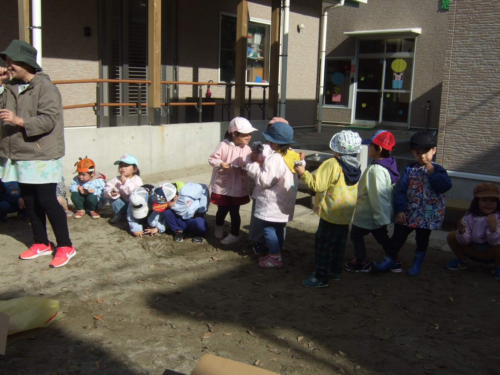 11月14日雨模様が怪しい中、先日出来なかったやきいも会をやることが出来ました。みんなで採ってきた枯葉の葉っぱがやはり湿っていたので、朝あわててドライヤーで乾かしました。そして厨房のみなさんに蒸かしていただいたお芋をうめ組さんがアルミで包み葉っぱの焼き芋が出来ました。厨房のみなさんありがとうございました。