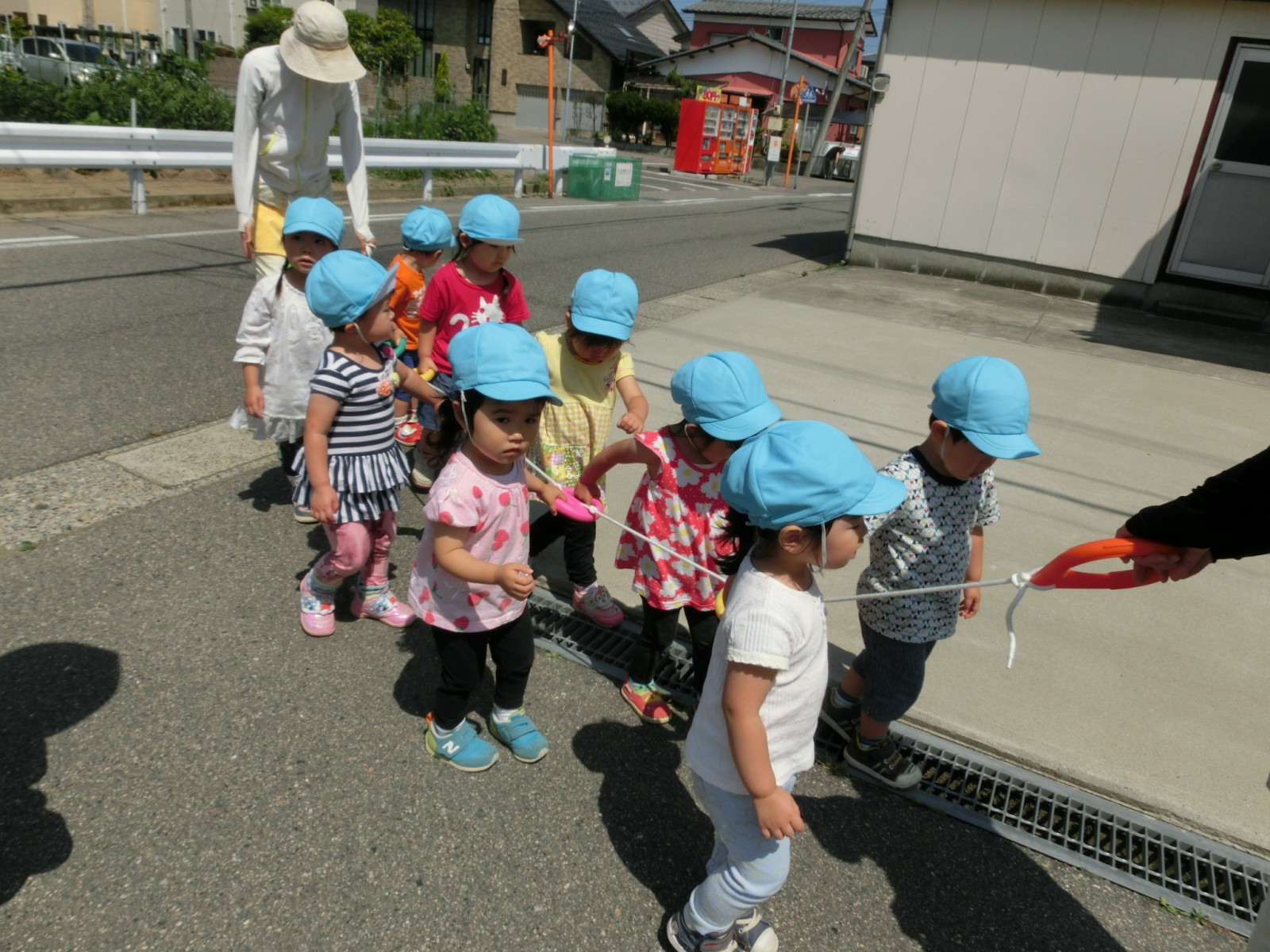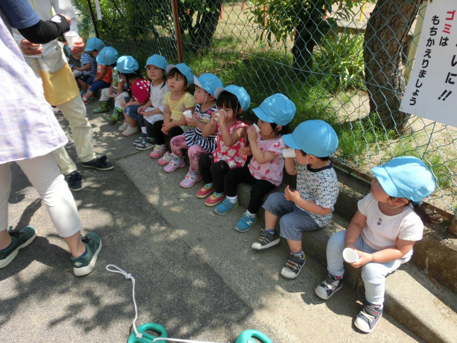 乳児部さんのいちご組さんで近くの公園に歩いていきました。初めて外でおやつを食べます。木漏れ日の下で、お茶を飲み、おやつをいただきました。おいしいね!