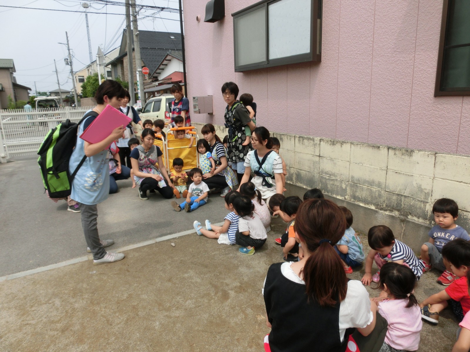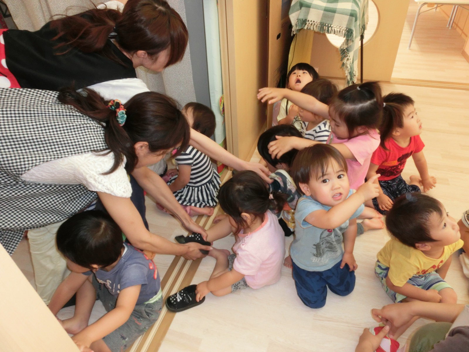 火事を想定して外に出る訓練をしました。先生方はおんぶをし、歩けるお友達は靴をはいて逃げる練習です。だんだん上手になってきましたんね。