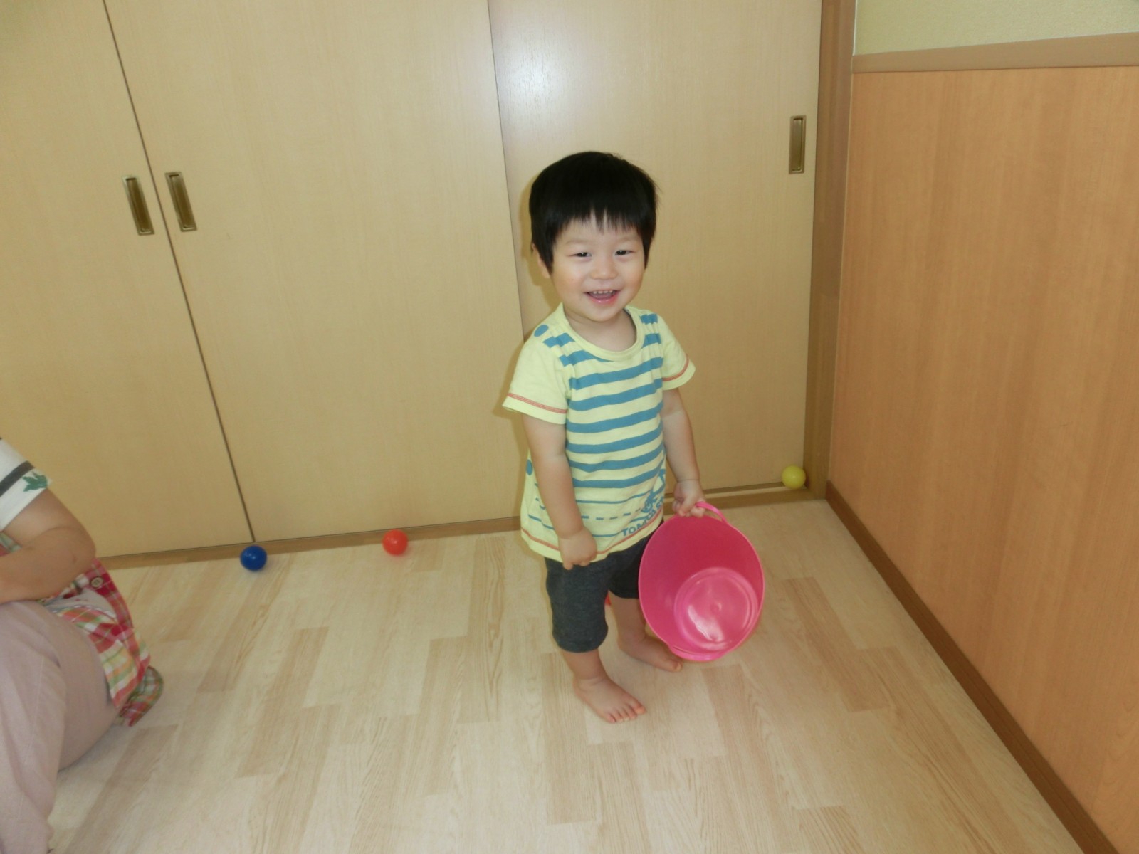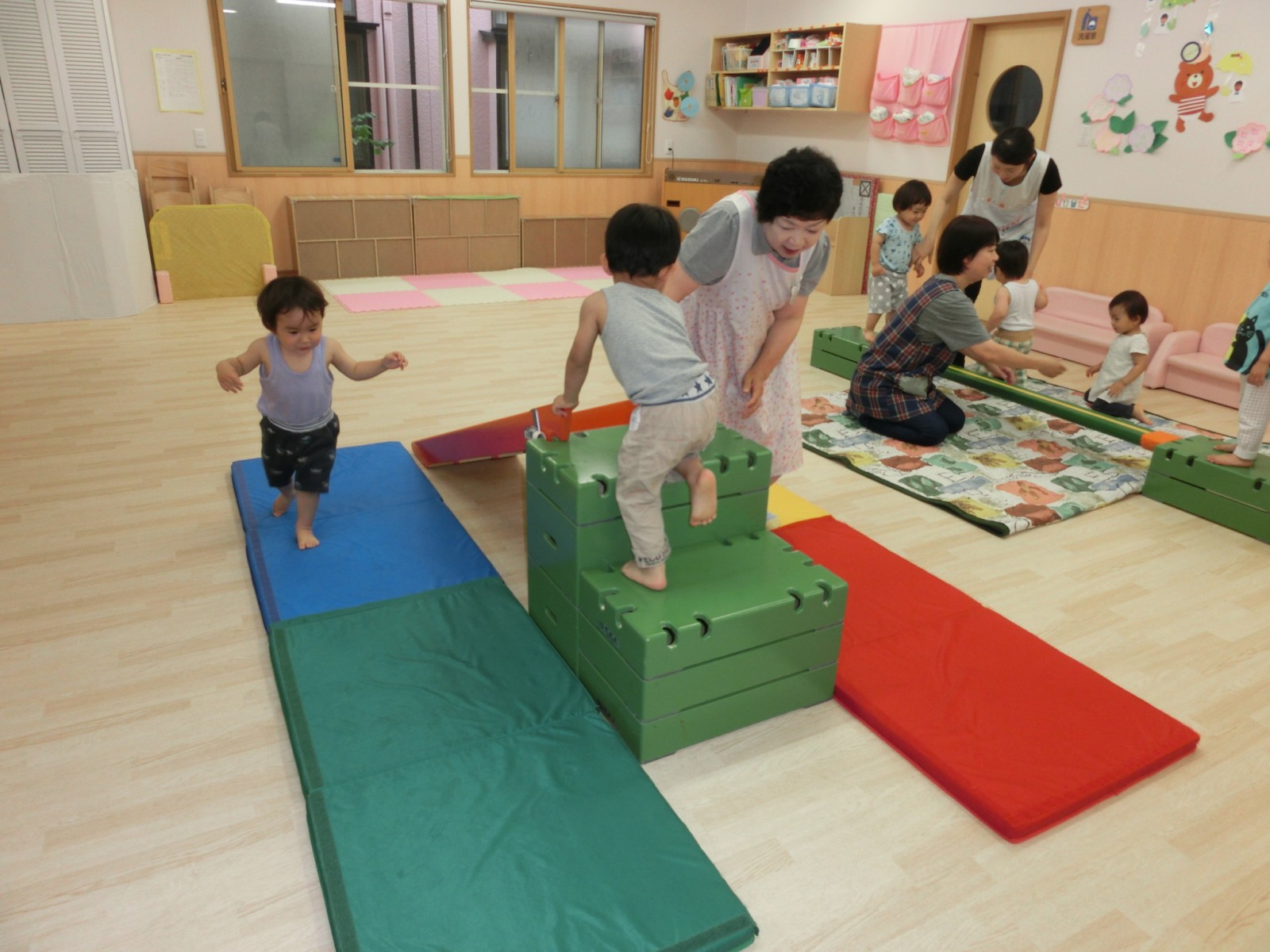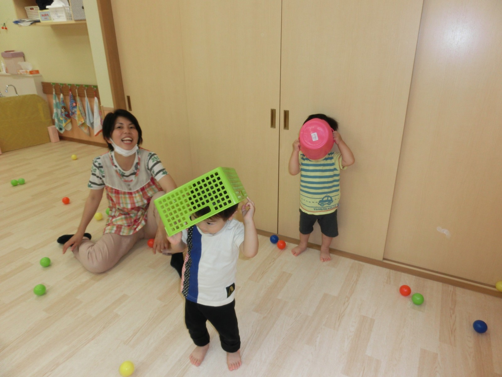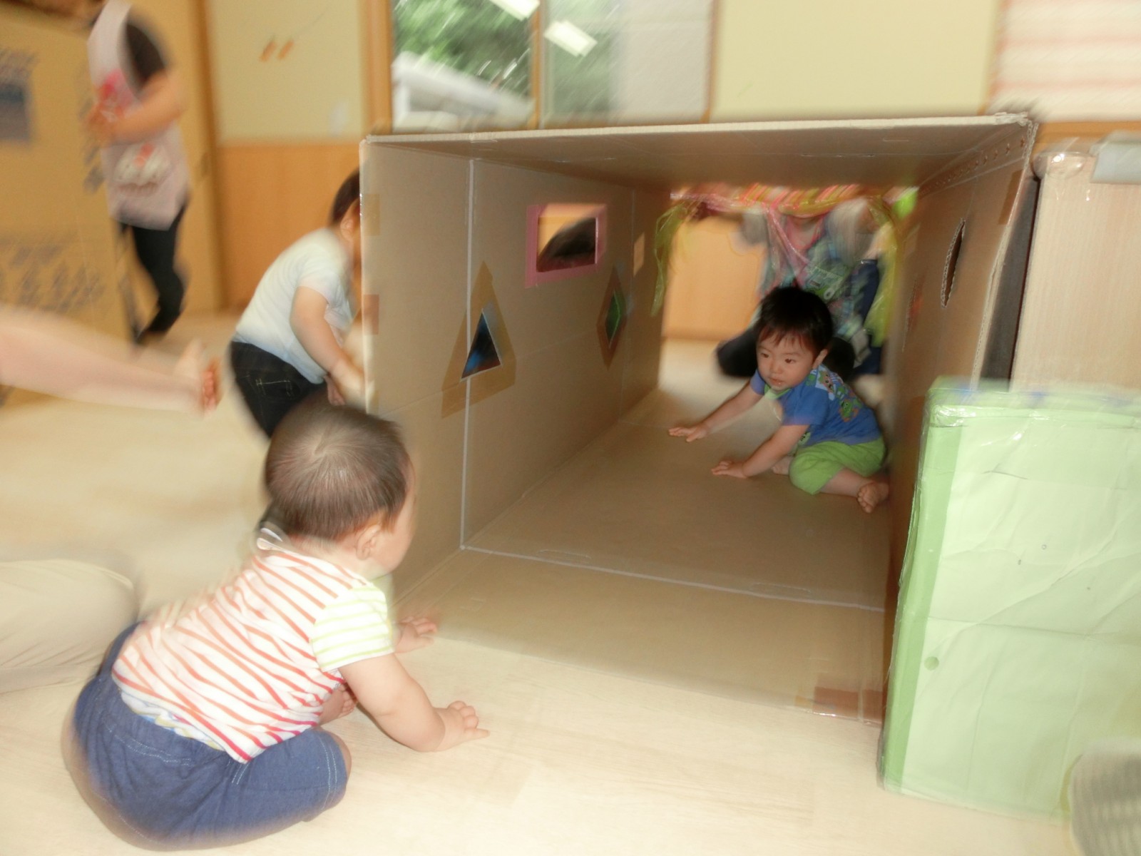 1歳児さんの部屋の遊びは、「いないいないバー」が大好き!一人がやっているとその笑い声にやってきてまねっこ、まねっこです。大きな手作りの段ボールトンネルも人気でおそるおそる入る子、中にはいり、途中のセロハンで出来た窓から外をのぞいたり興味がさらにわくようです。